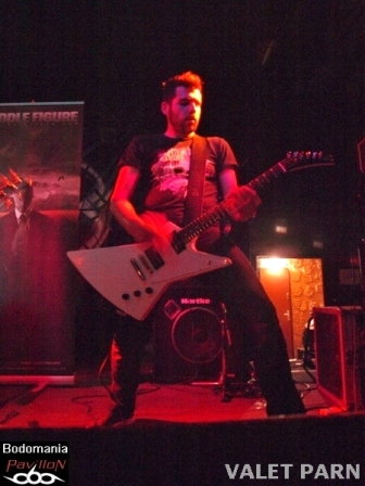 C'est le moment de se réhydrater. La pression est en panne. Elle n'était pas déjà en panne, il y a un mois? Tant pis, nous ferons sans. Quelques minutes pour comptabiliser les personnes présentes, et à l'arrivée du deuxième groupe, qui a pourtant fait quelques kilomètres pour arriver jusqu'ici, on ne peut pas dire que la salle se soit pleine. Arriveront-ils avant SEPTIC FLESH?... Suspense... Changement de registre donc, avec le Heavy Metal progressif de VALET PARN, qui contient des aspects mélodiques, groovy et rock'n'roll très marqués sur leur premier album intitulé "Riddle Figure". Cet opus paru en début d'année a été au passage, produit par un certain Fotis Benardo (que nous retrouverons derrière la grosse caisse de SEPTIC FLESH) et masterisé au Saint "Fredman Studios"… Que du beau monde! Leur première venue ici sera donc représentée par un court set, suivi par une fosse bien pauvre... Où sont donc passés les metalleux? Sûrement coincés dans les bouchons. Peu importe, le groupe se montrera non seulement très motivé, mais aussi très généreux sur scène. En particulier Steve Venardo, qui, mène son chant et le chauffage de salle d’une "voix" de maître. Le bassiste et membre fondateur, Stathis Ridis, occupe également très bien la scène, ajoutant parfois son grain de voix entre deux déplacements. Jimmy Haursen sera quant à lui, soutenu par le co-fondateur de VALET PARN, pour assurer les mélodies et envolées solistiques. (À noter que George Emmanuel officie également chez CHAOSTAR). Les morceaux s'enchaînent et bien qu’il n’y ait pas de révolution du genre, ce mélange Heavy Rock/Metal rejoint par des séquences instrumentales, progressives et mélodiques, s'avère très entraînant. De même que l’énergie communicative du groupe. Après l'envoûtant "Fear The Bullet", un refrain accrocheur et des rythmiques sonnées par Socratis Panagouleas sur "Till We Rise" viendront à leur tour stimuler le public. Au final, un second show dynamique et sympathique, qui aura bien réchauffé la salle. Une salle qui se remplit un peu. Enfin…