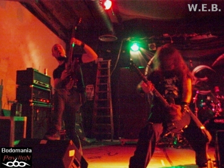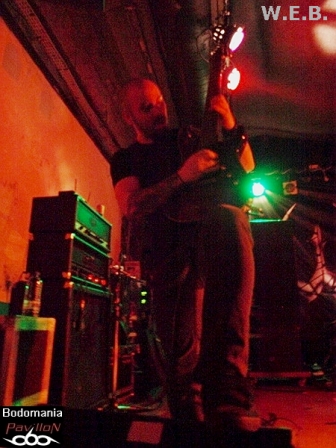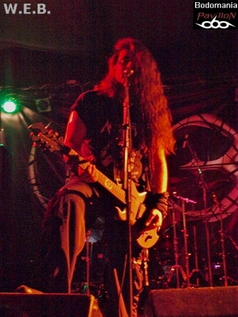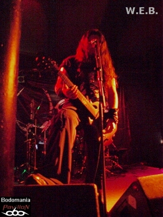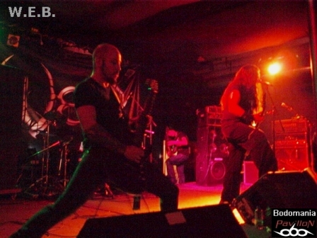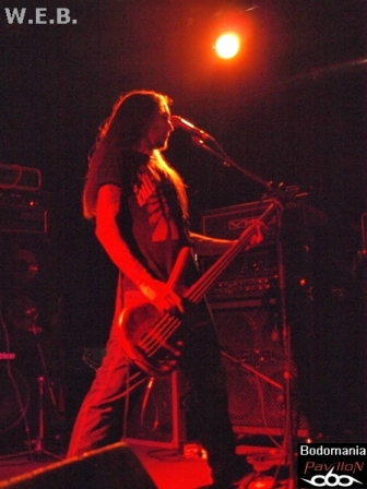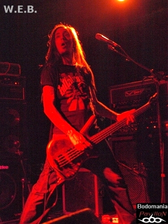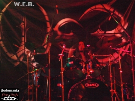 L'arrivée imminente de W.E.B. a surement du accélérer le temps, car quelques nouveaux venus envahissent la salle. Le décompte est lancé... Une très bonne surprise nous attend à présent, car si ce groupe né il y a 9 ans, n'est pas encore très connu par ici, ce concert va sans doute donner envie à bon nombre de se pencher sur leur musique. Deux albums se partagent l'affiche ce soir, "Don't Wake Futility", qui leur aura valu une tournée au côté de TO/DIE/FOR et enfin, "Jesus Heist", finalisé (encore) par Fredrik Nordstrom, dernière pièce d'une discographie prometteuse. Un genre Dark/Black Metal qui grâce à des compositions inspirées et une exécution très efficace, prend une autre dimension sur scène. Afin de mettre quelques notes sur l'univers des Athéniens, nous débuterons par un titre de 2005. D'inspiration gothique, porté au loin par une touche de piano, des riffs black agressifs et mélodieux, ainsi qu’une montée en puissance introduite par un sublime solo, "Embracing Darkness" réveillera les morts. Un esprit sombre et progressif que l'on retrouve sur l'aérien "Blossoms Cry", qui pousse l'aspect mélodique aussitôt renforcé par la force de frappe d'Alexandros. Malgré quelques soucis techniques qui viennent entraver la prestation, le groupe ne se démonte pas et ne s'économise pas non plus, d'ailleurs. Darkface poursuit ses poussées vocales sur l'electro et imposant "Destructive Intelligence". Il partagera ainsi les lignes de guitare entêtantes et robotiques avec Alan Fall, qui nous fera de nombreuses motivations de troupe en levant régulièrement son instrument. Il n'en faudra pas plus pour faire réagir le public, qui, bien que discret semble apprécier de déluge de rythmiques vicieuses toutes droit sorties du majestueux et tyrannique "Enthorned The Serpent". Une belle occasion d'entendre résonner les cordes groovy du bassiste présent sur cette tournée, Jon Simvonis. Le set se terminera comme il a débuté, par un ancien titre. "Cockroach" ferme la marche funèbre en nous délivrant une explosion de lignes electro thrashisantes. Un ultime morceau qui dévoile une fois de plus, le grand potentiel du groupe. Ce fut court mais bon! Le public n'est surement pas passé à côté de ce qui s'est révélé être une excellente découverte ce soir...
