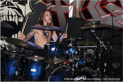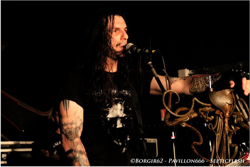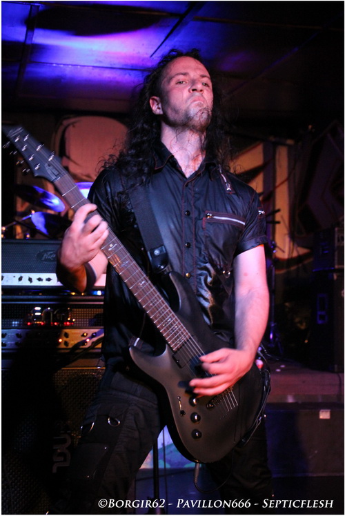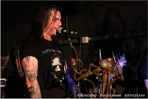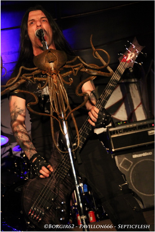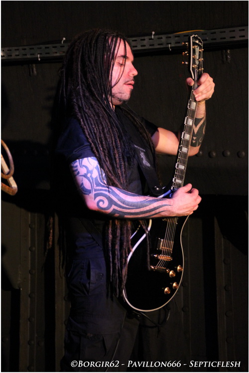 Après avoir assisté à une véritable mascarade niveau réglages sonores, j'étais plus que tendu à l'idée de voir SEPTICFLESH monter sur scène. Ces virtuoses nécessitent un son des plus carrés, et la légère appréhension du début de concert tenait désormais du stress. Pour recadrer un peu les choses, Septicflesh est actuellement en pleine tournée pour promouvoir son dernier chef d'oeuvre "The Great Mass" (et je n'exagère pas quand je parle de chef d'oeuvre). L'intro de "The Vampire Form Nazareth" se fait entendre, et c'est une salle fournie comme rarement à l'Igelrock qui accueille la tête d'affiche. Le charisme de Seth n'est plus à présenter, tant ce dernier est communicatif avec le public, et il ne se gène pas pour le démontrer une fois de plus. Sur ce premier morceau, le son fait déjà défaut, même si l'ingé-son sera, à ce moment là, celui de Septicflesh. Les samples peinent à se faire entendre, et ce sera une critique sur l'ensemble du show proposé. On atteindra même des sommets sur "Oceans Of Grey" avec les samples d'Iliana qui passeront presque aux oubliettes. En bordure de scène, le chant de Seth est des plus audibles, c'est une autre histoire quand on se rapproche du bar, où le son semble saturer (c'est donc une bonne raison pour rester au premier rang). "The Great Mass" et "Communion" sont bien représentés ce soir, et c'est avec énormément de plaisir que l'on retrouve des morceaux comme "Lovecraft's Death" et "We, The Gods". Ce concert sera également l'occasion de faire un grand bond en arrière puisque l'on peut saluer la présence de "Esoptron". Sur chaque morceau, la déception se mêle à l'incompréhension. Comment un tel groupe peut-il subir un tel son? Pour autant, on pourrait également se demander comment un groupe qui dois jouer dans de telles conséquences, fait-il pour impressionner tout son monde ? Car soyons honnête, le public est sous le charme, et un grand nombre de ces dames n'aura d'ailleurs d'yeux que pour Seth et Fotis (ça ne se cantonnera d'ailleurs pas uniquement aux dames, un grand nombre de "A Poils !" aussi stupides qu'inutiles émaneront de voix plus viriles). A l'exception de Seth, c'est tout un groupe qui impressionne. La chevelure de Cristos n'a d'égal que son talent et ce véritable génie reste trop souvent dans l'ombre de Seth (et je ne parle même pas du jeu de lumières, éclairant constamment ce dernier, au détriment de ses collègues). Le remplaçant de Sotiris alterne quant lui de gros headbangs et des regards très sombres, qui mettraient presque mal à l'aise. Heureusement, les deux guitaristes jouent à la perfection, le tout renforcé par la batterie surpuissante de Fotis. On approche tout doucement vers la fin du concert, et c'est le moment choisi par Seth pour s'adresser directement au public. Un discours touchant, nous rappelant l'attachement du groupe pour la France, notamment grace à Holy Records puis Season Of Mist... De là à dire qu'il s'agissait du même discours qu'il y a un mois à Chaulnes, je ne m'y risque pas, mais il y ressemblait curieusement, à un ou deux mots près... Mais l'important c'est l'intention n'est-ce pas ? Puis, le morceau que la majorité semblait attendre: "Persepolis" qui sera l'occasion de lancer un wall of death, plutôt bien suivi je dois l'admettre ! Comment pourrait-il en être autrement avec une telle merveille, venant clore le show ? Bien évidemment, un rappel est de rigueur et "Anubis" puis "Five-Pointed Star" feront office de bouquet finale. Un groupe comme on les aime, jouant avec le sourire aux lèvres, tourné vers le public.