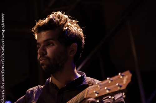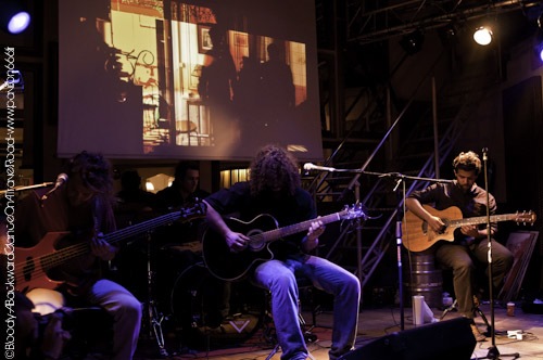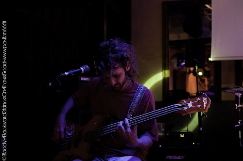 C'est devant un parterre clairsemé que le quatuor investi les planches du Saint des Seins. La foule profite encore de ce début de soirée assez chaud à l'extérieur du bar et dès que les premières notes de guitares acoustiques résonnent, le public commence à se presser à l'intérieur du bar afin de découvrir ce qu'il se cache derrière ce nom de groupe aussi long qu'inhabituel. A Backward Glance On A Travel Road est donc un quatuor composé de deux guitares acoustiques, une basse électrique et une batterie. Officiant dans un registre assez indéfinnisable mais propre à eux-mêmes, le combo est assez intriguant. S'amusant à mélanger les genres et à entrechoquer la diffèrence sonore de leurs instruments, le groupe va nous embarquer dans un endroit étrange mais famillier à la fois. La musique de ABGOATR ressemble à une terre désolée sur laquelle chaque spectateurs y construira sa propre histoire. Voir la facon avec laquelle ils installent les atmosphères et tout simplement ahurissante. Même si ils sont très (très) timides, il n'auront pas besoin de parler beaucoup pour envouter un public curieux et qui; pour la plupart ne s'attendaient pas à une première partie d'aussi bonne facture. Leur mise en scène est d'autant plus soignée que leur musique. Un grand écran diffusera des images très complexes à comprendre mais force est de constater qu'elles illustrent à merveille l'univers de ABGOATR. Au bout d'une demi heure de set le quatuor reste toujours aussi discret et l'audience continue encore de se familiariser avec cette musique qui ne présente aucune limite. D'un coté, le duo acoustique met du coeur à l'ouvrage pour creér une ligne directrice folk alors qu'à leur gauche se situe un bassiste tout droit sorti d'un groupe de metal pur et dur. L'autocollant du groupe Death sur sa basse ne nous contredira pas. Même si il contraste grandement avec ces acolytes, il ne vas pas pour autant jouer des partitions de bourrins mais va faire gronder sa basse sur des rythmes alambiqués et plutôt décalés vis à vis de ses comparses. Tout aussi original dans son style musical, le batteur correspond à la touche de violence du groupe. Loin de nous servir des rythmes simples et discrets, il va servir des compositions très innatendues commes ces parties de double grosse caisse qui ont surpris pas mal de monde. Mais comme A Backward Glance On A Travel Road a plus d'un tour dans son sac, une reprise de "Porque Te Vas" sera jouée et bien sur remportera l'adhésion totale du public. Au bout d'une heure de set, les Montpellièrains se retireront de la scène très maladroitement car la timidité n'ont pas vraiment joué en leur faveur. C'est à peine si le nom du groupe a été prononcé à la fin du show ! On retiendra la dernière phrase du leader : "Si vous voulez discuter avec nous ou même acheter notre album, le coin marchandise se trouve la-bas." le tout bien sûr, sur un ton très timide ce qui rend le propos très marrant. On aurait dit que le groupe en était à son premier concert alors qu'il a beaucoup plus d'expérience que cela. Malgré cette timidité (assumée ?) ce groupe a livré une très bonne prestation car officier dans un registre pareil sur un terrain inconnu et surtout réussir de la sorte, chapeau bas ! A Backward Glance On A Travel Road est un groupe à retenir car on risque d'en entendre parler dans un futur proche.