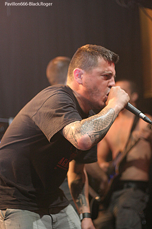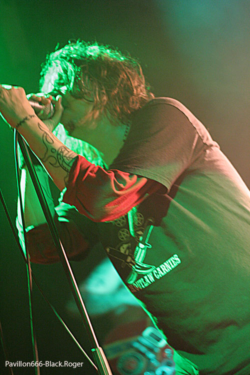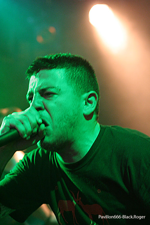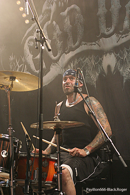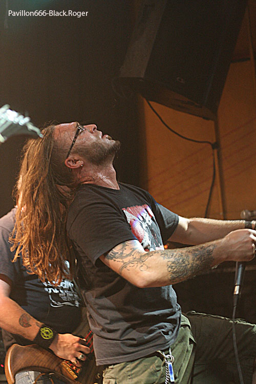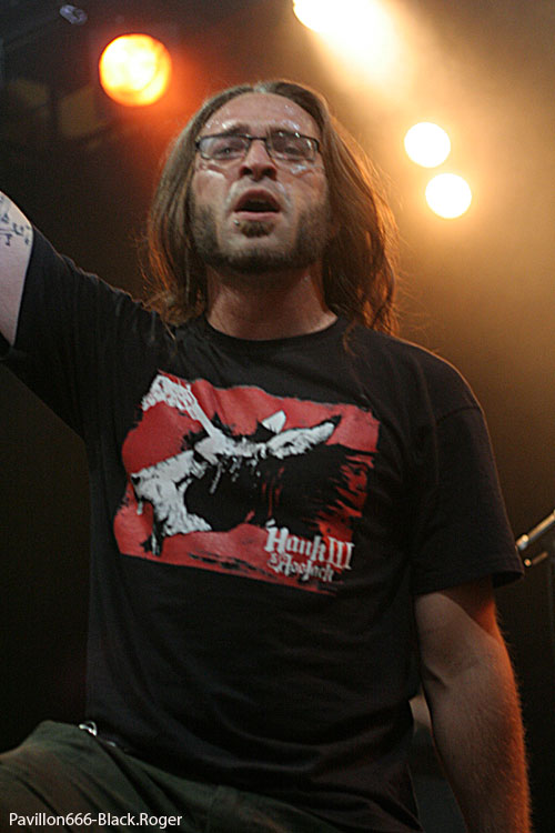 A peine sorti de ce rêve éveillé où l’on a pu entrevoir des « éléphants roses », voici devant nous EYEHATEGOD qui lance un larsen avec musiciens statiques prêts à nous renvoyer dans nos tombes. Petit à petit le déluge sonore envahit la salle, Michael William avec sa voix écorchée et maladive s’accroche désespérément au pied du micro sans pouvoir s’évader de ses cauchemars qu’il veut nous faire partager. Au travers de la fumée, le guitariste impressionnant nous fait partager des riffs à nous donner « la chair de poule », à nous donner la frousse, la basse soutient l’édifice avec des lignes énormes, copulant avec une batterie impressionnante de tempos lourds et déments. Le tout, c’est une musique poisseuse, crade, vicieuse et même dangereuse, c’est le sludge sorti des bayous de Louisiane. ça pue l’eau morte, le bourbon de contrebande, la folie ordinaire, c’est doom, fortement doom et intense. Sur scène on enlève les masques, on fume, on boit du gros rouge « qui tâche » ou du rosé, ou même autre chose… Après chaque titre on croit que le groupe va mourir la devant nous, puis tout repart sur un nouveau morceau. Ceux de la Nouvelle Orléans ne sont pas avares de compositions et d’improvisations, ici pas de frime, pas de set millimétré commercial. Quelle ambiance, quelle démence, quelle musique prenante qui nous remonte les tripes. Et puis tout finit comme cela avait commencé, par un larsen qui s’estompe progressivement, lentement. Enorme tout simplement, « où suis-je ? », « que fais-je ? », « dans quel état j’erre ? », on se le demande après ce voyage initiatique.