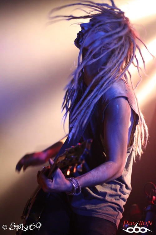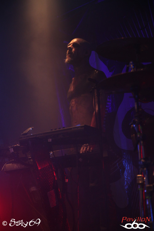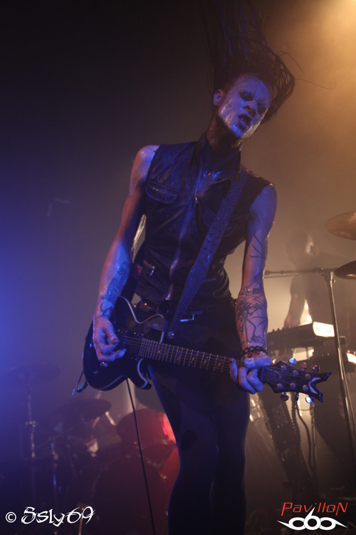 L'installation du materiel de COMBICHRIST étant déjà effectué, le changement de plateau se fera rapidement. A peine la formation est entrée sur scène que le public manifeste son contentement, en effet, le groupe a acquis une notoriété qui lui permet d'avoir un public de plus en plus fidèle. Etonnement ce soir pour beaucoup, en effet, la formation accueille en son sein un nouveau membre en la personne de Abbey Nex, ancien membre Psyclon Nine, qui s'occupera d'ajouter la guitare au son du combo. Le set commencera très fort avec le fameux et incontournable "Shut up and swallow" qui nous laissera comprendre que l'ajout de guitare s'intègre parfaitement, ce qui sera le cas tout au long de la soirée. Les sets de percussions et le clavier se trouvant au fond de la scène, Andy et Nex auront tout le loisir d'occuper les devants, le show est donc de suite très énergique, et la fosse s'en retrouve comblée. La setlist verra entre autres passer "Throat full of glass" qui recevra un bon accueil, mais aussi "Fuck machine" et "Blut royale"qui auront un effet devastateur. Devastateur sera d'ailleurs le mot qui pourrait englober la totalité du show, avec un exemple de ce que peut être une scène à la fin d'un concert d'énervés, on verra Joe Letz démonter sa batterie pour aller poser un de ses fûts sur le public afin de jouer le rappel, au moins on ne pourra pas dire que le public n'aura pas participé!