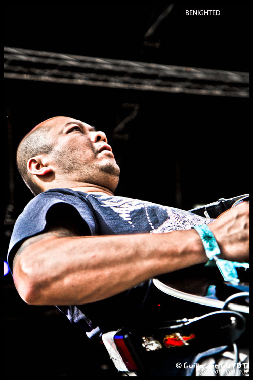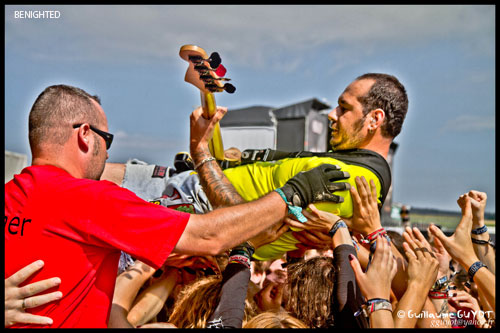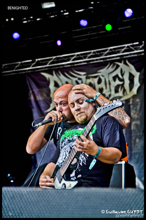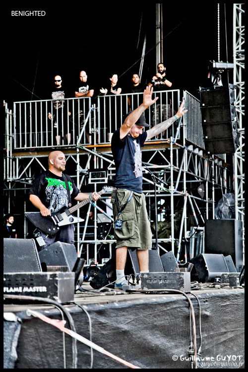 Venons-en enfin à l'aspect artistique du festival sans nous appesantir sur les détails techniques. La plupart des groupes avaient sorti récemment un album, par ailleurs il est assez aléatoire de nommer une formation tête d'affiche qu'on dirait "mythique" ou "légendaire" en France , du type MOTÖRHEAD , JUDAS PRIEST , IRON MAIDEN ou SLAYER , entre autres. Sur le plan des concerts proprement dits , je retiendrai DECAPITATED , les death-métalleux polonais , ovationnés par le public , de retour après l'épreuve qu'ils ont subie en 2007 , Vogg est toujours aussi charismatique, les jeunes de HACKNEYED (death, Stuttgart) qui évoluent désormais dans la cour des grands , groupe original et créatif , EXCREMENTORY GRINDFUCKERS , comme leur nom l'indique! ABORTED ,bien connus et appréciés chez nous , IN EXTREMO ,Pagan metal issu de l'ancienne RDA, un groupe et un style très populaires Outre-Rhin , et surtout MARDUK , rare groupe de black-metal présent au Summer Breeze 2011.C'était la soirée du jeudi 18. Le vendredi 19 réservait quelques bonnes surprises, comme FACEBREAKER (death, Suède), HELRUNAR (BM), MAD SIN (Psychobilly, Berlin). ATHEIST a été remplacé par VICIOUS RUMORS. On a pu applaudir ENSLAVED, TURISAS, KATAKLYSM, AMORPHIS (prochainement à Lyon). Pour moi, la tête d’affiche, s'il en fallait une, c'est bien BOLT THROWER en grande forme, spectacle garanti, sur scène et dans la fosse. HAMMERFALL , les Suédois bien connus chez nous, dont la tête pensante s'est permis de déclarer qu'il préférait jouer en Allemagne plutôt qu'en France ! (Quelques sifflets) obtiennent un succès indéniable. Le samedi 20, quelques dizaines de Français enthousiastes s'étaient regroupés devant les barrières de la Main Stage à 11h35 pour applaudir les Stéphanois de BENIGHTED, qui jouaient au Summer Breeze pour la deuxième fois, quel honneur, quel plaisir! Egaux à eux-mêmes, déclenchant pogos, wall of death, les Foréziens n'ont joué qu'une demi-heure, à un horaire guère favorable, mais un petit frisson d'émotion a traversé leurs fans français qui ont conclu le set en entonnant "La Marseillaise". Rappelons que BENIGHTED entretient une relation particulière avec nos voisins germaniques. Bon vent à nos amis de la Loire ! On a droit ensuite aux punks US de TOTAL CHAOS vus récemment à Lyon, malheureusement pour eux, il y a peu de punks dans le public. Bon set, mais des réactions un peu molles, dommage! Sous le grand chapiteau défileront tour à tour des groupes prometteurs déjà connus, comme ADEPT (post-hardcore, Suède), SWASHBUCKLE (thrash, US), les excellents OBSCURA (death technique) qui jouent ici "à la maison", les Berlinois de CORVUS CORAX (folk médiéval), vus au Lyon's Hall il y a quelques années nous gratifient d'un magnifique spectacle couronné d'un grand succès, ils sont tellement atypiques avec leurs instruments, puis viennent les Américains de AS I LAY DYING (métacarpe chrétien) qui font un très bon set, on pourra les voir fin octobre à Saint-Etienne avec AMON AMARTH. L'heure tourne, le timing est strict. Arrivent maintenant les populaires CALIBAN avec leur frontman charismatique au contact facile, Andy. Ils pratiquent un metalcore très original qui ne plaît pas à tout le monde, notamment leur dernier EP "Coverfield" durement critiqué par certains" spécialistes."Originaires d'Essen dans la Ruhr, ils sont manifestement populaires dans leur pays, au point de provoquer des circle-pits à la limite de l'hystérie. Les Lyonnais se souviennent de leur concert au Marché Gare en mai dernier.