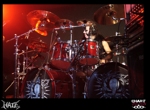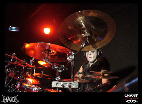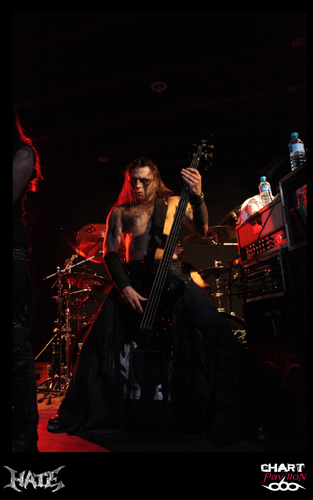 HATE, enfin ! Il est 23h 30. Ils sont quatre, dans une tenue vestimentaire moins soignée que celle de leurs concitoyens de VESANIA, c'est peut-être un détail, mais dans ce contexte, non négligeable. HATE est, comme chacun sait, un groupe de black-death metal, formé en 1990 dans la région de Varsovie, au lendemain de la chute du Rideau de Fer et du Mur de Berlin, il a connu au cours des années plusieurs changements de line-up. Adam, le chanteur-guitariste, lui, est là depuis le début, ses actuels collègues depuis 4 ou 5 ans seulement. Leur album le plus marquant s'intitule "Erebos" (2010). Le sort s'acharne ce soir sur les "black-métalleux", il faut en effet régler tout de suite un problème de son... Adam a une voix qui s'apparente étrangement à celle de Nergal, elle transperce les tympans. La haine est mise en scène -HATE oblige - dans un contexte glacial et ténébreux, mais c'est efficace. Cheveux longs, sueur ruisselant sur les torses nus, les Polonais de HATE tentent de faire passer une émotion dans cette ambiance austère. Est-on sûr qu'ils y soient parvenus ? Pour quelques inconditionnels, oui. N'est pas VADER ou BEHEMOTH qui veut, et pourtant HATE a vingt ans d'expérience ! Une séquence instrumentale va s'insérer dans la dernière phase du set, lequel s'arrête brutalement au bout de 40 minutes, sur un "Thank you!" furtif. Le quatuor a accompli sa mission et quitte précipitamment la scène. Sans commentaire. C'est dommage. J'avais hâte de découvrir ce groupe. Disons que je l'ai découvert dans un mauvais jour, ce qui ne remet pas en cause son réel talent.