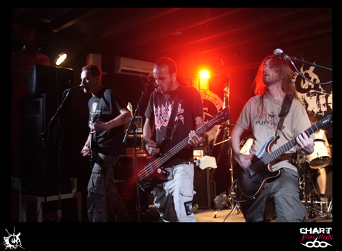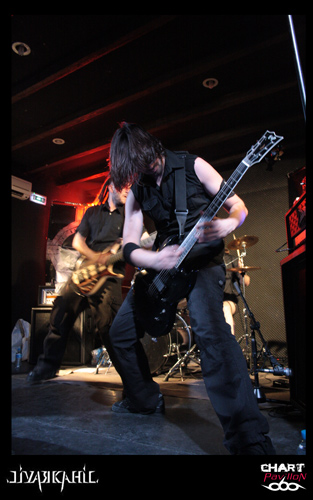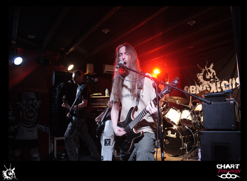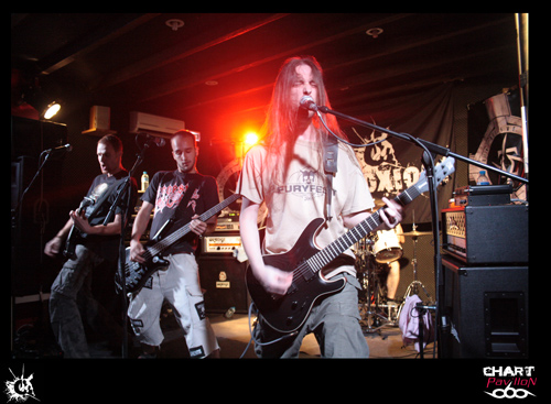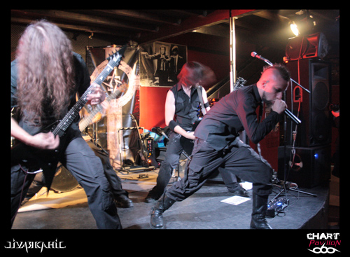 A 20h 45, ce sont les Franciliens de LIVARKAHIL, dont on parle beaucoup depuis quelque temps, qui vont investir la scène du Warm Audio. Leur dernier album en date "Signs Of Decay" est sorti la veille du concert sous un flot de commentaires flatteurs. Les cinq musiciens tout de noir vêtus sont tous affublés d'un pseudonyme, on remarquera en particulier HK, leur chanteur talentueux et charismatique, portant petite crête et cravate noire. Une certaine froideur, une rigueur toute militaire, caractérisent ces Parisiens spécialistes du death-thrash metal, sombre et brutal. On ne peut s'empêcher de penser à BEHEMOTH en écoutant LIVARKAHIL, efficace, puissant, délivrant un son énorme, lourd, pesant, "dark" et écrasant, au point de créer à la fin du set une ambiance quasi religieuse, d'ailleurs leur album-concept traite de "l'autocratie religieuse". La phrase suivante, qui n'est pas anodine, figure en fond de scène: "I tell the truth - Believe in God !" HK descend dans l'arène, remonte aussitôt sur les planches, s'agenouille...,se relève, il a besoin d'espace pour donner toute sa mesure. C'est le headbanging incessant dans les premiers rangs - un silence, puis une jolie conclusion instrumentale et théâtrale lorsque les cinq musiciens au garde-à-vous regardent, l'espace de quelques secondes, le public médusé. Bon son, bonne prestation, bonne présence sur scène...Aucune raison d'être déçu par ce set de 45 minutes. "Les frères d'armes", comme ils disent, avaient déjà laissé un bonne impression lors de leur passage à Mâcon l'hiver dernier, où ils avaient joué des morceaux de leur album de 2008, "First Act Of Violence".