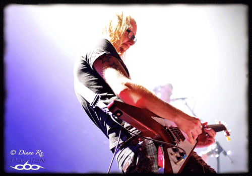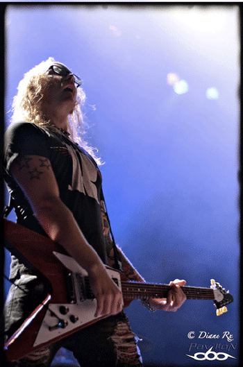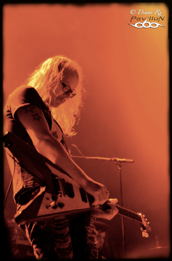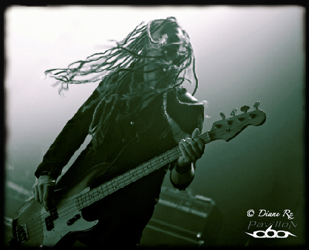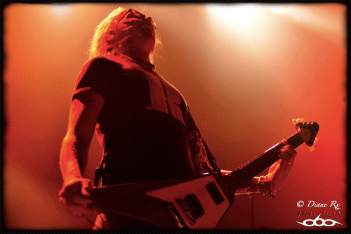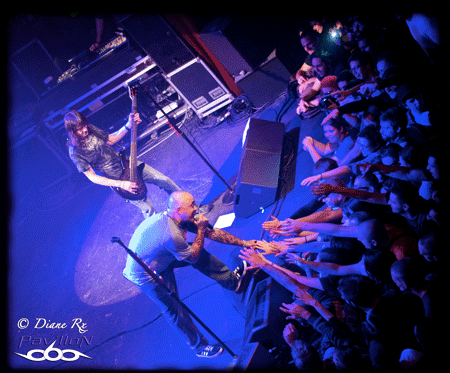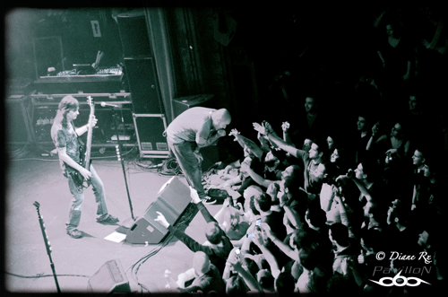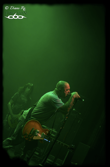 Si la salle est donc bien remplie, la température a peiné à monter le long de ce show, et la jeunesse du public y est pour quelque chose –allez, j’assume, je me suis sentie vieille à 24 ans là-dedans. Il faut en effet attendre le 6ème titre joué ( !), Crawl, pour que l’on entende enfin la foule crier de nouveau et que quelques pogos se dessinent au milieu de la fosse. Point positif : la tension ne redescendra pas, et j’aurai même la surprise d’observer depuis le balcon un slam de plus de 10 secondes sur So Far Away…une ballade. Oui mesdames messieurs, une ballade ! Pas une seule fois les cornes du métal ne se dessineront sur les poings levés, réduits à un doigt dressé curieusement orphelin pour mes yeux habitués aux concerts où les deux doigts du milieu sont constamment repliés. Si la setlist est donc orientée très métal, le public, lui, ne le confirmera pas toujours. Cela dit, Mudshovel, autre tuerie du concert, viendra clôturer la première partie du set avec sa magnifique intro de basse –oui j’en fais, comment avez-vous deviné ?- et son mid-tempo lancinant purement « staindien », créant les plus gros pogos de la soirée – comprendre 15 personnes parmi un gros millier.