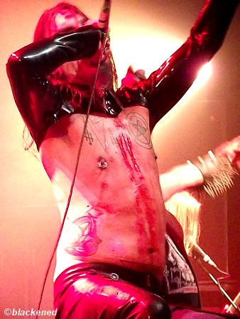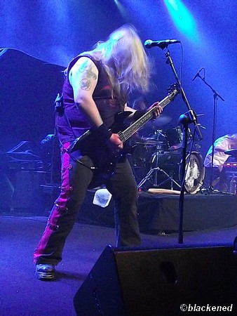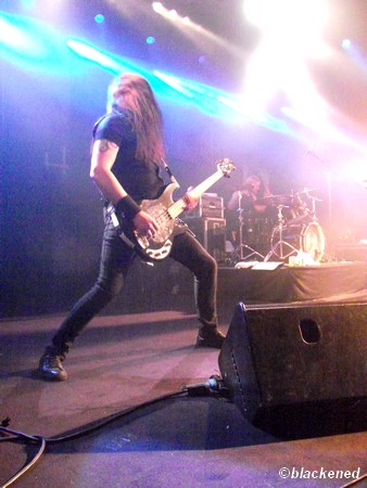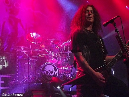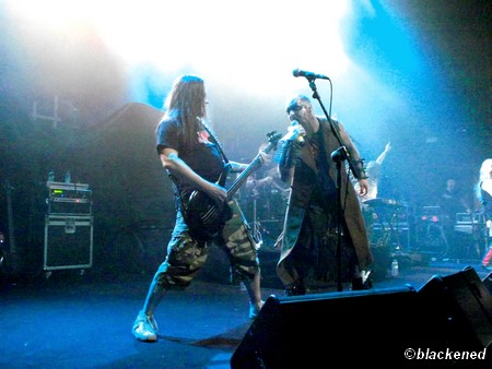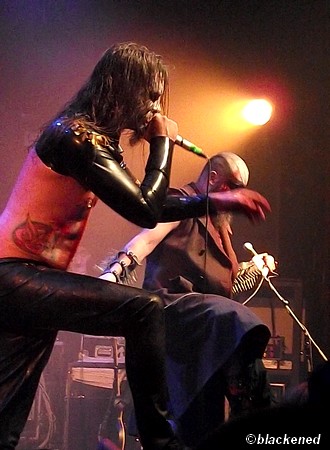 C’est avec un léger retard que TURMION KÄTILÖT ouvre le bal. Les Finlandais sont réputés pour délivrer des prestations scéniques complètement barrées, mêlant sexe, sadomasochisme, voire automutilation. Cependant rien de tout cela ce soir, les six trublions n’iront pas aussi loin dans la provocation. Peut-être la peur d’être incompris par le public français, ou question d’autorisation (cela impliquerait sans doute une interdiction du concert aux moins de 18 ans) ? Quoi qu’il en soit, le show de ce soir sera tout de même assez fendard. Visages et corps maquillés, costumes latex, accessoires divers (comme une baguette de pain ou des courgettes… logique, nous sommes en France !), le combo s’en donne à cœur-joie au niveau de l’exubérance, le plus démonstratif étant Spellgoth, l’un des deux chanteurs. Ce dernier, vêtu d’un pantalon de cuir et d’un boléro vinyle laissant nue sa poitrine tatouée et maculée de faux sang ne tient pas en place tout en éructant ses parties vocales, quand il ne pose pas aux côtés de son collègue-brailleur MC Rakaa Pee, maître de cérémonie de ce soir arborant fièrement longue veste brune et bracelets à pointes. Le guitariste du combo ne ferait pas tâche au sein de TURISAS avec son corpse-paint rouge et noir. Au niveau musical, TURMION KÄTILÖT délivre une espèce d’électro-indus aux (faibles) accents metal, uniquement perceptibles (en live du moins) aux cris et aux quelques relents de distorsion de la guitare. Le DJ du groupe balance des parties techno aux rythmes samplés largement surmixés en façade, à tel point que la batterie acoustique de ce soir en perd presque son utilité. Les morceaux des Finlandais se ressemblent énormément, donnant réellement dans une techno de rave-partie étrange, et ne convainquent pas pour un sou l’amateur de musique que je suis. Il faut dire que je n’apprécie que très modérément la musique électronique, ce qui biaise peut-être mon jugement. L’avis du public semble également être partagé, une bonne moitié de la salle semblant être attentiste vis-à-vis de la prestation du groupe. Peut-être qu’un mixage moins étouffant donnant plus de place à la batterie et aux guitares aurait pu changer la donne, mais l’écrasante omniprésence des samples techno aura raison de l’intérêt que je peux prêter au groupe. Moment fun tout de même de ces trente minutes de show, l’arrivée surprise sur scène de Peter Tägtgren himself, en slip ( ! ) et collant de grand-mère sur la tête, venu pousser quelques cris en compagnie des deux chanteurs de TURMION KÄTILÖT. Le Suédois, qui a visiblement abusé de la bonne bouffe (ou de la bière) ces derniers mois au vu de son ventre et ses bras grossis, n’en loupe décidément pas une lorsqu’il s’agit de délirer ! Prestation énergique mais musicalement spéciale pour un groupe qui se classifie tout de même sous l’appellation « metal », ce qui ne me semble pas approprié ici pour le coup…