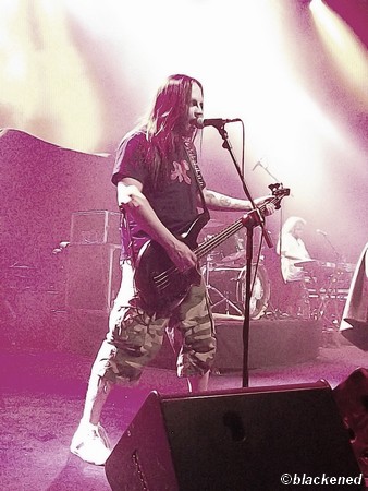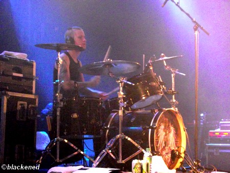 Laissons désormais place à ce pourquoi la masse du public est venue ce soir : PAIN. Et le groupe a prévu de gros moyens pour cette tournée : décor imposant avec son backdrop aux couleurs du dernier album, 4 écrans plats, jeu de lumières bien ficelé et efficace… Le premier titre interprété met de suite à l’honneur le dernier album des Suédois « You Only Live Twice », puisque c’est "Let Me Out" qui remue une Laiterie bien fournie pour l’évènement. PAIN est en forme ce soir, à en juger les sourires et les décrochages de nuques que s’infligent les trois cordistes présents sur scène. Peter Tägtgren est quelque peu imbibé, mais offre une prestation convaincante vocalement, même s’il oublie quelques paroles de temps à autres. La plus récente livraison du combo semble être déjà bien assimilée par les fans puisque des titres comme "Dirty Women" ou "The Great Pretender" sont hurlés à gorges déployées. PAIN n’en oublie pas pour autant ses classiques, avec des titres comme "Psalms Of Extinction" ou "Dancing With The Dead", éponymes des albums du même nom. "Suicide Machine", "I’m Going In" ou "Monkey Business" sont autant de morceaux indispensables au set des Suédois, qui peut piocher dans sa discographie fournie de sept chapitres. Tägtgren lâche souvent sa guitare pour ne se concentrer que sur le chant, sans que cela ne manque réellement dans le mixage en salle, qui offre une fois de plus la part belle à la bande-son samplée. Le guitariste Michael Bolhin est souvent en proie à des erreurs dans son jeu, mais ce n’est que très peu remarquable au niveau du son en salle (étrange ?). Andre Skaug assure par contre comme s’il avait toujours fait partie du combo, en proposant un jeu de scène d’excellente qualité. Ses cheveux ne manquent pas de tourner et sa mobilité sur les planches en font un spectacle à lui seul. Le jeu de lumière impeccable est également à souligner, l’impact visuel du groupe n’en étant que renforcé. Le public est très réactif aux sollicitations de Tägtgren, qui invite même sur scène deux fans pour interpréter l’un des morceaux (je ne me souviens plus duquel) en live avec le groupe ! Belle récompense pour ces amateurs du combo qui après avoir embrassé Peter finissent en slam dans la fosse. L’ambiance est bonne-enfant, et le frontman ne boude pas son plaisir à remercier le public au bout de 55 minutes de show, lorsque le groupe quitte la scène en même temps que les lumières s’éteignent. Petite respiration bienvenue, les morceaux de PAIN sont tout de même très similaires, rythme régulier avec peu de variations, refrains mélodiques assez faciles mais efficaces qui découpent des couplets souvent moins amples et fournis. Certains commencent à s’interroger sur la durée du concert, mais évidemment, PAIN n’en a pas fini, et revient pour un rappel haut en couleur. Tabourets vissés au sol, batterie miniature sur la droite, lumière tamisée, le groupe vient interpréter un très bon "Have A Drink On Me" au cours duquel Tägtgren utilise une Fender Stratocaster et un bottleneck dans des mélodies au bon parfum sudiste. PAIN offre encore au public quatre titres après celui-ci, dont les indispensables "Same Old Song" et "Shut Your Mouth", les deux plus grands hymnes industriels du groupe. David Wallin en profite pour démontrer qu’il n’est pas seulement bon à battre un rythme martial et simple comme il l’a fait tout au long du concert. Son final puissant lui permet d’utiliser enfin sa deuxième grosse caisse quasiment délaissée jusque là. Presque une heure trente de show, et le public en redemande encore en hurlant « We want more ». Tägtgren regarde ses camarades de jeu, se concerte avec eux puis balance un "Bye / Die" initialement non prévu à la set-list qui ravit une dernière fois les fans.