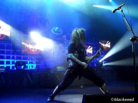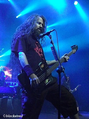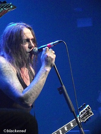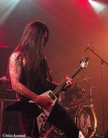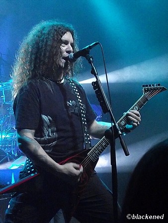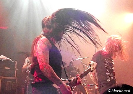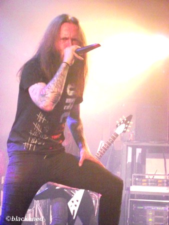 Quarante minutes sont désormais allouées à ENGEL qui vient nous présenter son deuxième album « Threnody ». L’autre groupe de Niclas Engelin, « nouveau » guitariste d’IN FLAMES en remplacement de Jesper Strömblad délivre une prestation des plus convaincantes. Son metal industriel teinté d’une petite touche « death mélo » à la suédoise pas désagréable fait mouche pour une Laiterie de plus en plus chaude. Les riffs énergiques et efficaces des Suédois sont bonifiés par la bande-son défilant en arrière plan sonore. La performance vocale du frontman Mangan Klavborn est excellente, tant en chant clair lors des mélodies qu’en crié pour les parties les plus énergiques. Si la sauce met quelques minutes à prendre, le public se lâche enfin, répondant aux sollicitations du frontman dont l’énergie est à revendre. La section rythmique est efficace et carrée, le jeu du batteur intégrant pleinement les codes de l’indus, avec des attaques franches de ride (prise pour une crash comme à l’habitude des frappeurs officiant dans ce registre) et des martèlements simultanés de grosse caisse et caisse claire. Cette dernière ne ressort malheureusement pas suffisamment en façade, il faut alors observer les gestes de Daniel Moilanen et deviner son découpage rythmique. Le headbang est de rigueur sur scène pour la paire de cordistes (semble manquer à l’appel le deuxième guitariste du combo) aux cheveux longs et noirs, sur un titre comme "For Those Who Will Resist" qui met tout le monde d’accord. Belle découverte pour ma part, et visiblement pour une bonne partie du public, ENGEL a assuré ce soir et a sans doute recruté quelques nouveaux membres de sa fan-base !