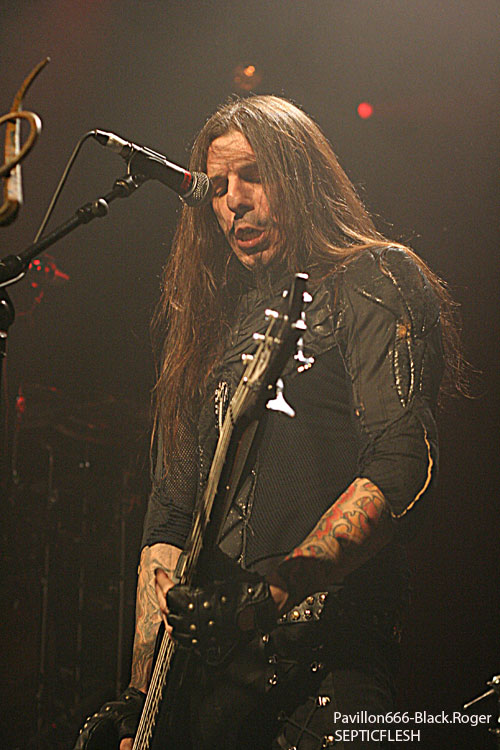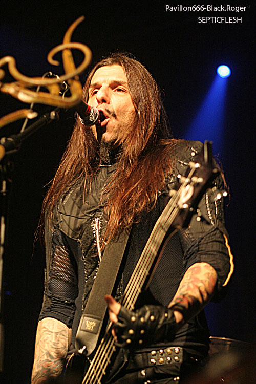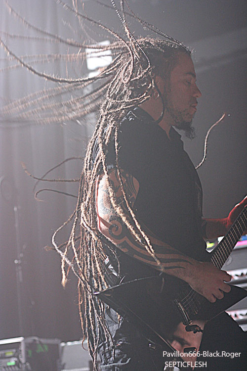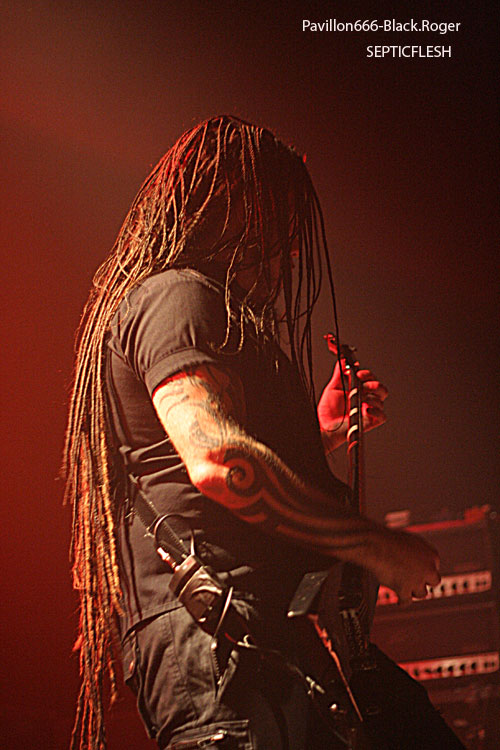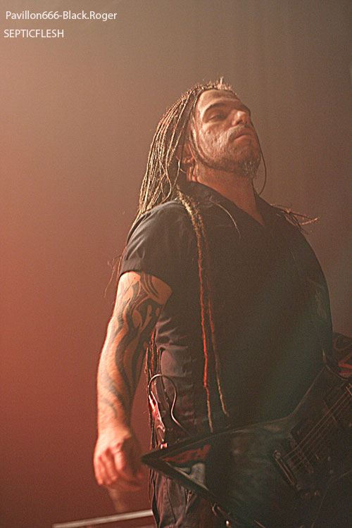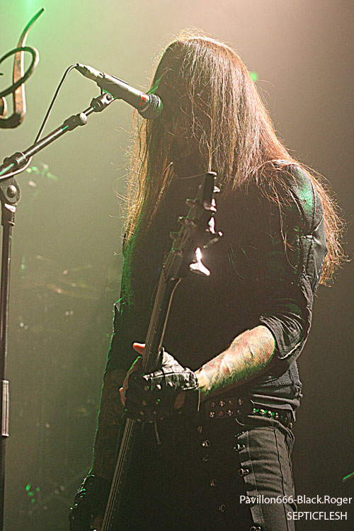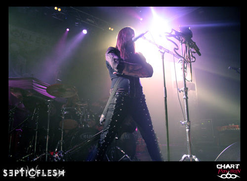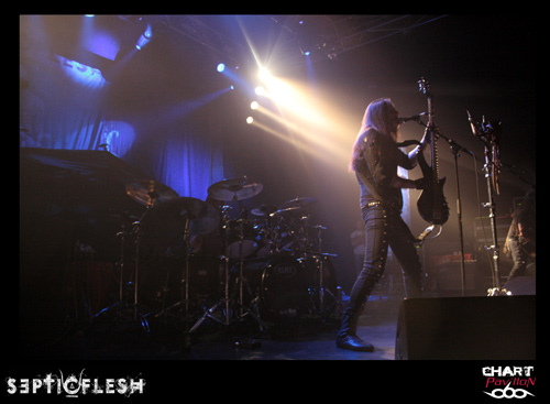 Toujours en promotion pour leur album « The Great Mass », ce sont les grecs de SEPTIC FLESH qui ouvrent la soirée. Le groupe était déjà venu dans la région en mai, à Lyon au Marché Gare pour être précis, défendre leurs nouveaux titres. Cette fois-ci, la formation est passée de tête d’affiche à groupe d’ouverture avec un set forcément réduit et fortement axé sur des titres récents. Le problème qui se pose avec SEPTIC FLESH en concert, c’est la présence de beaucoup de parties enregistrées. Du coup, retranscrits en concert les morceaux perdent assez régulièrement de leur dynamisme. C’est assez regrettable pour ce groupe car la présence des musiciens est bonne, les morceaux sont intéressants mais l’ensemble manque quelque peu de force. Et pourtant, les nombreuses personnes déjà présentes ne semblent pas réellement perturbées par ces quelques petits défauts. On sent déjà une bonne ambiance dans la salle, comme quelque chose d’électrique et de réellement particulier. Dommage que SEPTIC FLESH n’ait pas un peu plus profité de cet atout, soit communiquer un peu plus avec le public qui ne semblait attendre que ça.