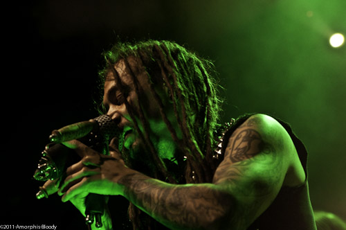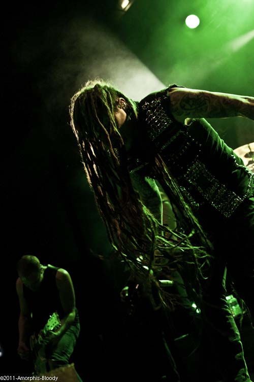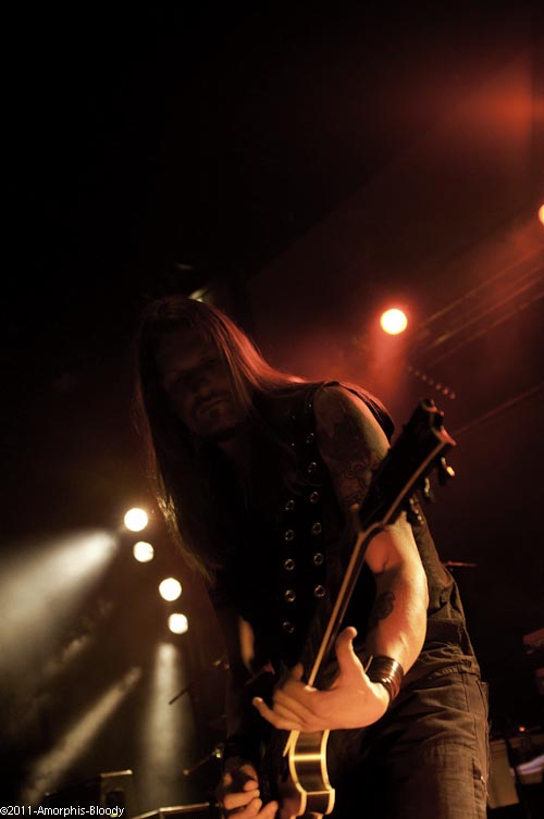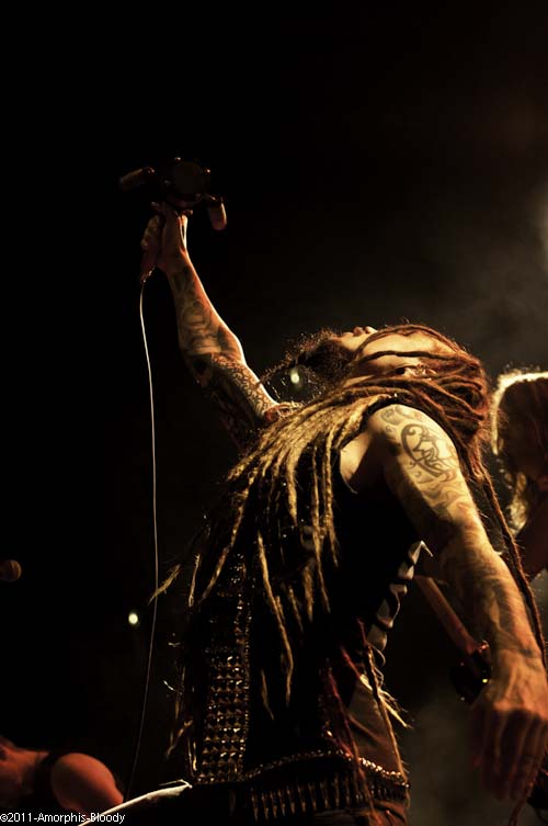 La préparation commence à se faire longue pour les die hard fans du combo finnois qui se sont rués en masse sur le devant de la scène. On patiente comme l'on peu en regardant l'étrange pied de micro de Sieur Joutsen qui flirte avec l'univers steampunk... L'intro de leur dernier album resonne tandis que les musiciens se mettent en place sous un tonnere d'applaudisement. Pas de doute, même si le public est restreint il a sacrement envie de voir le combo Finlandais. Et c'est par ailleur une très bonne ambiance qui résidera le long du set. Chaque génération fera sentir ses préférences. On trouvera donc les plus anciens donner de la voix sur des titres tels que "Sampo " ou "The Smoke" et les plus jeunes se lancer dans des pogos sur des titres plus violent. Car oui ce soir, niveau set list, Amorphis va faire un sans faute. Revisitant entièrement son répertoire - chose souvent difficile pour un groupe à gros répertoire – le combo va allègrement passer des albums "Tales Of Thousand Lakes" aux petits dernier sans pour autant oublier l'ancien Amorphis ou le death était encore à l'honneur. On profitera au maximum de ces interprétations car à l'instar de Lyon, Tomi était très en forme vocalement parlant à Toulouse. C'est donc en toute logique que le bonhomme va forcer le respect en tant que meneur de troupe impérial. Ce n'est pas pour rien si il est classé dans les meilleurs performer vocal de la musique metal. Le voir à l'oeuvre sur des titres tel que "Vulgar Necrolatry" ou encore "Into Hiding" qui ont tout de même 19 ans avec une interprétation irréprochable, il n'y a pas de doute sur le fait que Tomi Joutsen c'est imposé comme le roi ce soir là. Tenant dans le creux de sa main un public très actif ce dernier aura malheuresement tendance à éclipser ses acolytes qui ne font pas d'effort pour se mettre plus en avant. A défaut d'avoir le jeu scènique, on appréciera quand même l'exécution des partitions sans failles. Et ce n'est pas un problème de guitare vers la fin du set qui vont les perturber. Amorphis en a vu d'autre et va résoudre ce problème avec proffesionnalisme. Après un passage un peu plus violent dans la set list qui vient rappeller qu'en son temps, Amorphis était un groupe extrème dès plus respecté; l'heure du rappel vient de sonner. Mais visiblement le public ne l'entend pas de cette oreille et commence à rappeller le groupe alors qu'il commence à peine de se retirer de la scène. A peine sont t'il de retour que les applaudisements fusent et le groupe entame un "Silver Bride qui relance avec brio ce final. S'en suivront alors des "My Kantele" et le fameux "House Of Sleep" sur lequel, le public devra chanter le refrain ! Belle façon de mettre un terme à cette communion. Oui communion est bel et bien le mot de cette soirée.
