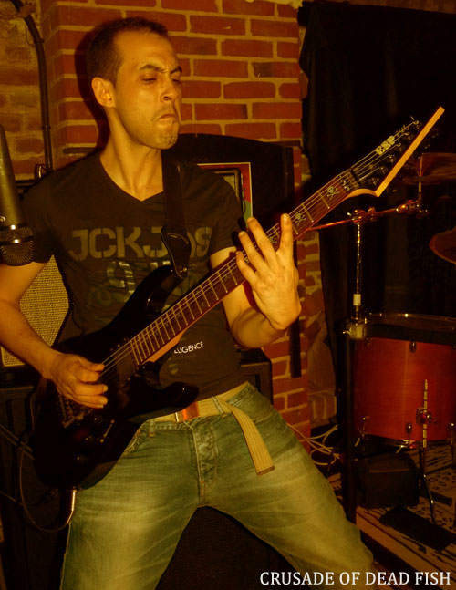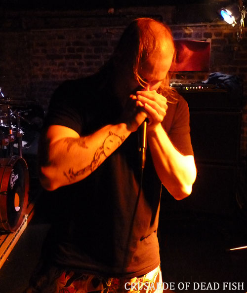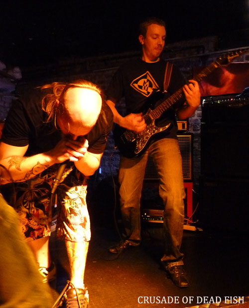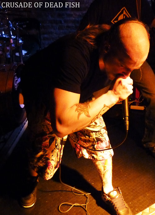 La suite du programme s'annonce plus musclée avec les death métalleux de Crusade of dead fish. Décidément, le metal n'a pas fini d'étonner de part la diversité des noms de groupes. Pour poursuivre dans la métaphore poissonnière, musicalement les nordistes s'éloignent du délicat sushi pour plutôt servir un bon gros steak de requin baleine. Bien chaud, moite, gras et sanguinolent. Niveau gestion de la scène, pas de problèmes, les musiciens sont comme à la maison, jouent vite, jouent fort. Les guitaristes s'éclatent, le batteur parait à l'aise et pillone ses fûts, la puissance des grunts et autres gruiks du chanteur motive la foule. Les premiers pogos se déclenchent et la scène devient rapidement trop petite pour des musiciens débordant dans le public. Compact, puissant, à peine arrivé Crusade of dead fish repart déjà après 20 minutes de set. La prestation courte laisse derrière elle une belle effluve de sueur dans une salle plus chaude tout à coup. Ne manque plus qu'un bassiste pour apporter une touche de volume et de pesanteur supplémentaire.