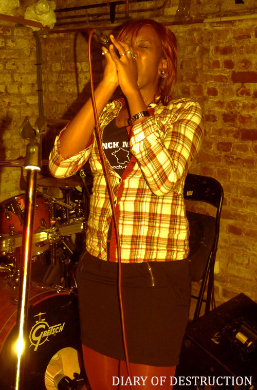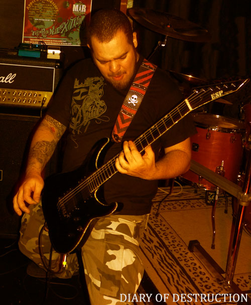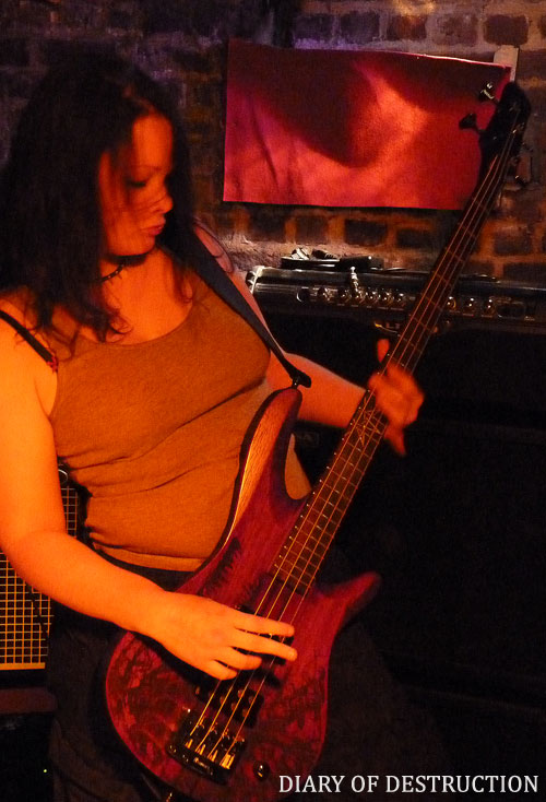 C'est dans cette atmosphère loin de celle d'une publicité pour un gel douche que Diary of Destruction doit officier, bien accueilli par un public de passionnés purs et durs. Le groupe a multiplié les concerts dans la région et a effectivement eu le temps de se constituer un véritable fan club. Affichant une aisance visible, preuve d'une certaine expérience, les lillois développent un metal tonique, mélange assez original de metal mélodique/death/metalcore. Diary of destruction compte également dans ses rangs une chanteuse utilisant une alternance de chant clair et de growls, l'apparition de ce timbre très doux au milieu d'un tonnerre de guitare étant parfois étonnant. Ce soir, l'exercice de ce chant clair parait un peu plus difficile, avec une voix très ténue, comme un peu bloquée. Petit coup de froid ou manque d'échauffement ? Heureusement les parties hurlées largement plus convaincantes n'en quant à elles rien n'à envier à quiconque. Particulièrement engagés, le batteur et le guitariste finiront vite torse nu en sueur ; mais les deux membres féminins garderont leurs vêtements, n'en déplaisent aux spectateurs présents, et ce malgré leurs encouragements. Porté par un public dynamique, Diary of Destruction conclu une prestation énergique et cohérente, révélant des musiciens soudés. Le groupe semble prêt à passer aux étapes suivantes : produire un album et participer à des concerts nationaux, pourquoi pas sur des scènes plus grandes ?