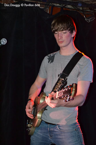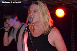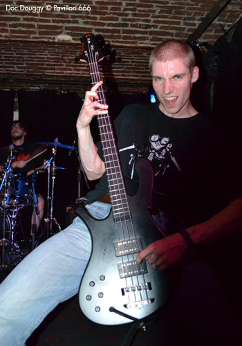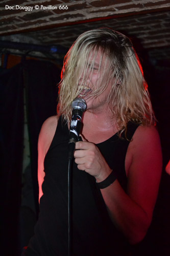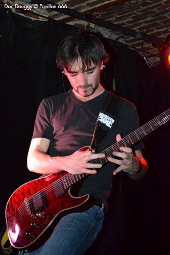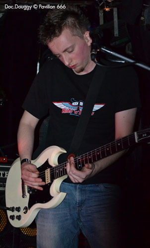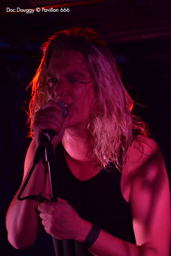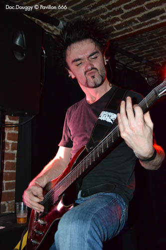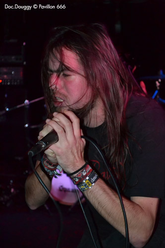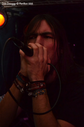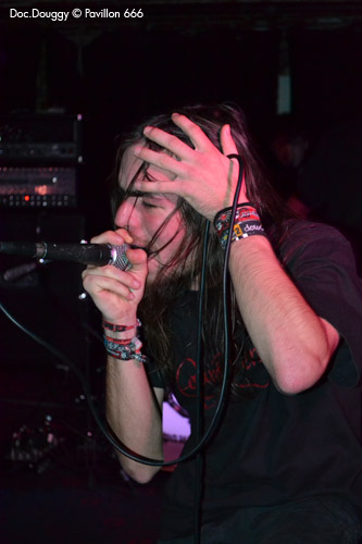 15 min plus tard (soit le temps de remplir son godet au bar), HUMAN JAIL débarque de très bonne humeur, car si le public qui remplit maintenant au deux tiers la salle est de la partie, c'est bien pour fêter tous ensemble la sortie de leur 1er album "The Soul Allegory". C'est donc chacun des 8 titres de l'album qui sont joués ce soir, dans le désordre bien sûr pour le bonheur de votre serviteur qui suit le quatuor Lillois depuis leurs débuts, presque deux ans après leur premier concert. Une chose est sûre, c'est que ces "stonerheads" sont maintenant rodés avec bientôt une centaine de concerts à leur actif en Europe. Hélas, même souci que pour BANDITO, le son est quelque peu trop fort, si on ajoute le fait que leur chanteur jouant avec son câble de micro n'arrête pas de le débrancher.. Fort heureusement c'est leur ingé son qui règle le problème avec un bon bout de scotch ! Contrairement aux BANDITOS, ici le chant de Max est plutôt saturé donnant un côté plus "hardcore" aux riffs bien groovy "southern" d'Antoine, le guitariste. D'ailleurs les trois frontmans (avec Etienne à la basse) s'en donnent à coeur joie sur les nouveaux titres comme sur les anciens tirés de leur première démo, et font preuve d'une aisance scénique qui motive le public à headbanguer, pogoter, voire même porter Max en stage diving sur la fin du concert ! Et heureusement que Chris, leur batteur, martèle bien ses fûts, car sans lui le groupe perdrait de cette vivacité qui nous fait oublier qu'il fait froid dehors ! C'est enfin après un peu plus d'une heure de set et un rappel que nos Lillois nous quittent, sous les applaudissements des auditeurs...