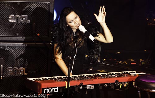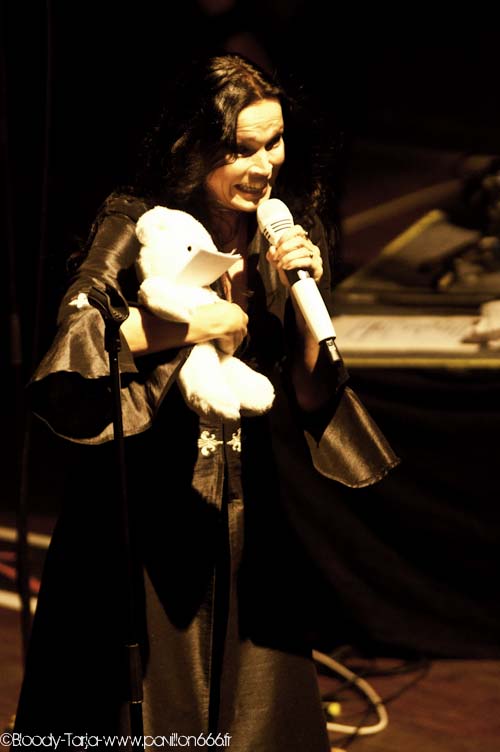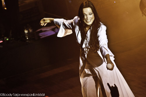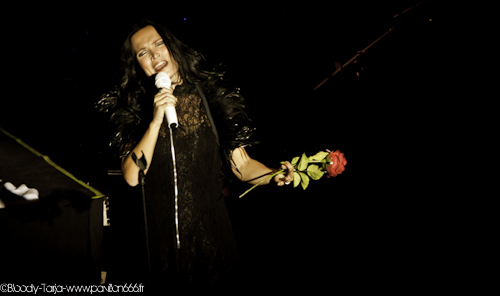 Ce pour quoi tout le monde était venu va enfin avoir lieu. Il faudra juste attendre que les techniciens fassent les réglages derrière le rideau qui voile la scène. Rideau qui par ailleur est à l'effigie du dernier album de la Finlandaise et impose; à nos yeux l'expression impériale de la diva. "Anteroom Of Death" résonne dans la salle et c'est une Tarja qui -ornée d'un masque de cerf ?- vient poser ses premières lignes de chant jusqu'à que le refrain vienne faire tomber le rideau. Effet garanti, le spectacle est prometteur. Réticent pour ma part à assister au spectacle de la Finlandaise, les derniers efforts solo n'aidant pas vraiment, ce fut une agréable surprise qui s'est produite au final. Béneficiant en effet d'un line-up tout ce qu'il a de plus solide, le show ne pouvait être que spectaculaire. Depuis ses débuts, la belle ne s'entoure pas de n'importe qui. Max Lilja (ex- Apocalyptica) Alex Scholpp (Farmer Boys) ou encore le terrible Mike Terrana (Masterplan, Rage) sont les musiciens qui servent à maintenir se coté "gros spectacle". N'importe lequel d'entre eux a une présence importante et personne n'est rélégué au second plan, ce qui aurait été envisageable vu avec quelle importance Tarja est portée dans le coeur des fans (et dieu sait si il sont nombreux ce soir là) . Chacun aura son moment de gloire à travers des demonstrations techniques comme le solo de Terrana. Un peu mégalo sur les bords, l'Américain nous ressort encore et toujours son solo de bête sur les airs d'Offenbach. Certes, il est vraiment très impressionant, mais le coté frime vient ternir sa prestation. Ceci dit le public a apprécié car les réactions sont unanimes. De son coté, Tarja éblouie et fait chavirer le coeur des fans par une prestation vocale irréprochable. Artiste très controversée, depuis son depart de Nightwish, il faut avouer que la belle n'a pas complètement fait le deuil de cette période là. Au milieu du set, les premières notes de "Nemo", hit planétaire de ses ex-comparses, retentit dans la salle... Pourquoi ? Est-ce une manière de "narguer" ses anciens camarades en etant fière de prétendre haut et fort qu'elle seule est capable de chanter ce morceau ou bien est-ce que la présence d'un tel morceau est là pour redonner un second souffle (effet réussi par ailleur) au concert ? Nous ne sauront pas vraiment mais la venue de ce morceau est très discutable...Quoiqu'il en soit l'assistance fut rarement aussi endiablée que pendant ces quatre minutes là !