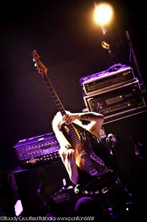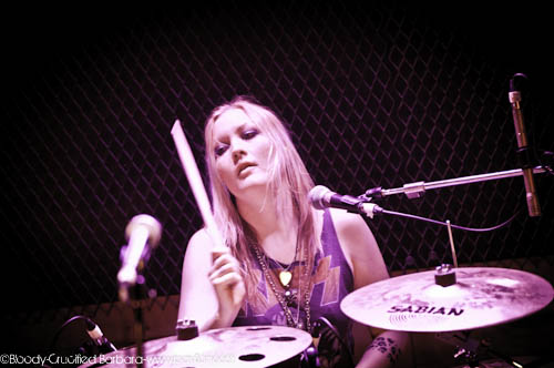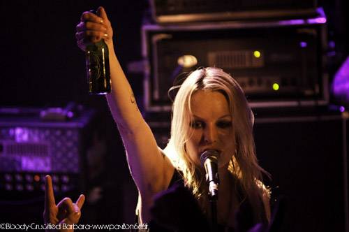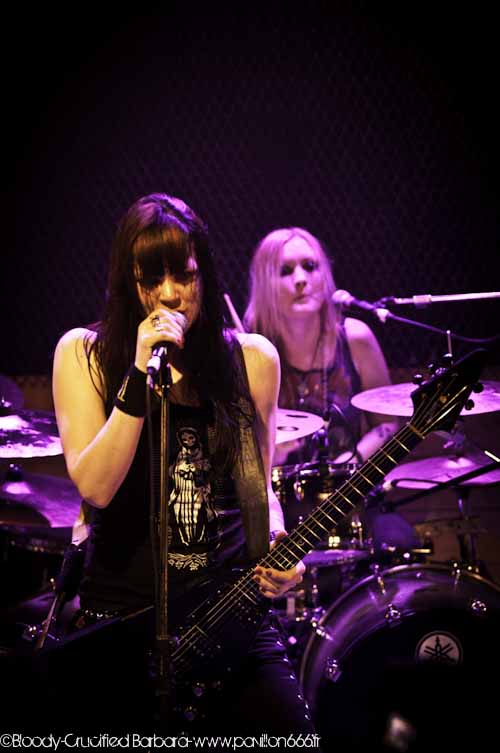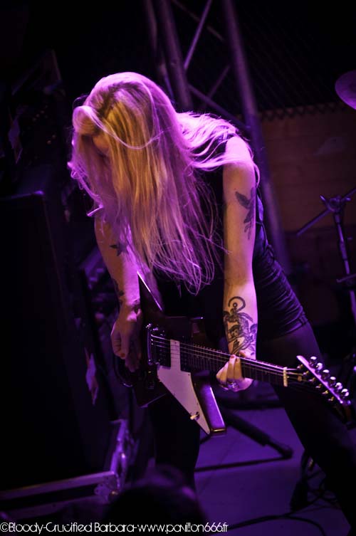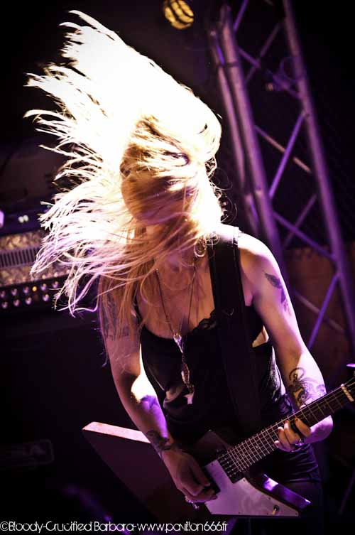 Et c'est justement cela qui est plaisant dans un concert des Crucified Barbara ! Loin d'avoir une attitude "poser" comme la plupart des groupes actuels peuvent avoir, ces dernières vivent, transpirent rock'n'roll à 100%. Et ce qui en découle en concert est simplement énergique et honnête. Les quatre filles se donnent à fond pour un public qui l'est tout autant. Il faut dire qu'avec des enchaînements comme "Sex Action", "Into The Fire" et "Motorfucker" Crucified Barbara ne laisse aucun répit au public. Les titres sont brillament exécutés, Mia est très en forme et son chant ne lui fera jamais défaut. Comparé à quelques années en arrière ou quelques balbutiemments venaient entacher les prestations, il faut reconnaître que la mouture 2012 du quartette Suèdois est une redoutable machine de guerre. Les années de tournées (1 an avec Motorhead quand même) ont forgé un show impeccable qui sera maitrisé de bout en bout ! Chaque fille ira se présenter sur quelques intro de chanson. On pense à Ida, venue taper quelques lignes de basse avant de commencer un morceau tout comme Nicki qui malgré ses patterns de batterie simpliste arrive à insuffler une rythmique agressive aux morceaux.