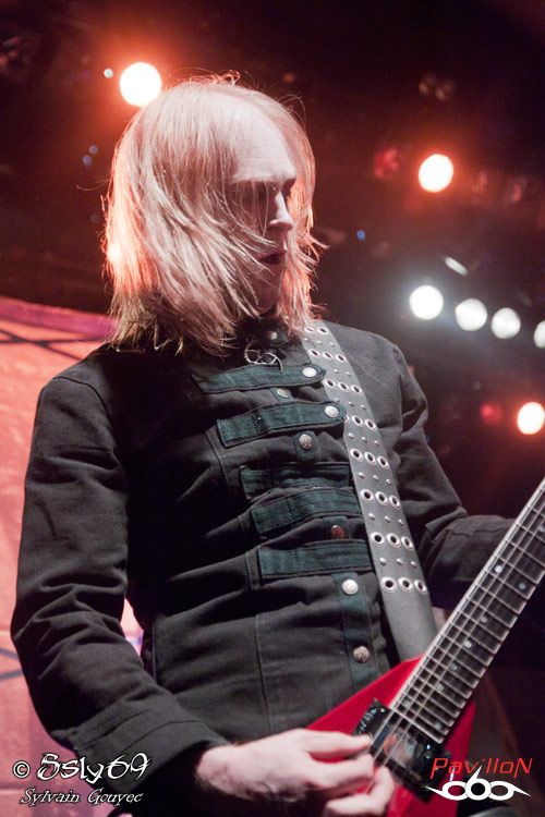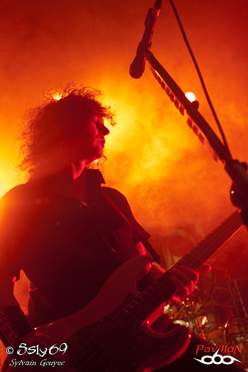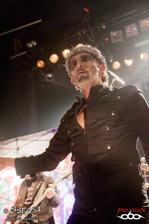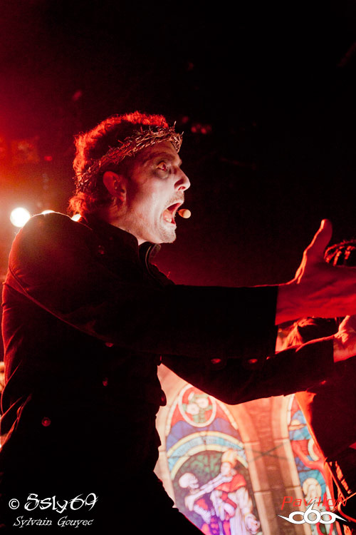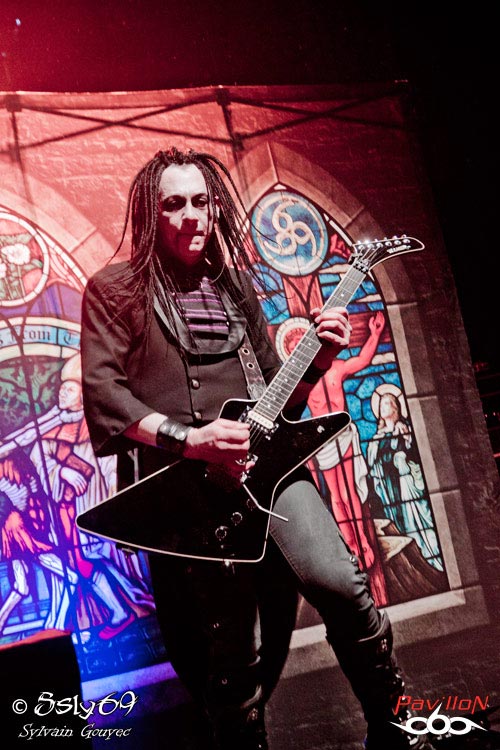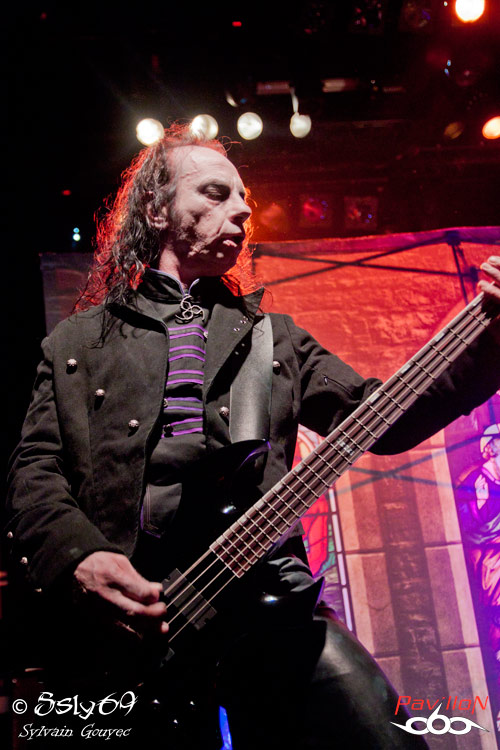 Une petite présentation des british de HELL pourrait aider à comprendre ce à quoi nous aurons le droit en première partie. Ce groupe né au début des années 80 est ce que l'on pourrait appeler un groupe "maudit". Leurs déboirs commenceront avant même l'enregistrement de leur premier album. En effet, la disparition de leur label fait éclater le groupe, s'en suit le suicide d'un des membres, ce qui semble signer la fin du groupe en 1987, soit après seulement 5 ans d'existance. C'est 21 ans plus tard, soit en 2008, que les membres décident de reprendre l'aventure, et de boucler l'album imaginé deux décénies plus tôt. C'est donc dans ce contexte que le groupe se présente à nous, la scène laisse penser à ce qu'aurait pu nous présenter GHOST en légèrement plus réduit, on a en toile de fond des peintures représentant des vitraux blasphématoires, et des tenues de scènes sorties d'un autre âge. Le groupe nous prodiguera un heavy metal sans faute, à l'ancienne, mais qui manque quelque peu de saveur. On restera sur du classique, et rien ne permet au groupe de vraiment faire vaciller le public. L'accueil restera mitigé, et la mise en scène ne sera pas vraiment d'une grande aide. Un semblant d'auto-flagelation pourra prêter à sourire, le show semble surfait et là encore sorti d'un autre âge. On pourra cependant retrouver quelques rythmes sympas, mais qui ne sauveront pas pour autant le show. Des soucis de réglage du son viendront achever de nuire à la prestation du groupe, avec des guitares difficilement dissociables, et une voix difficilement audible, il sera assez difficile d'apprécier le spectacle, aussi théatral soit-il.