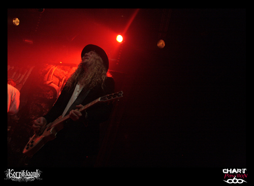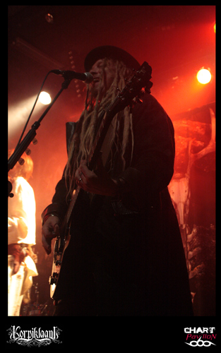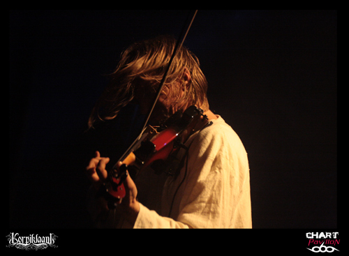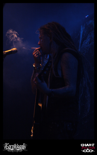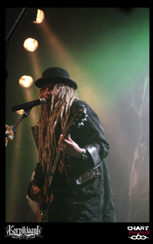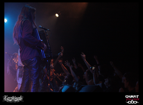 KORPIKLAANI bénéficie d’une solide base de fans sur Lyon. C’est assez étonnant car ce groupe à la différence d’un FINNTROLL ou autre ELUVEITIE est beaucoup plus inscrit dans un pagan metal traditionnel. Je ne veux pas dire par là qu’ils n’ont rien d’original ou que leur musique n’a rien d’exceptionnelle mais malgré tout leur style propre ne propose pas une grande révolution du genre comme le font les deux groupes précédemment cités. En même temps, il faut des bases au style et KORPIKLAANI semble le mieux représenter ce que le pagan metal est dans son plus simple appareil. Bien qu’ayant annoncé un nouvel album pour 2012, KORPIKLAANI est toujours en promotion pour son opus « Ukon Wacka » sorti en 2011. Après une courte introduction, le groupe entame ses standards « Hunting Song » suivi de « Journey Man » de quoi vous mettre directement dans le bain. C’est direct et entraînant comme à son habitude avec ces finlandais même lorsque ceux-ci se lancent dans des reprises telles que « Juodaan Viinaa » de HECTOR ou même plus surprenant avec le fameux « Iron Fist » de MOTORHEAD plutôt inattendu. Mais le groupe n’est pas dépourvu de réelles petites bombes avec de vraies chansons à boire. On compte désormais le redoutable « Vodka » figurant quasiment comme le tube du groupe, le petit dernier « Tequilla » tout aussi redoutable avec ses forts relents mexicains, et bien entendu « Beer Beer » tout aussi incontournable. Vous l’aurez compris, on est là pour faire la fête avec ce groupe même si ce n’est pas l’image que projettent malgré eux certains membres du groupe. En tout cas, le guitariste chanteur et le guitariste sont eux en parfaite adéquation avec leur musique et donnent au public ce qu’il est venu chercher, à savoir de la bonne humeur, de la sueur, un esprit léger et festif.