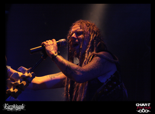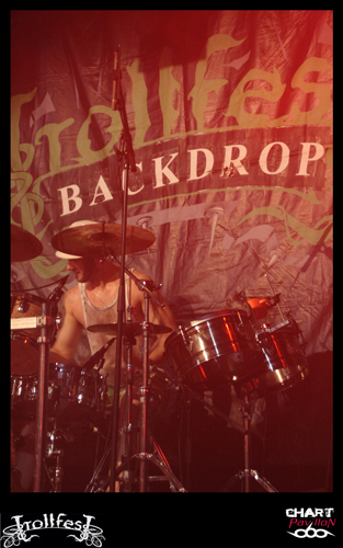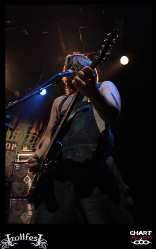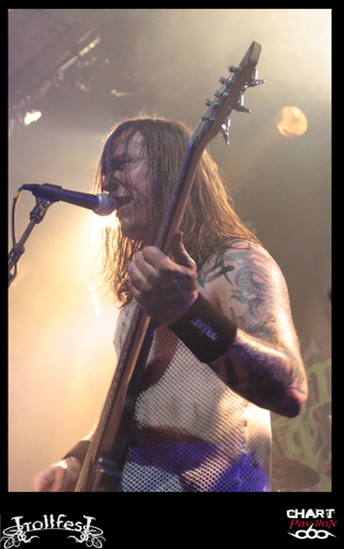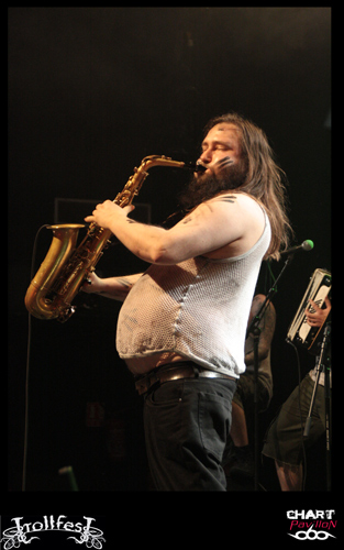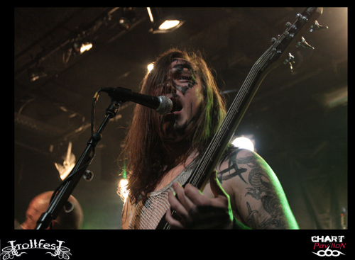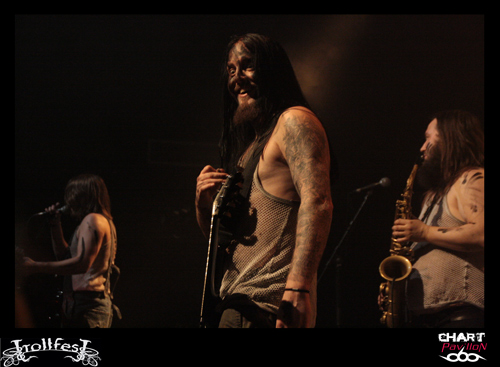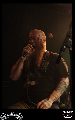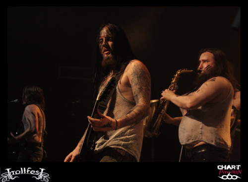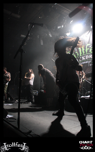 Place maintenant, passez-moi l’expression, au joyeux bordel, de TROLLFEST ! Ces jeunes norvégiens ont décidé de donner à leur pagan un côté définitivement festif et ce au plus haut point. Le chanteur arrive sur scène déguisé en bouteille de bière. Bon, il faut dire qu’avec la tournée en cours on n’a pas vraiment compris qu’il s’agissait d’une bouteille mais plutôt d’un sac poubelle marron ou quelque chose comme ça… Les autres musiciens sont maquillés d’une façon assez crade. Sur scène, c’est la cohue. Tout le monde bouge dans tous les sens avec une bonne humeur affichée. Malheureusement, une fois encore le son n’est pas forcément au top. Du coup, les subtilités passent encore à la trappe. L’accordéon et le saxophone sont à peine audibles. C’est regrettable mais l’ambiance qui règne est telle que l’on est tout de même pris dans ce flot chaotique. Le public ne s’y trompera pas et les plus jeunes assureront une participation remarquable dans le pit. TROLLFEST semble aussi improviser sa set-list ce qui n’est pas forcément très professionnel mais peu importe, on sent que cette tournée leur a donné envie de profiter à 200% de l’opportunité et de s’éclater. C’est chose faite !