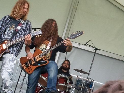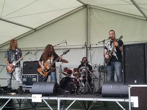« The Blazing Vipers », petit groupe local avait pour charge de débuter la journée musicale aux alentours de 14 heures 30. Sans faire attendre son auditoire assez épars en début de concert, le groupe entame crânement son show en délivrant son heavy metal/hard rock énergique. Comportant uniquement des compositions originales, le show mettra en avant une identité bien réelle malgré des évidentes références comme Iron Maiden qui est évidente dans le coté mélodique et la basse rebondissante (aucun lien entre cet adjectif et le physique du bassiste) à la Harris. Le chanteur est plutôt bon réussissant à poser son propre registre médium et assumé plutôt que d’aller chercher trop loin dans les aigus. Sa voix possède un petit coté James Hedfield parfois sur « Rivers of Cocaine » notamment et à d’autre moment rappelant System of A Down ou Faith No More (« Whirlpool Galaxy ») avec quelques interludes parlés. Scéniquement par contre, on sent que c’est moins rodé, les deux guitaristes sont placé aux extrémités et c’est le bassiste souriant qui occupe le centre, pas de vrai frontman par contre et des interactions entre musiciens encore trop rares. Les soli de guitare aventureux du lead guitariste Kevin sont plaisants mais mériterait encore un peu de rodage pour apparaitre tout à fait maitrisés. Les thèmes abordés et les paroles sont un peu touche-à-tout passant de l’esprit pirate à la Running Wild (« Terror on the Seas ») à des aspects égyptiens sur un « Anubis » qui rappelle d’assez prés « Powerslave » de la vierge de fer... Les titres possède une vraie force malgré des aspects perfectibles comme sur un « Charon’s Ride » qui aurait gagné à être raccourci sur la fin pour conserver son intérêt. Après trois petits quarts d’heure que l’on n’avait pas vu passé, le groupe conclura son show sur l’humoristique « Wok’n’roll Machine » et l’on pourra se réjouir d’avoir assisté à un concert fort plaisant.