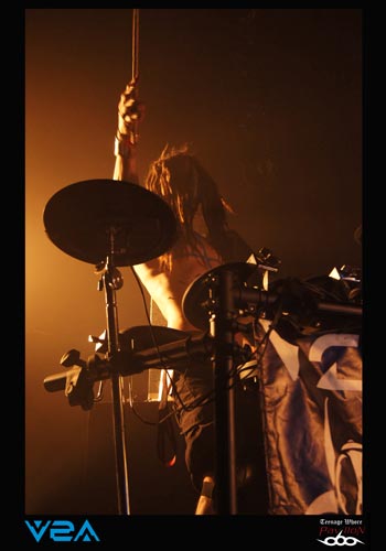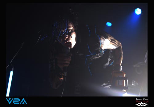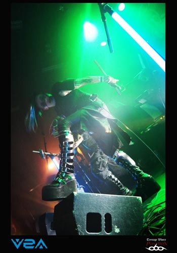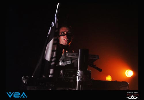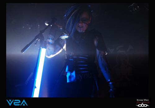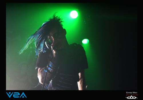 Il est 20h et V2A prend place sur scène. Le groupe est très inspiré cybergoth esthétiquement parlant. Le quatuor ne passe pas inaperçu ! Les « astronautes » de l’électro indus sont décidés à chauffer la salle ce soir. Brandissant des drapeaux tel un appel à la révolte ou à je ne sais quoi d’autre, les « boum-boum » raisonnent comme des boulets de canons dans la salle du CCO. Et c’est parti pour 40 minutes non-stop de musique avec bien souvent trois phrases en guise de paroles et des musiciens déchainés à souhait. Le fait d’avoir deux voix, une féminine et une masculine est plutôt bien choisi et donne un réel plus à leur musique excentrique. De plus, ces deux leaders n’hésitent pas une seconde à donner le micro au public afin de crier en cœur certains passages. Le côté pratique, comme je le disais précédemment, c’est que souvent il suffit d’une phrase pour combler toute une compo, ainsi si vous ne connaissiez pas ce groupe et encore moins les paroles, cela permettait de faire un petit rattrapage express. Du coup, le « Look like an angel, fuck like a whore », après 3 minutes d’intense répétition non stop, tout le monde était capable de le crier dans le micro ! Le claviériste prendra même un plaisir monstre à prendre un bain de foule accompagné toujours de son drapeau, ce qui incitera encore plus le public à se défouler dans la fosse. V2A est donc un très bon groupe pour chauffer une salle, et était largement à la hauteur de faire la première partir de COMBICHRIST.