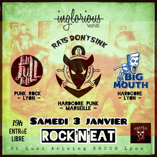 Sur scène dès 21 heures se sont succèdés les Marseillais de RATS DON'T SINK et les Lyonnais de BIG MOUTH et de FULL FULL FULL. Naturellement ce petit bal du Samedi soir dans les sous-sols du 32 quai Arloing fut très agité dans la joie et la bonne humeur comme prévu en ce début d'année, alors musique !