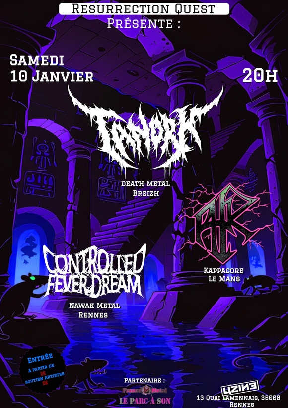 Samedi 10 janvier, je suis allée à l’Uzine pour assister à mon premier concert de l’année 2026 ! Je souriais malgré moi sous la pluie, car j’étais très heureuse de pouvoir à nouveau ressentir l’énergie des lives underground. Et bien sûr, je n’utilise pas ce terme à la légère, car ce soir-là, il s’agissait de metal extrême dans la salle souterraine du bar rennais. L’événement a été mis en place par l’association sarthoise Resurrection Quest, qui a à cœur de valoriser cette scène avec beaucoup de sincérité : une initiative à soutenir !