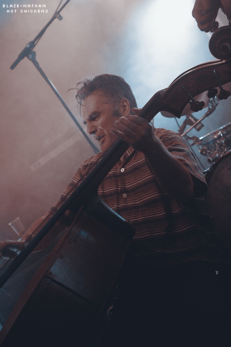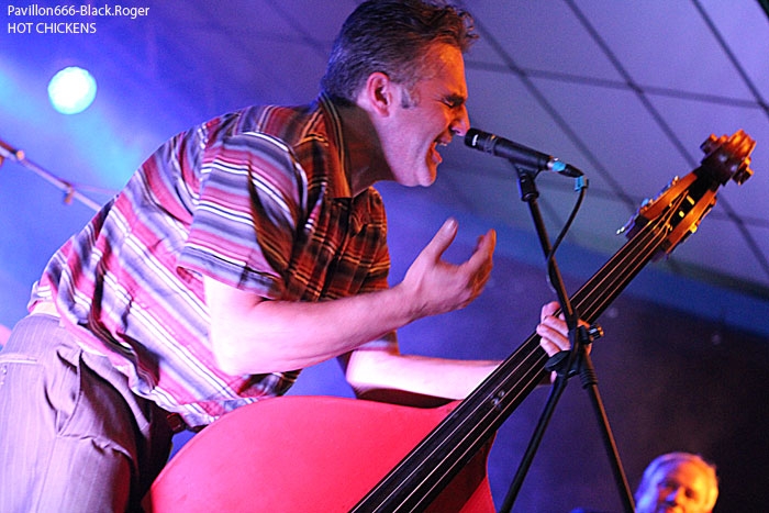 La salle s’est remplie maintenant pour un public aux anges qui va se défouler avec du bon rock des fifties envoyé par HOT CHICKENS, trio incontournable de rockabilly avec un frontman/chanteur/slapeur et plus si affinités qui se révèle très très démonstratif. Les Nordistes de Béthune vont nous démontrer que le rock des pionniers du genre n’est pas recouvert de poussière. Hervé est intenable sur scène et fait voltiger sa contrebasse électrique en jouant de son instrument même à terre. Christophe fait « miauler » sa six cordes et Thierry martyrise ses fûts. En musiciens pro ayant déjà écumé les scènes de France et de Navarre dans d’autres groupes, le rock n’ roll ils connaissent, et les envois sont imparables dans le genre avec un bon son à la clef pour ne rien gâcher.