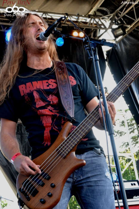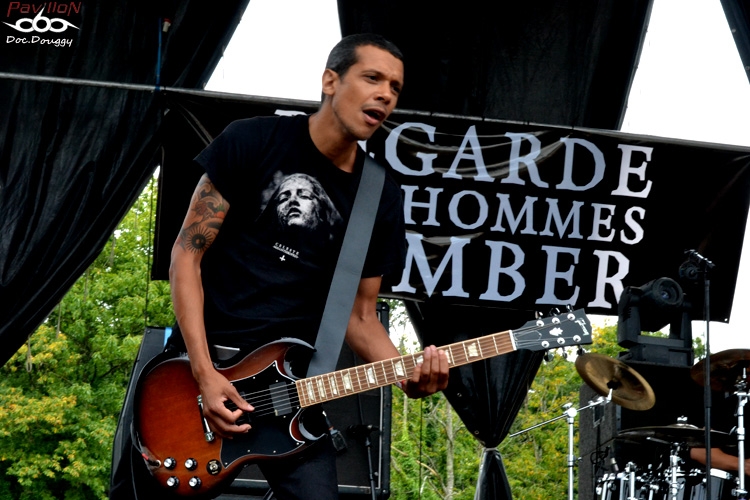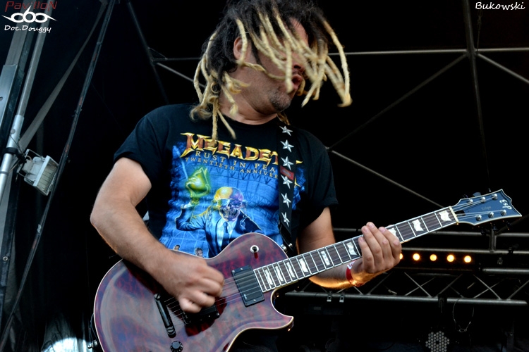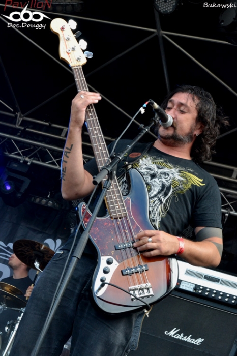Et la journée commence avec un groupe dont on entend beaucoup parler dernièrement : REGARDE LES HOMMES TOMBER. Certains diront que ce combo/projet du chanteur d'Otargos, Ulrich, fait dans la facilité et utilise la renommée de son chanteur pour un peu plus de 2 ans après sa formation, se retrouver à faire des apparitions notamment au Hellfest, d'autres comme moi vous diront qu'ils jouent la proximité tout simplement (le groupe est Nantais), que leurs musiciens possèdent un certain feeling dans leur composition avec un premier album éponyme de grande qualité, mais aussi qu'ils récoltent ce qu'ils sèment : un bon album, beaucoup de disponibilité pour être sur les routes de France (et d'ailleurs), et un certain sens du marketing qui fait que beaucoup dans la sphère Metal ont entendu parler d'eux. Mais reste à voir ce que donne le contenu "Live". Je ne peux que constater que les instruments sont tous globalement bien dosés lors d'une "introduction" mettant en place le quintette avant l'arrivée d'Ulrich qui sonne le glas de son chant écorché. Lâchant la guitare pour se concentrer sur le micro, le Nantais sait haranguer son public et assure plutôt bien tout en restant dans la sobriété comme le reste du groupe. 45 minutes de set sont suffisantes pour présenter leur album au public, un son massif, lancinant avec sa touche "dark". Bref, une journée qui commence bien ! On reste toujours en France avec les Parisiens de BUKOWSKI. Le quatuor Southern rock n'est pas dans la demi mesure et que ce soit au look très redneck, ça sent la grosse moto et le bourbon ! Alors qu'eux aussi ont un nouvel album "Hazardous Creatures" à présenter (sur lequel je n'ai pas encore posé l'oreille) il faut dire que la donne pourrait changer. 4 titres pour cet album sur 9, il n'y a que le second opus qui est peu représenté avec un seul titre (je vous laisse deviner pour les 4 derniers...). Un son très cru qui colle à l'ambiance "rock 'n roll" sur scène, le groupe rend très bien en condition "live" ne serait-ce que par une présence et une scène parfaitement occupée. Une bonne découverte qui se fête à coup de pintes avec le groupe et surtout un soleil qui pointe le bout de son nez ! On enchaîne avec les autres absents de l'an dernier qui cette fois sont de la partie : ATARAXIE. Les Rouennais qui déferlent dans un Funeral Doom/Death ont bien fait de se faire attendre, ayant eux aussi un nouvel opus à nous présenter : " L'être et la Nausée" dont on aura d'ailleurs un extrait, " Face the Loss Of Your Sanity". C'est pas toujours facile d'apprécier un groupe de Doom en début d'après-midi, car à l'instar de RLHT un peu plus tôt, ATARAXIE se ressent beaucoup plus pessimiste et sombre encore ! Un lightshow du tonnerre aurait pu rendre tout fan de Doom conquis si le groupe était programmé en soirée, hélas ce n'est pas le cas... Je tente d'apprécier tant bien que mal les 4 titres des Rouennais malgré tout, et en fermant les yeux, on entre dans cet état proche de la léthargie tout comme les effets produits par les cachets portant le même nom, sauf lorsque qu'ils reviennent à des rythmiques très Death, froides comme le Nord ! 40 minutes trop rapides dans leur écoulement, mais dans le rythme imposé par le quatuor on en compterait le double ! A revoir et à écouter sans cesse... Le concert terminé, on s'attend à voir JUMPING JACK arriver, mais les minutes passent et la mauvaise nouvelle tombe 10 minutes plus tard : EYEHATEGOD (qui nous ont fait un concert monstrueux en première de Brutal Truth deux semaines plus tôt en Belgique et que je me faisais donc un énorme plaisir de revoir), est donc annoncé que JUMPING JACK et UFOMAMMUT qui sont programmés par la suite, joueront un peu plus longtemps... Déception pour un grand nombre, mais bon on fera avec (surtout avec la disparition prématurée de Joey à l'issue de la tournée, R.I.P...) Revenons en donc à nos moutons, et c'est donc JUMPING JACK qui enchaîne derrière cette annonce. Après avoir découvert le groupe au printemps dernier accompagnant High on Fire, je m'attend à un set bien pêchu de la part des "locaux" (si on peut dire ça des Nantais). Et c'est exactement le cas, un groupe très énergique sur scène, qui colle d'ailleurs bien plus à une scène extérieure ! Et contrairement à ce que je citais au printemps, ici ils jouent à la maison et peuvent se targuer de prendre le public pour parti pris ! Un stoner/rock bien burné, une batterie toujours aussi remontée et un set comme sur des roulettes ! Si ça continue comme ça, on a pas fini d'entendre parler d'eux ! Par contre suite à l'annonce faite, le groupe devait jouer plus longtemps, mais ne dépassera pas le temps qu'il lui était imparti, pas toujours facile d'allonger sa setlist lorsque l'on n'est pas préparé pour ça ... 20 minutes passeront encore avant d'entrer dans les terres psychédéliques des Italiens d'UFOMAMMUT. Connus pour avoir un son massif à la manière d'un Electric Wizard, le combo a su se démarquer au fur et à mesure de sa carrière et nous sortent des albums de plus en plus aboutis à l'image des deux "EvE", par exemple. Grosse guitares et basse en sourdine branchées sur du Green (un équivalent du matériel Orange), les 4 Italiens m'emmènent dans des contrées chamaniques desquelles on pourrait y croiser des dinosaures de couleurs vives avalant des substances naturelles et se laisser porter par le flot des mélodies lancinantes du combo... Tout un programme. Préférant tout de même les enregistrements studio du groupe, et mêlé au soleil, c'est allongé dans l'herbe que je m'assoupis en fin de set pour me laisser porter et... me réveiller alors que THE OLD DEAD TREE ont déjà commencé leur set, près de 45 minutes plus tard... J'en apprécierais qu'un titre de loin préférant pour maintenant me rattraper lors de leur passage à Lille à la rentrée pour leur tournée d'adieux/anniversaire. Une bonne bière (ou
