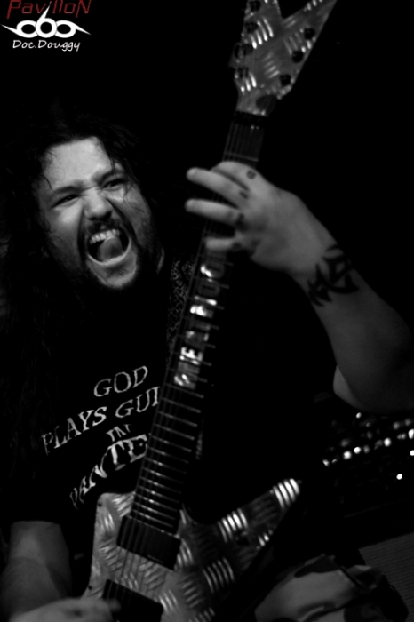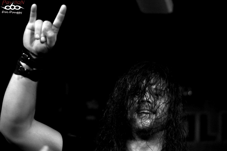 Par contre, même si en studio les albums du quintette ne sont pas toujours de qualité égale, leurs passages "live" ne m'ont jamais laissé de marbre, leur puissance se déchaînant sur scène. Et alors que je connais surtout "Affiliated with Suffering" (2002) quelle ne fut pas ma surprise lorsque "Unleashing Hell" retentit, morceau d'ouverture de l'album et donc de ce soir ! Rien de tel pour se mettre dans l'ambiance tranchante et technique des Norvégiens. L'occasion aussi ce soir de découvrir sur scène les deux nouveaux membres: Ole Bent Madsen, bassiste recruté en 2011 et leur nouveau chanteur Yngve Bolt Christiansen (arrivé à la même époque). Le résultat est charmant, on a l'impression que le groupe a toujours évolué de cette manière ! Groovy, Brutal, Technique et sanglant, voici quelques mots clés qui définiraient la prestation de BLOOD RED THRONE. Le public un peu plus amassé que lors des premières parties ira jusqu'à porter l'un des leurs en slam malgré une taille de salle plus que restreinte dans ces moments de fureur. Honneur aux guitaristes qui possèdent un jeu et un son sans failles et concernant Ivan Gujic (guitare) une certaine ressemblance (de la guitare au physique en passant par les mimiques) avec un certain Dimebag Darrell, dont on fête "l'anniversaire" de sa mort ce jour, il y a 9 ans de ça... (Déjà !) D'ailleurs c'est l'occasion de lui rendre hommage en jouant les premières notes de "Walk" et un public qui ovationne "Dimebag, Dimebag... !" (RIP)