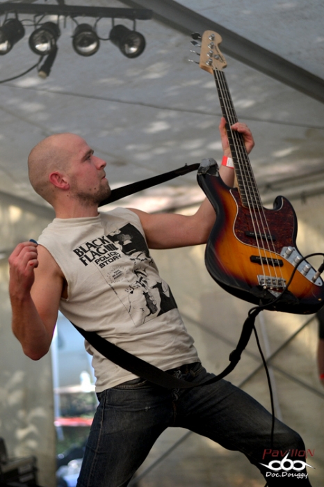 L'après-midi est bien avancée et enfin un peu de Grindcore, ou devrais-je dire de "Mince core" (ce qui n'est pas le cas de Jan, le growleur/bassiste soit-dit en passant) avec les légendaires AGATHOCLES. Ceux-ci étaient à la base en tête d'affiche, mais connaissant le penchant du trio Flamand pour sa consommation d'alcool et ses nombreuses annulations ou prestations "loupées", il a été bien vu de la part de l'orga de les avancer à la fin d'après-midi. Jan et son guitariste ont l'air un peu plus frais que leur batteur, mais ça tient la route, fort heureusement ! Nombreux sont ceux venus pour les voir et le trio aux 150 E.P et splits joue devant un parterre de fans déjà conquis à leur cause (moi y compris, bien entendu !). Par habitude, les Flamands sont très peu françisants et pourtant Jan n'hésite pas à l'employer pour donner quelques informations entre chacun de leurs titres, allant du fameux "La jeunesse emmerde le Front National" (ou le parti extrémiste/nationaliste Belge) ou pour défendre la cause animale. Car oui, tout comme leurs compères Anglais de Napalm Death, AGATHOCLES depuis presque 30 ans revendique. Tantôt Grindcore pur et dur, Goregrind et passages plus dansants, voire "Punk/Crust", il est tout à fait plaisant pour tout le monde de les voir ce soir. Puis bon, c'est pas tous les jours qu'on vous joue 40 titres en un peu plus de 45 minutes (en citer reste très difficile, mais c'est le pied d'entendre en "live" "A for Arrogance" ou "Razor Sharp Daggers" !
