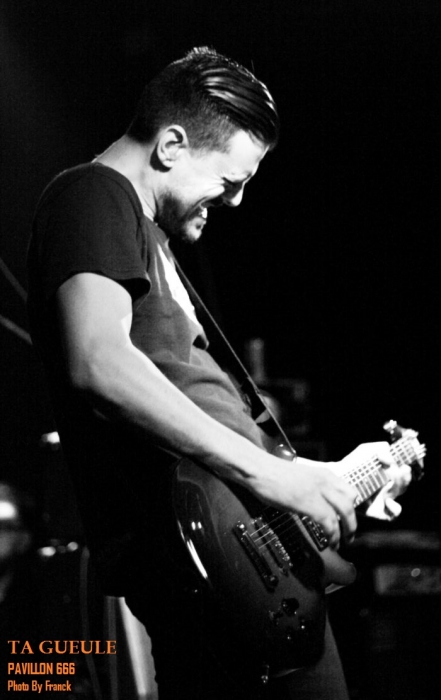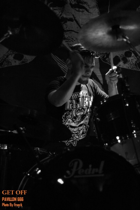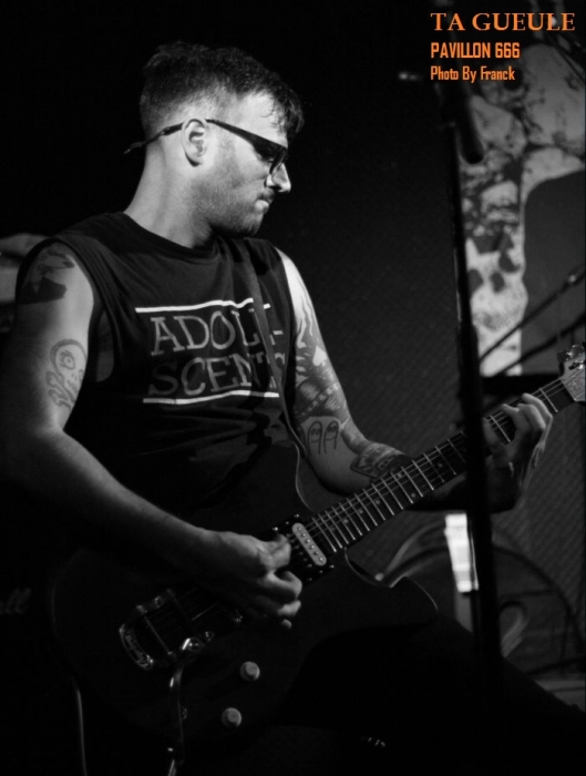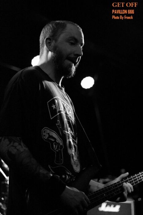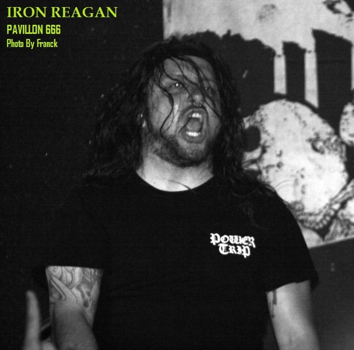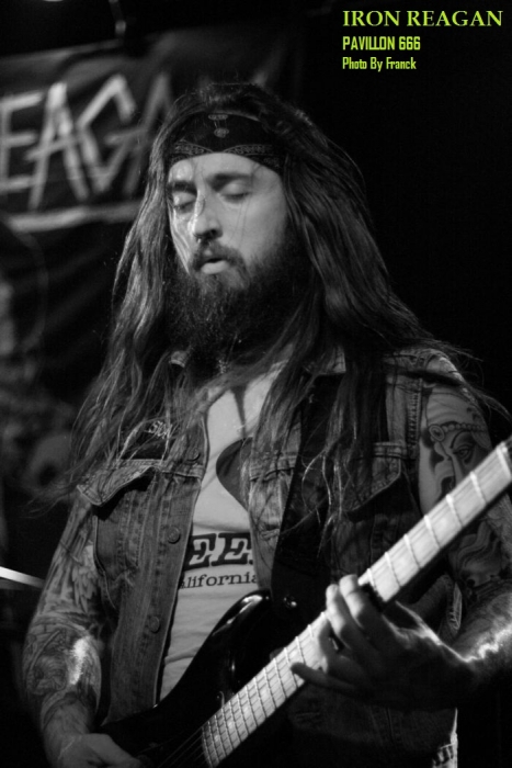 La suite des évènements m’indiquera qu’une fois de plus je ne me suis pas trompé. Si la semaine dernière il pleuvait dans la salle du Warmaudio un « savoureux » mélange de sueur, d’eau et de bière, ce soir ce sera un peu plus lourd et compact car ce sont des « bonhommes » qu’il va pleuvoir, j’ai même pu vérifier pour vous en ramassant l’un d’eux sur le coin de la tronche. Le ton est donc donné et ce sont les jeunes coreux de Get Off qui ouvrent le bal avec leur hardcore bien caillouteux à la lyonnaise comme on l’aime. En produit brut, ils ne nous avaient sorti qu’un EP « Shemale Revolte » qui sonnait plutôt bien pour un premier jet et depuis ils ne nous ont rien sorti d’autre et pendant ce temps là nous on attend, car les compos elles sont bien là. La preuve en est qu’ils vont nous sortir un joli set qui déboise bien. Le public s’est montré un peu timide, mais lorsque l’on ouvre pour des affiches comme Ta Gueule et surtout après Iron Reagan, Il ne faut pas s’étonner. La fièvre gagnera le Warmaudio petit à petit. De toute façon, le public est là et nos Get Off n’ont pas matière à se sentir seuls et le public sait apprécier. En bons musiciens de hardcore, les beuglantes de Svan passent loin par-dessus Corentin qui démonte littéralement sa batterie sur un fond de guitare incisive tenue par Flo et de basse saturée à souhait que Marmouda malmène tout en faisant des allées et venues d’un bout à l’autre de la scène. Get Off, c’est super bon, on aime et chez nous on ne s’en lasse pas, on attend juste qu’un nouvel album pointe enfin le bout de son nez. En attendant, rendez-vous sur leur page Bandcamp pour les découvrir et télécharger gratuitement leur EP. Vous avez également leur page facebook pour vous tenir au courant de leur actualité et de leurs dates à venir. Depuis le temps que nous les attendions de nouveau à domicile, voici enfin les terribles Ta Gueule qui envoient à toute force leur intro sur la scène du Warmaudio. On peut dire en quelque sorte que pour Lyon, il s’agit enfin de la release party de leur nouvel et troisième album : « Tigre & Gorille », un magnifique album coup de poing de 9 titres. Ce tout dernier album, je l’ai trouvé meilleur que les deux autres, pour l’unique et seule raison que l’enregistrement à été particulièrement bien soigné et cette fois-ci, les voix se démarquent vraiment de la musique et on comprend les paroles (rires). En tout cas ce soir ils nous sortent la formule familiale puisqu’ils sont tous les quatre sur scène et croyez moi, on va copieusement se faire arroser, ça va envoyer sévère. De toute manière, je n’ai jamais vu les Ta gueule faire dans la demi mesure. Côté tempo, ça va toujours aussi vite et côté son, ils ont mis les petits amplis dans les grands. Bien entendu entre chaque titre qui est une véritable avalanche sonore, Chris égaye l’atmosphère de son humour incisif et graveleux, mais le public un tantinet habitué bronche moins, alors Chris va les provoquer. Les réactions ne tardent pas, les verres volent direction la scène et les insultes fusent, bref une véritable ambiance pour un concert de Ta Gueule. Mais toujours dans un esprit bon enfant je le précise. Adrien a sa plus grande joie est obligé de bosser sur scène et de faire des annonces concernant des propriétaires de véhicules qui se sont garés comme des merdes. Quant à Ed, il est venu tranquille en touriste, les mains dans les poches, tant et si bien qu’il joue sur une des grattes de Chris et avec les pédales d’effet de Forest. Si ça continue, il va viendra bientôt à poil et on devra lui prêter des fringues… Par contre, ce qui est intéressant dans cette anecdote, c’est de voir Ed jouer avec un instrument complètement inhabituel pour lui. Vous me direz : Après tout, ce n’est qu’une guitare !! Mais tout de même, Ed qui ne joue que sur des Télécaster, se retrouver avec une gratte plus volumineuse avec un bigsby, ça vous change un homme. De plus, le son de sa gratte a été une véritable gifle sonore. Romain s’est comme d’habitude contenté d’envoyer la mesure à toute force et à se marrer en contemplant les échanges scabreux entre Chris et le public. Les Ta Gueule nous ont passé en revue un florilège de leurs trois albums pour notre plus grand plaisir et dans leur style totalement unique et personnel comme ils savent le faire. Ta Gueule sur scène, c’’est toujours un moment très attendu chez nous car nous savons tous que nous allons passer un bon moment de franche rigolade et un pur moment de rock’n roll surpuissant et super speed avec déstockage massif de décibels garanti !! Voici venir maintenant l’énorme affiche de la soirée avec les américains d’Iron Reagan. Ce combo de folie composé de membres de Municipal Waste, Darkest Hour et Cannabis Corpse pratique une sorte de crossover punk hardcore et metal qui envoie un bois pas possible. Après une musique d’intro balancée à fond dans les façades, les voici qui entrent en scène et le set démarre immédiatement pied au plancher. Il n’y a pas à dire, ça joue vite, ça joue fort, c’est également technique et c’est un véritable tsunami sonore qui s’abat sur la salle du Warmaudio. Et là, c’est soudain l’enfer qui se déchaine. Impossible de pouvoir faire des photos devant la scène, ça vole dans tous les sens. Le pit est une vraie tuerie comme on en voit rarement. Des tas de gugusses se balancent de la scène dans le public à toute force. Après en avoir pris un sur la tronche, je bats immédiatement en retraite et je vais tenter de faire quelques photos du fond de la salle, qui d’ailleurs ne seront pas super réussies car il n’y a pas de point vraiment surélevé au Warmaudio. Pendant que j’essaye tant bien que mal de m’installer en régie pour faire mes photos, les Iron Reagan ne perdent pas une seconde et foutent littéralement le 