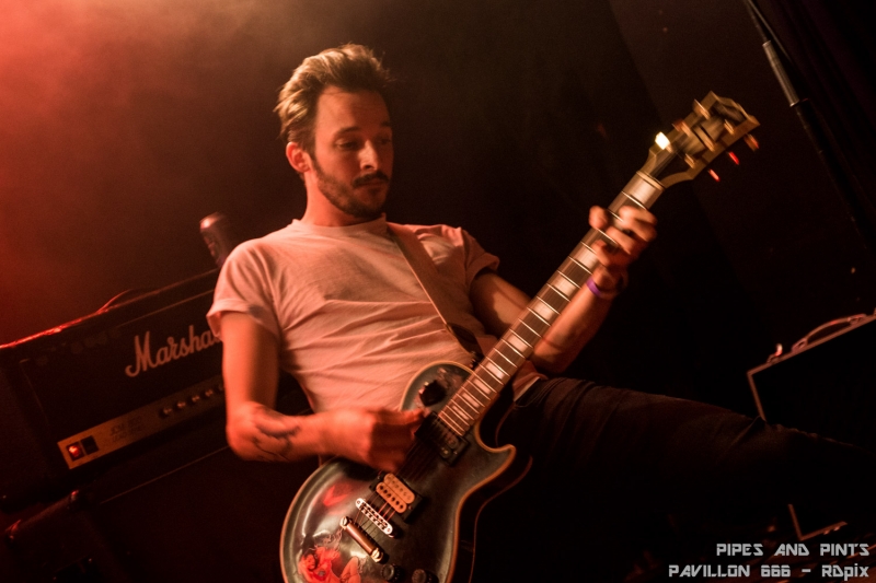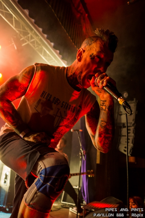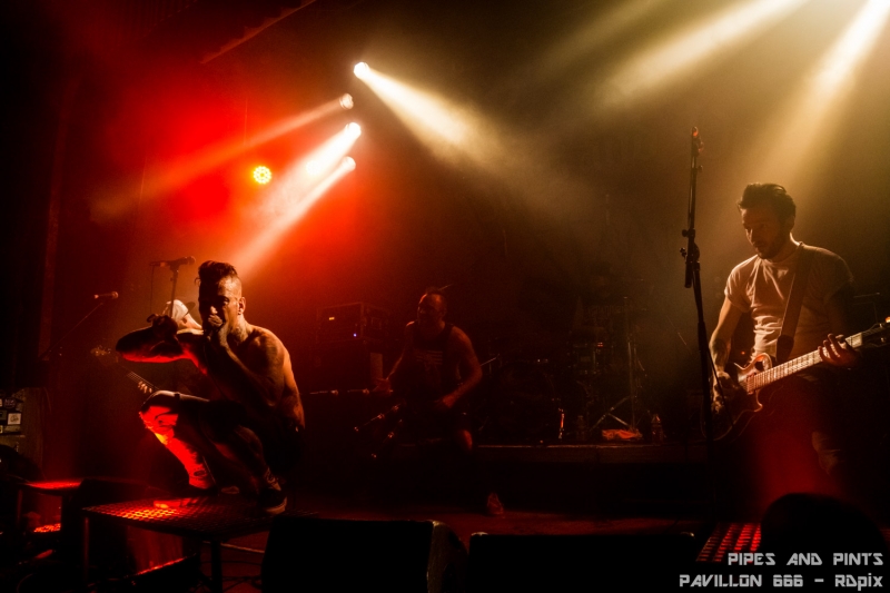 L’équipe technique a rapidement fait son travail pour mettre en place la scène pour le groupe suivant. Et ce n’est pas VIOLENT AFFAIR qui est monté sur scène mais ce sont les tchèques de PIPES AND PINTS qui ont investi les lieux. Le quintet joue un punk plutôt inspiré et très festif. Le trio habituel guitare-basse-batterie est déjà très performants à lui seul. Mais quand il est agrémenté d’un musicien supplémentaire qui souffle dans le cul d’un mouton mort pour faire de la musique, ça se marie plutôt bien, c’est punk, et le résultat est au rendez-vous. Ajoutez à cela un chanteur tatoué jusqu’aux yeux et dynamique comme personne, et vous obtenez un groupe de punk celtico-tchèque avec une patate d’enfer et une efficacité indéniable.