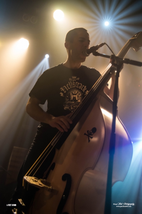 La salle est déjà bien rempli pour la première partie, les vendéens de 6 Feet Down qui eux aussi pratique dans le psycho billy gominé. Le groupe écume les salles depuis 13 ans et c’est d’ailleurs à l’occasion d’un concert de Mad Sin en 2002 qu’ils ont fait la rencontre de David, leur contre bassiste, instrument si caractéristique du psychobilly. Leur prestation de ce soir est aux petits oignons, avec des nouveaux titres, « Victim of unreality », entre autres qui se retrouveront certainement sur le troisième album du combo, mais assez mal payé avec un public très passif. C’est Mad Sin qu’ils veulent voir et cela se ressent dans l’ambiance générale du concert, mais cela ne démonte pas pour autant les 6 feet down qui s’amusent du calme tangible du ferrailleur. C’est qu’ils n’en sont pas à leur premier concert, près de 200 à leur actif, un bien beau palmarès pour ce groupe français. On retiendra surtout quelques bons morceaux comme « one night in hell » et le récent single « Gun and Glory » parmi les bons moments de cette première partie. Après une longue pause balance, les Allemands de Mad Sin entrent en scène, devant un ferrailleur acquit à leur cause, malgré une petite forme de l’imposant Koefte qui tournera au thé au lait pendant le concert; le gaillard traînant apparemment une mauvaise grippe ou autre, étant sorti d’hôpital il y a peu ce qui ne l’empêchera de faire le show, étant remplacer au chant par le contrebassiste Valle. Celui-ci a toujours l’air de s’éclater sur scène, souriant de toutes ses dents tout en jouant de son hallucinante contrebasse éclairée au néon, il faut bien dire que l’objet est visuellement une belle trouvaille ; En tout cas, elle concurrence bien la magnifique banane de Ramon, l’Elvis de Mad sin. Mad sin n’ayant pas d’actu en ce moment, pas d’album particulier n’a été mis en avant et l'on a plutôt eu le droit à un petit best of live de leur déjà longue carrière. « Speak No Evil », « Straight to Hell » ou « 9 lives » font parties des quelques classiques joués ce soir, il n’en aura pas fallu plus pour provoquer quelques joyeux pogos. Les feux de bengales collés sur la contrebasse de Valle et allumés en plein milieu de la salle font partie des moments forts du concert. Un classique des Mad Sin, puisqu’ils l’avaient déjà fait la dernière fois que je les avais vus au vip de Saint-Nazaire. Une bien belle soirée rock’n roll concoctée par l’asso nantaise cafard nahum qui n’en a pas à son premier délit, ils ont déjà programmé des concerts de punish yourself, GBH, les ramoneurs de menhir ou les sous estimés Fishbone. Mad sin est donc une belle prise de plus à leur actif, en attendant les Washington Dead cats, le mois prochain. Une nouvelle fois au ferrailleur. |