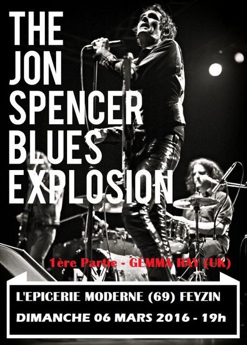 Personne n’y a perdu au change puisque les voici de retour et je peux vous affirmer qu’ils sont en grande forme et sont accompagnés en première partie de la ravissante Gemma Ray et de ses musiciens. C’est dans une ambiance plutôt bleutée à la fois très velours et très sombre que Gemma ray la jeune anglaise exilée à Berlin débute son set accompagnée de son batteur et claviériste, ainsi que de son bassiste qui sévi également au lap steel. Il faut avouer que réellement, je n’ai jamais trop accroché avec les albums studio de Gemma, qui sont quand même au nombre de six depuis qu’elle a démarré en solo en 2008. En effet, ses albums beaucoup plus orchestrés avaient à mon goût un son trop pop, même si derrière tout cela émergeait ce côté un peu blues, un peu dark. Ce n’était malheureusement pas une musique qui me parlait beaucoup et j’ai fini par me désintéresser plus ou moins de qu’elle enregistrait. Et ce soir, c’est la première fois que je la vois sur scène et je ne vous raconte pas la claque que j’ai prise. Non, je vous rassure, Gemma ne m’a pas physiquement mis de tarte, mais plutôt musicalement. J’ai rarement observé un tel décalage entre des enregistrements studio et une prestation absolument énorme comme je l’ai vue ce soir. Gemma Ray est une femme totalement envoutante qui s’impose sur scène telle une prêtresse de l’underground voire de la nuit. Armée de sa magnifique Guitare hollowbody Gemma se ballade sur son manche alternant un jeu très blues ou rock lent en faisant parfois glisser son bottleneck qui vous fait frissonner le dos. Elle envoie un superbe son bien rond très typé Fender, agrémenté d’un écho à bande à la résonnance absolument magique, tant et si bien qu’il est encore imprimé dans ma mémoire. Lorsque Gemma Ray chante, alors là c’est l’extase. Si sa voix par moment peut se montrer rugueuse car le crunch monte et qu’il faut donner de la voix, le reste du temps, sa voix est sirupeuse et profonde à souhait, calée entre Margo Timmins ou Hope Sandoval. La voix de Gemma est totalement envoutante sur scène et vous file le vertige. Si vous vous laissez prendre, c’’est le décollage garanti. Mais indépendamment de votre volonté, Gemma vous attrape dans sa toile et vous sombrez voluptueusement au travers de ballades au son lent imprégné d’un écho venu tout droit des sixties. C’est la transe totale avec des titres traversés de silences, ces ballades désenchantées comme savaient si bien le faire les Cowboys Junkies et un son mes amis, un son !! C’est une véritable invitation au voyage. Gemma a trouvé la perle rare, la fameuse note bleue et m’a littéralement séduit durant son set qui a malheureusement du prendre fin. Quelle présence, quelle voix, quel charisme. Plus jamais je ne l’écouterai de la même oreille et soyez sur que j’irai fissa la revoir dès que l’occasion se représentera. C’était tout simplement magnifique ! La scène est à peine remise de l’empreinte des bottes de Gemma que voici déjà les enfants terribles du groupe new yorkais Blues Explosion, que l’on surnomme plus communément, The Jon Spencer Blues Explosion, du nom de son créateur, Jonhatan Spencer. Blues Explosion, c’est 26 ans d’existence avec une quinzaine d’albums à la clef et des collaborations absolument incroyables. Ce soir ils sont de retour dans le cadre d’une tournée européenne et je vous prie de me croire, ils ne sont pas venus pour étendre le linge et ça va défourailler sec. Je pensais très sincèrement que ça allait saigner, mais pas à ce point là. Ils étaient déchaînés. Blues Explosion qui à son habitude pratique un rock nerveux aux tendances blues et punk à la fois, va débarouler ce soir sur la scène de L’Epicerie Moderne avec un son enragé qui dépasse l’entendement. Si on peut parler d’un son plutôt garage, le qualificatif est faible car ce n’est pas au garage que nous avons affaire ce soir, mais carrément au concessionnaire. Tout en rage et toute en puissance, armé de sa terrible gratte renforcée au duck tape et de son vieux Peavey qui date du début des années 80, une espèce de fossile comme on en fait même plus, Jon Spencer expédie un son tranchant comme ce n’est pas possible. Bien que le combo n’occupe guère de place sur la scène, Jon Spencer lui, s’est récupéré tout le côté gauche et cavale dans tous les sens en faisant une véritable gymnastique avec sa gratte. Son pied de micro valse dans tous les sens pendant qu’il alterne successivement hurlements et chant totalement enragé. Ca bouge un peu moins du côté de Judah Bauer à l’autre guitare qui s’applique à faire sonner sa télécaster avec de superbes solos agrémentés de nuances très blues rock jouées au bottleneck. Il se charge à la perfection du contrechant comme parfois du chant lui-même. C’est un musicien de talent particulièrement carré tout comme son coéquipier Russell Simins à la batterie. A eux deux, ils se chargent du rythme cardiaque du Blues Explosion qui bat résolument comme celui d’un athlète croyez moi. Blues rock garage et blues rock complètement déjantés s’enchainent les uns derrière les autres sans une seconde pour respirer. Du coup à cette vitesse là, la set liste a été plutôt dense et ce n’est pas nous qui nous en plaindrons. C’est un Jonhatan Spencer complètement survolté que nous avons eu la chance de pouvoir admirer sur scène ce soir. Lui et son band n’étaient pas venus pour faire de la figuration et nous en avons pris plein la tronche. Franchement c’était du pur bonheur. Il y a longtemps que je n’avais pas vu un set garage rock aussi féroce. Même après une brève pause, ils revenus nous faire un rappel d’au moins cinq ou six titres, c’est vous dire. Pour tous ceux qui ont loupé ça, ils peuvent toujours s’en mordre les doigts, ce n’est pas moi qui vais les plaindre. En