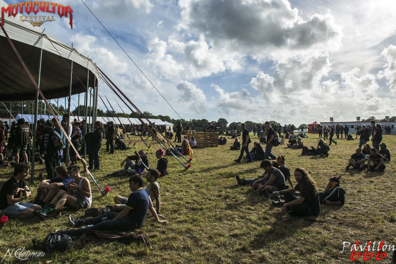 Ce vendredi 19 août, j’arrive sur la commune de Saint Nolff sous une pluie battante. Dans une ambiance trempée et une luminosité quasi nocturne je découvre ce à quoi ressemble le site de Kerboulard cette année : deux chapiteaux - l’un violet et vert, l’autre blanc et rouge - dominent le pré qui accueille le Motocultor pour la quatrième année consécutive. La fouille passée, je m’engouffre sous celui qui accueille la Dave Mustage, la scène principale.