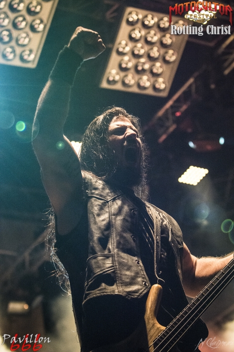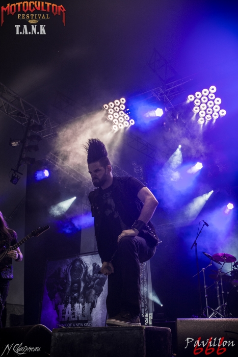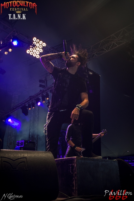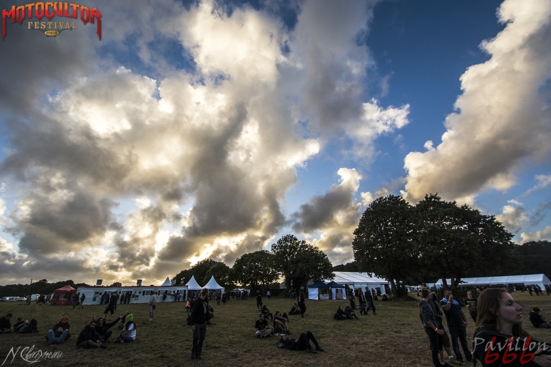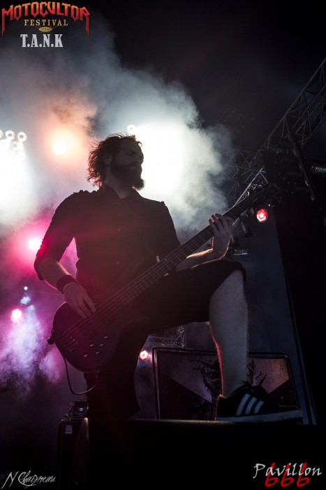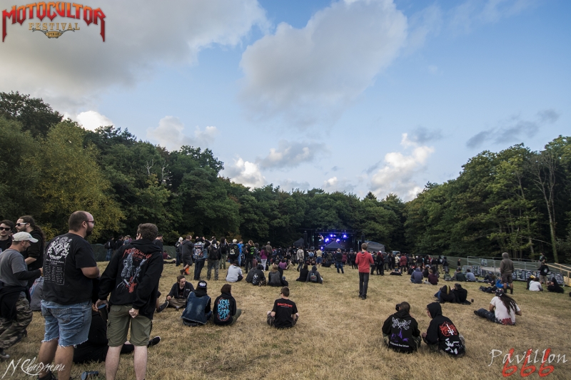 Les Franciliens de T.A.N.K ouvrent le bal cette année. Deux ans après avoir vu leur set écourté par la pluie, ils bénéficient de cette nouvelle installation. Autre effet bénéfique : les festivaliers cherchant à éviter la pluie se mettent à l’abri et pour une fois le festival ne démarre pas face à des rangs clairsemés. Le groupe délivre un set technique et efficace comme à leur habitude. Le son est bon même si la batterie est un peu forte et les gutturaux de Raf passent aussi bien que son chant clair. Comme toujours le public est mis à contribution pour scander les quatre lettres du titre éponyme du groupe. Le festival démarre très bien et on en est ravis ! La pluie étant toujours présente même si elle a baissé d’intensité, je choisis d’aller voir Witchthroat Serpent sous le chapiteau de la Massey Ferguscene plutôt que Furia à l’air libre sur la Suppositor Stage. Les Toulousains effectuent set assez mou et le public trempé n’est pas très enthousiaste. Alors que la pluie s’arrête et qu’on commence à avoir de nouveau l’impression d’être le jour, le site commence à se peupler. Habitués du festival comme nouveaux venus découvrent petit à petit la nouvelle organisation. Le démarrage 100% français du Motocultor 2016 continue avec Moonreich. Le groupe délivre un black metal rapide un peu saturé mais très plaisant. Le flot d’arrivants est au plus dense à ce moment et le chapiteau de la Dave Mustage est quasiment rempli. Pardonnez votre chroniqueur qui ressent le besoin de se sustenter après quelques heures de route puis les photos de trois groupes. Je ne me rends pas aux sets simultanés d’Onslaught sur une Suppositor Stage enfin libérée de la pluie et de Barabbas sur la Massey Ferguscene. Je retourne devant la Dave Mustage voir les vieux routiers de Vulcain. J’ai toujours une admiration pour ces rockers qu’on pourrait penser d’un autre âge mais qui ont une pêche d’enfer sur scène. Les festivaliers sont nombreux et ravis de la prestation de cette quasi tête d’affiche du jour. Personnellement je les comprends : bien que je n’écoute pas forcément Vulcain habituellement, je suis déçu au moment où ils annoncent la fin de leur set. Alors que l’après-midi avance, c’est le tour de GaidjinN de monter sur scène. Les co-vainqueurs du Headbang Contest mettent une claque à tout le monde avec une présence scénique et une prestation dignes de groupes habitués des gros concerts. Le set combine habilement passages hard et mélodiques agrémentés de chœurs. Le chanteur passe impeccablement du chant clair aux gutturaux. Slams et circle pits accueillent les parisiens et c’est un public déchaîné qui les rappelle à la fin de leur set. On voit assez peu souvent de rappels en festival, c’est assez incroyable et beau de voir un jeune groupe acclamé comme ça. Je sors de ce concert extrêmement bien surpris et persuadé d’avoir vu un groupe qui peut aller très loin. La Massey Ferguscene accueille ensuite The Midnight Ghost Train. Une étrange introduction à la fois planante et entraînante tient le public en haleine avant qu’un rouleau compresseur dynamique ne nous fasse sauter sur place. Le chanteur-guitariste danse et grimace comme un enfant avec une joie communicative. C’est un concert qui met de bonne humeur et qui défoule à la fois, un moment festif. Pris par l’interview de GaidjinN, je ne peux assister au concert de Grave mais je rejoins la Suppositor Stage pour voir Gruesome. Le soleil est maintenant vraiment de la partie et c’est un plaisir de pouvoir passer un moment du festival en dehors des chapiteaux. Même face à un public peu nombreux, ils délivrent un death explosif. Je me rapproche de la Massey pour la fin de Khors mais je n’ai pas le temps de les voir. Par contre vu de l’extérieur le public sous le chapiteau semblait en ébullition. On observe un glissement de public d’une scène à l’autre alors que Rotting Christ prend place. L’ambiance général reste péchue mais leur jeu est à mon goût un peu trop mécanique et froid, c’est un son trop « propre » mais qui reste efficace. La nuit est tombée mais le Motocultor reste éveillé. On sent un fourmillement, une hésitation : va-t-on se défouler devant Entombed AD ou rire devant le Naheulband ? Personnellement, je choisis la deuxième solution par coup de cœur et nostalgie de mes années collège. Nous subissons un petit moment d’attente dû à un souci technique et le public appelle le groupe en scandant « Chaussette ! », les fans du Donjon de Naheulbeuk comprendront la référence. Les membres viennent se présenter à nous comme « l’erreur de casting du festival » avec un argument de poids : « on n’a même pas de batterie ! » Faux départ feint : une reprise à la flute du thème de Game of Thrones avant d’enchaîner sur les chansons humoristiques du groupe. Après avoir chanté la bière, la barbarie et autres batailles épiques saugrenues, tout le monde reprend en chœur l’hymne des rôlistes : Mon Ancêtre Gurdil. La parenthèse humoristique du festival se referme dans une ambiance bon enfant. Le changement est rude puisque c’est maintenant Fleshgod Apocalypse qui occupe la scène principale. C’est la deuxième grosse claque du jour à mon goût : aussi bien visuellement que musicalement les Italiens assurent un spectacle de qualité, combinant une esthétique vestimentaire du XIXe siècle et un son lourd et grandiloquent à la fois. On profite du set avec des frissons de plaisir dans le dos. Je saute le passage de Shining (NO) pour reprendre mon souffle et littéralement recharger mes batteries pour pouvoir photographier Children of Bodom. C’est enfin le tour de la tête d’affiche du festival. Tout comme pour le Naheulband mais dans un autre registre je vais me retrouver face à un groupe qui a traversé mes années collège mais que je n’écoute quasiment plus depuis. Heureusement