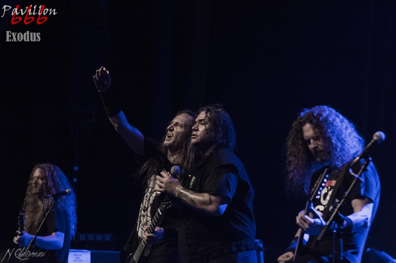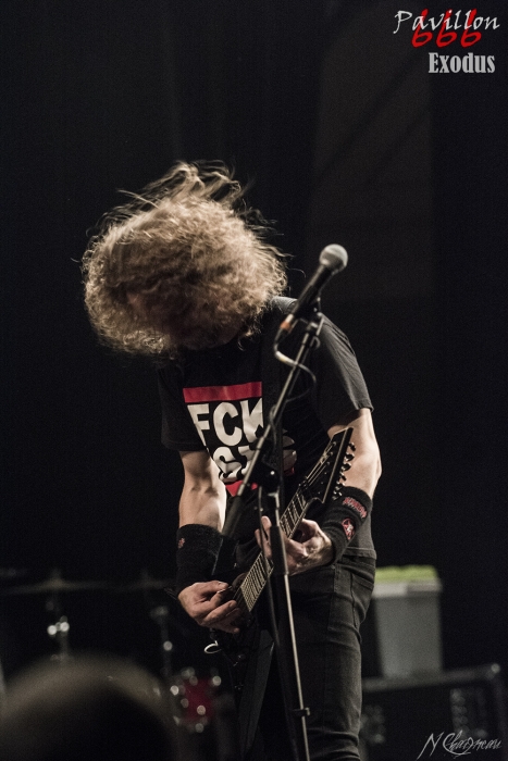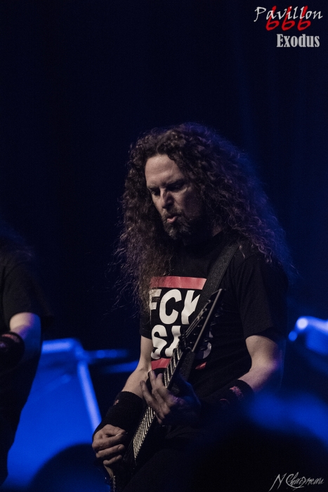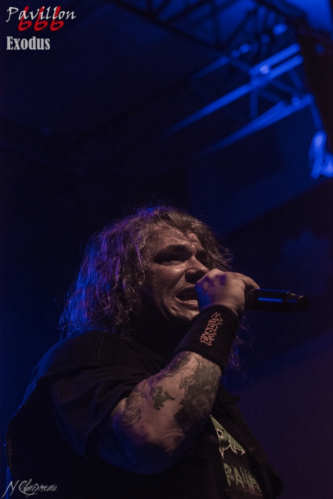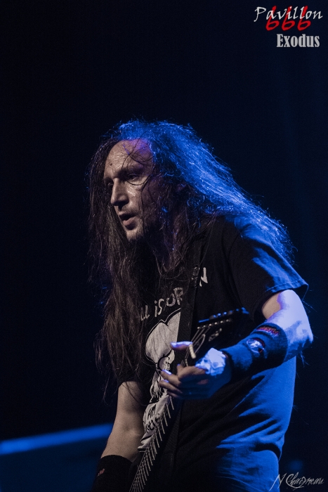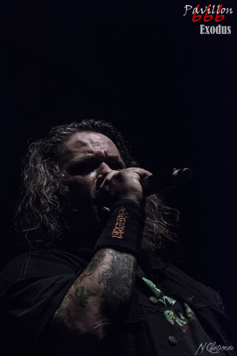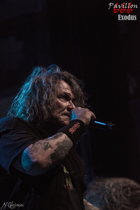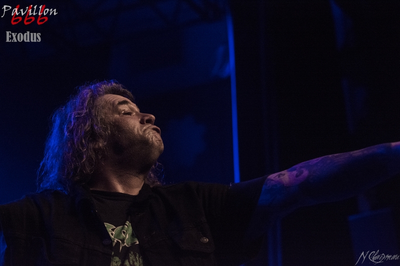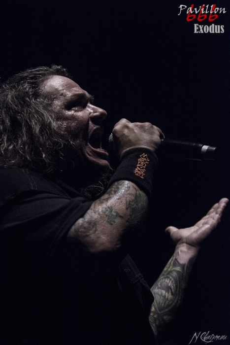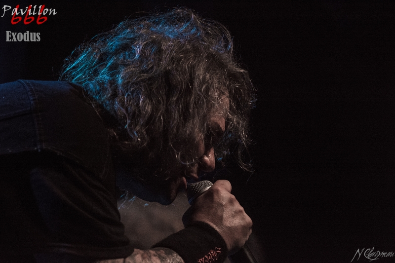 Je n’arrive que pour voir le dernier morceau de Prong devant une salle chaude et enjouée. La bonne humeur est de mise sur scène autant que dans le public. Suite à une courte pause, les poids lourds du Thrash Metal d’EXODUS prennent possession des lieux. N’en déplaise aux groupes précédents, le public est maintenant plus dense et semble plus enclin à s’investir physiquement dans le concert. Quelques pogos démarrent vite, bientôt suivis par un premier circle pit demandé par Steve Souza. Globalement l’ambiance reste sympathique sur scène et malgré le tempo plus que tonique des morceaux les membres rient entre eux et avec le public. Le seul bémol est le son qui paraît un peu brouillon. Les 50 minutes du set passent très et trop vite et laissent une petite sensation d’inachevé. Cette fois la pause est un peu plus longue et l’Elysée Montmartre fourmille légèrement d’impatience. Lorsque les lumières s’éteignent un petit frisson de soulagement parcourt l’assemblée… et les musiciens d’OBITUARY entrent sur scène, bientôt rejoints par le chanteur. Le set démarre sans autre forme de procès et le public s’enflamme de nouveau sur un son meilleur que précédemment. Et décidément ce soir la bonne humeur est de mise ! Devant nous John Tardy et ses compères semblent simplement s’amuser tandis que le public se défoule joyeusement. Cette fois le set dure un peu plus longtemps à notre grand bonheur. Lorsqu’il s’achève on découvre un public exténué mais content de cette longue soirée de quasiment cinq heures, intermèdes compris. Un grand merci pour cette soirée à Frank du label Relapse pour l'accréditation accordée à Pavillon666 et à tout le personnel de l’Elysée Montmartre. |