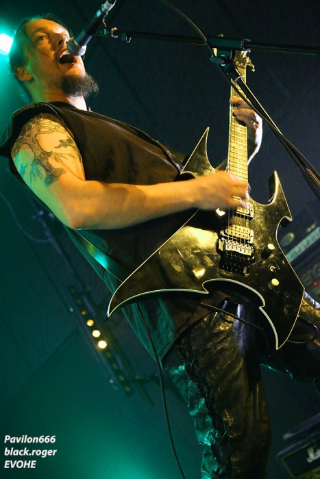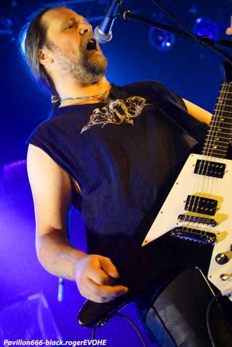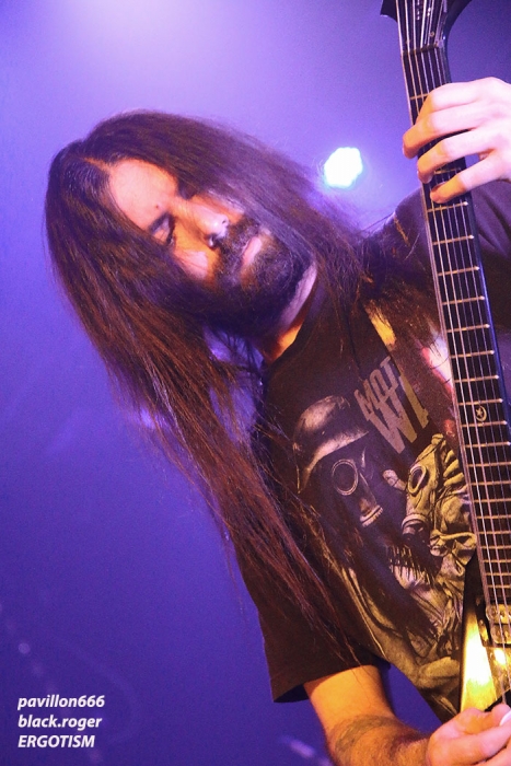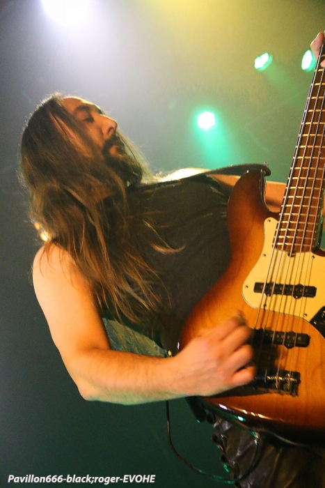 Il est 21 heures au clocher de Belley lorsque ERGOTISM débarque devant nous et envoie le son. Déjà vu à l’Ampérage de Grenoble le 20 Mai dernier, je n’avais pas particulièrement accroché à cette formation de Chambéry. Mais ce soir, leur show m’a touché et j’ai apprécié leur black dans une mouvance pagan, un black émotionnel aux relents mélancoliques. Je ne sais pourquoi mais le chant passe bien mieux (progrès ?) et l’ensemble est plus cohérent sur les compositions de leur opus « notre terre, nos aïeux, notre fils et nos morts » mais pas que. La formation travaille sur un second enregistrement « sang paria » actuellement alors nous sommes curieux de voir la suite rien qu’à écouter de nouveaux titres. En tous cas ce soir ce fut un sans faute sur la belle scène du Reservoir de Belley. S’en suivent leurs compatriotes d’EVOHE. Un EVOHE que j’avais hâte de revoir depuis longtemps. Un, Evohe qui ce soir va assurer un set sans faille avec une présence très remarquée sur scène. Un Evohe fidèle à son black païen qui a atteint l’âge de la mâturité dans une noirceur palpable aux riffs et soli longs, très longs. Et l’on savvoure ce black pur et dur qui a su au fils des ans et des enregistrements se démarquer de ses influences nordiques pour nous offrir des compositions bien personnelles. Au menu, de l’ancien avec « when the winds blow over the aging skins », « through the eyes of the sky » et « drawn in fire », mais aussi du nouveau, avec « tears of ancient » notamment. C’est donc ce que l’on attend aussi, du nouveau et l’on espère donc la sortie d’un prochain enregistrement qui est en cours d’ailleurs et bien avancé selon leurs dires. Et pour en revenir à leur prestation de ce soir, nous avons dégusté comme il se doit leur black intemporel bien exécuté avec un son excellent et des lights enfin à la hauteur (merci pour les photographes en tous cas !) Donc, un Evohe à voir et revoir sans modération, on aime tout simplement, à bientôt donc en live à nouveau. Set-list en photo. Il ne faudra pas longtemps à ceux de SANGDRAGON, pourtant nombreux sur scène, pour s’installer et lancer les samples d’intro pour un show qui s’annonce bien chaud et mouvementé, épique et symphonique aussi. Que dire en fait qui ne soit déjà dit à propos de cette formation Bourguignonne de Mâcon qui nous fait revivre les moments glorieux d’un black/death aux relents occultes et médiévaux avec notamment la réédition en vinyle de leur fameuse trilogie SANGDRAGON, AKHENATON, DEMONIUM ? Nous dirons simplement que voir en live cette entité musicale vous percute inévitablement, nous vivons tout simplement ces titres variés et puissants que ce soit dans des moments speed et arrachés ou que ce soit dans des passages plus épiques avec l’introduction maintenant du fameux « bouzouki », instrument qui a traversé l’époque moyenageuse de l’orient à l’occident. Et puis, que serait Sangdragon sans ses choristes qui contribuent à renforcer un certain climat épique dans une profondeur quasi « religieuse » ? Et puis, que serait Sangdragon sans ses musiciens rôdés à la scène dans des chorégraphies de bon aloi ? Sangdragon vous emmène loin dans le passé actuel avec des passages aux voix arrachées soutenus par le trio guitare, basse, batterie au taquet (nous bénéficierons bien entendu du solo de batterie en cours de parcours) et avec les claviers pour l’ambiance instaurée. Sangdragon constitue donc un tout retraçant fidèlement en live leur épopée et de ce fait nous ne pouvons qu’adhérer à leurs compositions qui inévitablement sont renforcées sur scène par une union sacrée faite de musique et de passion. Comme vous l’aurez compris ce soir Sangdragon a encore une fois rallié de nouveaux membres à sa cause, du moins nous l’espérons. Leur show fut précis, fort et bien enlevé, énorme tout simplement. Cette soirée metal à Belley fut donc remarquable de par la bonne présence des trois formations en lice er de par la qualité du son et des lights de la salle. Merci donc à l’équipe du Reservoir et merci à Metal Circle. Nous n’oublierons pas le public présent et vivant, même si cette affiche aurait dû attirer un peu plus de monde, mais bon les absents ont eu tort, comme bien souvent d’ailleurs, soutenez votre scène locale que diable ! |