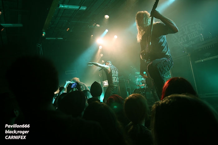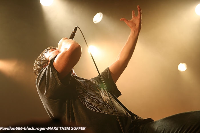 Si l’on pensait qu‘à 17heures trente avec la montée sur scène des Britishes de POLAR il n’y aurait pas grand monde dans la salle, on se trompait lourdement car l’affluence était déjà là avec un public prêt à en découdre illico. La soirée est donc bien partie avec ces Anglais qui tirent les premiers en nous proposant du hardcore mixé avec du rock et du metal, rien que ça ! Le groupe n’est pas un nouveau- né dans la sphère hardcore avec en 7 ans d’existence trois albums dont le dernier « no cure no savior » est sorti cette année 2016 et il faut le défendre en live. Ce groupe semble avoir dépassé les clichés inhérents au post-hardcore avec du son neuf mariant intelligemment les gros riffs, les mélodies et un discours revendicatif de bon aloi. Personnellement je ne m’attendais pas à cela pour un groupe d’ouverture et leur prestation fut l’une des meilleures de la soirée tout simplement. Que dire de la formation suivante MAKE THEM SUFFER qui voit se côtoyer sur scène une claviériste et un guitariste surexcité pour soutenir un chanteur bien agité ? Recherche d’une certaine originalité symphonique dans le monde surpeuplé du deathcore ? Mais les Australiens ne vont pas être gâtés par un son pourri où finalement un piano insidieux prend le dessus sur le reste trop souvent. Peut-être qu’en écoutant leurs albums nous trouverions une originalité bien marquée et étudiée, mais en live… A revoir donc dans de meilleures conditions afin de porter un autre jugement sur leur travail de composition. Les Californiens de FALLUJAH prennent la suite rapidement afin de nous proposer des titres de leur nouvel opus « dreamless » paru cette année, mais pas que. Si leurs envois se révèlent dans un style de violent deathcore, des mélodies vicieuses et planantes nous emmènent plus loin dans une ambiance carrément spatiale et progressive. Des riffs lancinants accrochent nos conduits auditifs c’est certain, mais au bout d’un certain temps le schéma de leurs compositions se veut assez répétitif. Bref, si dès les premiers accords la surprise est là, le soufflé retombe bien vite à la sortie du four de leurs dérives complexes et fouillées. Pas mal, pas mal, mais tout cela gagnerai à être un peu plus « clarifié », voire rentre-dedans aussi. Le « rentre dedans », c’est OBEY THE BRAVE qui va nous le fournir sans compromis, sans faux semblant. Ces Canadiens qui sont relativement jeunes dans le hardcore n’ont sorti que deux albums mais nous mettent à chaque fois la « raclée » sur scène. Déjà vus, je savais à quoi m’en tenir et donc je ne fus pas déçu du voyage comme l’on dit communément. Ici pas de fioriture, leur metal/hardcore est honnête et d’une efficacité à toute épreuve. Nous pensons à Hatebreed par exemple, mais ceux de Montreal apportent leur propre énergie et leur doigté particulier afin de nous proposer un hardcore aux relents punk puissant et rageur. Alors fatalement on aime et l’on en redemande cela va de soi. Mais le combo suivant attend son tour, ce soir ça « déménage » vite au CCO. Le combo suivant n’est autre que CARNIFEX qui nous vient de San-Diego en Californie (encore !). Un Carnifex qui n’est pas nouveau dans la « niche » deathcore avec 11 ans d’existence et six albums au compteur dont le petit dernier de 2016, intitulé « slow death ». Un Carnifex à la discographie changeante de sachant plus trop quel chemin prendre à la longue. Mais un Carnifex qui possède sa « fan-base » même si sur scène cela ne casse pas des « briques » avouons-le. C’est un peu à l’image de son frontman au look « clouté » et du reste du line-up un peu death-metal tout court, plus death que « core » en tous cas. Alors, est-ce du death moderne, est-ce du lard ou du cochon ? Un peu des deux visiblement, mais en ce qui me concerne les ayant déjà vus à plusieurs reprises je n’accroche toujours pas à 100% à leurs prestations live. Par contre le public s’en donne à cœur joie et les circles-pit sont légion, tant mieux ! Les Australiens de THY ART OF MURDER figurent dans cette affiche death/core/metalcore mais en fait, ils font du death-metal tout simplement même si par endroits un peu de « core » pointe le bout de sa casquette. Alors le groupe fait ce qu’il sait faire, du death point barre avec un chanteur à la voix d’outre- tombe qui résonne dans la sono. Bref Thy Art Of Murder ne révolutionne rien dans le style mais s’écoute bien et met la salle en feu même si sur scène, titre après titre, tout se ressemble bien trop. Mais l’ambiance est là, et au final on leur en demandait pas plus !* WITE CHAPEL était très attendu ce soir au CCO c’est évident, surtout après la sortie de « mark of the blade » leur dernier enregistrement, en cette année 2016. Ce groupe, Américain est très prolifique en terme d’enregistrements avec 6 albums sortis en 10 ans. Mais en live nous étions impatients de voir ce que cela allait donner pour leur première date à Lyon. White Chapel va mette tout le monde d’accord ce soir avec une énergie débordante, avec peut-être moins d’agressivité qu’au départ dans ses compositions, mais avec un groove imparable qui n’est pas occulté par des parties bien techniques acquises au fil des ans par la formation. Ici nous pouvons parler de certains envois et riffs lorgnant vers la polyrythmie, vers le « djent » actuel. Et ça marche, ce grand groupe de deathcore US nous a prouvé qu’il tenait le « haut du pavé » actuellement dans le genre et le nombreux public présent ce soir a dégusté dans tous les sens du terme, excellent ! Cette date Lyonnaise de l’Impericon Never Say Die Tour fut donc un succès, en terme d’ambiance, mais aussi en terme de musicalité avec 7 groupes en lice qui ont tout donné ce soir. Belle réussite encore une fois pour ceux de Sounds Like Hell Productions qui possèdent un certain « doigt