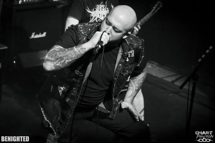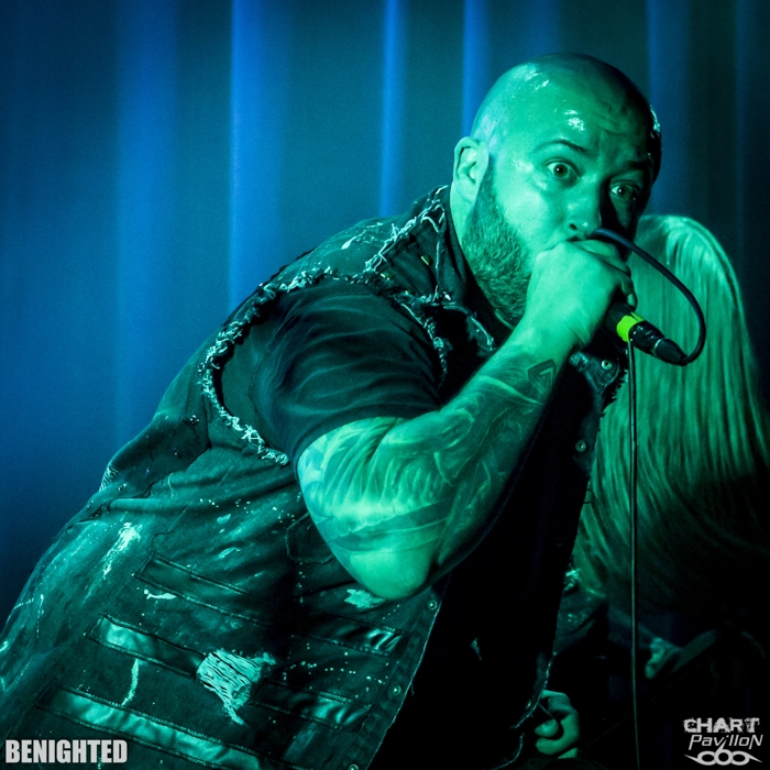 Les enfants terribles du metal français sont de retour sur leurs terres et ce pour notre plus grand plaisir ! Qui aurait cru il y a près de 20 ans quand ce groupe s'est formé dans son lycée qu'un jour il irait tourner jusqu 'en Russie ? Qui aurait cru aussi que la brutalité de BENIGHTED ne le condamne pas à rester dans les caves des bars et les scènes les plus underground comme la plupart des groupes de grind ? C'est vrai quoi, la musique de ce groupe est loin d'être des plus simples à écouter et pourtant ça fonctionne parfaitement avec le public ! Et bien, il y a une chose qu'on ne pourra jamais enlever à ce groupe, c'est sa décontraction et sa prestance. Si tout est fait dans la bonne humeur sans se faire passer pour ce qu'on n'est pas, cela devient forcément communicatif avec le public. Il y a quelque chose qui se dégage de ce groupe qui n'existe que chez ce groupe. Et même si les membres changent, que le line up évolue, l'ambiance et l'énergie qui en ressortent restent les mêmes. Certes le départ d'Olivier à la guitare au profit de Fabien ne peut laisser ceux qui suivent le groupe depuis longtemps indifférent. Mais il faut reconnaître que l'intégration de Fabien semble totalement naturelle. Même si ce musicien avait déjà fait un passage dans le groupe, on a l'impression que sa place est totalement naturelle. Et tout cela prend forme avec une set list équilibrée entre nouveauté et morceaux plus anciens. « Necrobreed » trouve aisément sa place avec des titres tels que « Reptilian », « Versipellis » ou encore « Necrobreed ». On n'oublie pas non plus les incontournables « Let The Blood Spill Between My Broken Teeth », « Carnivore Sublime », « Slut », « X2Y » et « Experience Your Flesh ». On retrouve aussi du plus ancien et notamment « Stay Brutal » que l'on n'avait pas entendu depuis un bon moment. La baffe est monumentale ! Le groupe est en pleine forme et irradie tout autours de lui. On peut avoir des sujets totalement tordus dans ses paroles et ses concepts et communiquer à son public une énergie positive considérable !!!