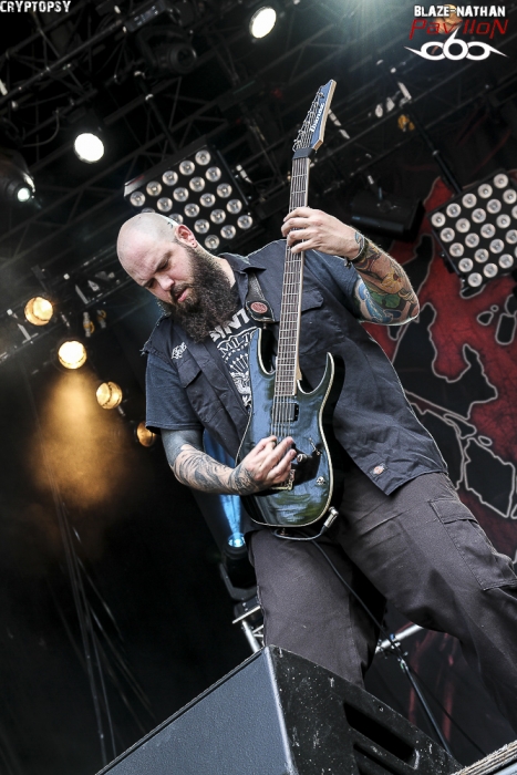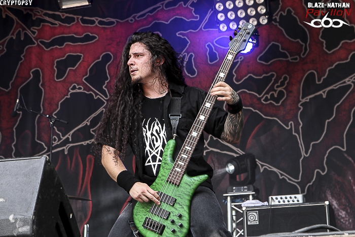 APPLY FOR A SHORE A 11 heures trente l’apéritif sera offert par les Lyonnais de APPLY FOR A SHORE. Au menu de metalcore encore qui semble plaire à l’assistance déjà réveillée et sorti des tentes du camping ; Quant à moi… BOTTLE NEXT Mine de rien le duo appelé BOTTLE NEXT à 12 heures trente va surprendre le public de par une certaine fraicheur, une certaine musicalité hors-norme et une tenue de scène convaincante. Pierre à la guitare et au saxo et Martn à la batterie vont nous subjuguer avec leur « hard-folk » qu’ils disent, mais aussi par des dérives rock-blues originales en diable. Difficile de leur coller une étiquette et d’ailleurs pourquoi leur en donner une. La batterie est phénoménale dans des parties groovy et le chanteur/guitariste à la voix éraillée se fait plaisir avec un incroyable doigté sur sa guitare électro-acoustique. Belle découverte qui a fait l’unanimité du public présent, voici un set qui va marquer la journée d’une empreinte magique et indélébile. MARS RED SKY Attention à vos oreilles, les basses vibrent avec les Bordelais de MARS RED SKY et leur « psychédélic stoner rock pachydermique » d’anthologie . Ce concert fut en quelque sorte situé hors du temps, vous rentrez dans l’univers du groupe et vous n’en sortez que 40 minutes plus tard avec cette musique initiatique et oh combien spatiale tout simplement. Rien à ajouter ce fut bon. CRYPTOPSY Inutile d’ôter vos bouchons d’oreille car maintenant le death va imposer sa loi avec les Canadiens de CRYPTOPSY et ce fus ce que l’on appelle communément une « tuerie » durant 40 petites minutes, prestation trop courte à mon goût Ceux de Montreal au Quebec que je n’avais pas vus en live depuis quelques années déjà m’ont littéralement collé au plafond avec une set-list incroyablement pêchue. Matt le frontman « growler » est toujours sur la brèche et invective le public qui lui n’en peut plus devant les « crash-barrières », prend-t-il le temps de respirer ? La musique de Cryptopsy ne montre pas une technique ennuyeuse pourtant en fond d’écran, mais se laisse apprécier car toujours groovy en quelque sorte. Et cet après-midi à St-Maurice-de-Gourdans nous avons dégusté dans tous les sens du terme avec un show qui sera le meilleur de la journée en ce qui me concerne. HEIDEVOLK Place au pagan-folk metal maintenant avec HEIDEVOLK plus précisément. Les bataves vont s’en donner à cœur joie sur la scène du Sylak afin d’instaurer une ambiance festive, et ça marche évidemment. Malgré des importants changements de line-up, Heidevolk continue de nous régaler de metal païen avec un sens inné de la mélodie et une puissance souvent guerrière qui font la différence. Heidevolk reste donc l’un des piliers du style et l’a prouvé encore une fois ce vendredi après-midi. CALIBAN Les vétérans du metalcore teuton CALIBAN se présentent à 17 heures sur scène et vont donner un set en demi-teinte selon moi. Bien entendu les fans de la première heure attendaient leur prestation avec une certaine impatience et ne furent pas déçus je pense. De mon côté je n’ai pas apprécié leur côté mélancolique, leurs insistances en voix claires, leurs mélodies nous renvoyant à un certain metalcore classique dirons-nous. Caliban peut mieux faire, alors à suivre évidemment. SUFFOCATION Retour à la brutalité, retour au death-metal avec les métalleux extrêmes légendaires de Long-Island, New-York, SUFFOCATION. Les « ricains » du metal-de-la-mort-qui-tue sont venus avec sous leur bras leur dernier « méfait » intitulé « …of the dark light » (2017) qui fait suite à l’incroyable « pinnacle of bedlam » paru 4 ans plus tôt. Côté line-up il y a eu du renouvellement, un apport de sang frais et cela n’a pas altéré la musique des pionniers New-Yorkais, au contraire. Alors ils vont nous offrir un set de toute beauté dans le genre, riffs de malades mentaux, blast incontrôlés dans la puissance, le reste étant au diapason. Inutile de vous dire qu’en 45 minutes la messe des morts fut dite avec brio, incroyable ! THE CHRIS SLADE TIMELINE A 19heures trente nous avons droit à une prestation curieuse du batteur d’AC/DC Chris SLADE avec ses acolytes, prestation faite de bric et de broc. Bien entendu Chris Slade batteur légendaire impose sa puissance derrière les fûts. N’oublions pas qu’il a été batteur de Tom Jones en 1963, puis de Manfred Mann, Uriah Heep, Gary Moore, etc… Avant d’être de retour dans AC/DC depuis 2015 après avoir sévit chez les Australiens entre 1989 et 1994. Alors ce soir au Sylak il se fait plaisir avec ses amis musiciens en reprenant des titres qui ont marqué sa carrière. Sympathique cette prestation qui n’est pas pour autant exceptionnelle, une tranche de vie en quelque sorte, on aime ou on aime pas à vous de choisir. METAL CHURCH Le heavy-metal des légendaires Américains METAL CHURCH semble faire toujours recette depuis les 80’s. Bon, la valse des chanteurs a marqué le groupe durant leur carrière et Mike How est revenu au micro après une dérive dans d’autres formations et sa voix criarde est toute différente de celle de Ronny Monroe par exemple, Ronny qui avait posé son chant entre 2003 et 2014 dans ce groupe. Autant vous le dire tout suite, la voix de Mike How me gène, mais le reste de la formation envoie du bon à l’aide de parties rapides et mélodiques très accrocheuses. Les inconditionnels du groupe ont apprécié la prestation et c’est tant mieux, ils le méritent. VENOM INC VENOM s’est séparé en proposant maintenant deux Venoms, le VENOM de Cronos chanteur/bassiste originel et le VENOM INC de ses acolytes Abaddon et Mantas. Ce soir nous aurons droit à la prestation de VENOM INC avec au chant un certain « Tony the demolition man ». Inutile de se voiler la face le nom de Venom est légendaire et sa démarche sulfureuse n’est plus à prouver avec des titr