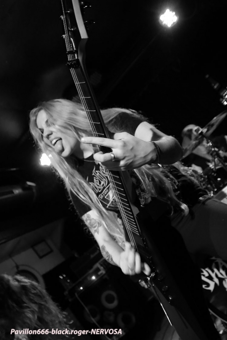 Ce sont nos amis Annéciens de SHAYTAN qui ont la lourde tâche d’ouvrir ce petit bal du Dimanche soir. Certes, il y a encore peu de monde devant la scène à 19 heures trente, le soleil brille encore sur la terrasse du quai du Rhône cqfd. Mais le public aura bien tort car Shaytan va nous offrir un set redoutable d’efficacité ce soir ; les titres « the, agony jail », mournefoul journey », « shaytan » et « strange voices » font leur œuvre maléfique dans une veine thrash/death qui ne fait pas de cadeau. Excellente prestation donc dans une Marquise qui se remplit peu à peu. Les Romains de REAPTER prennent la suite et les cinq membres du groupe occupent tout l’espace de la petite scène, poussez-vous ! Ces transalpins qui ont déjà deux albums à leur actif et possèdent une bonne expérience de la scène nous font goûter à leur thrash à tendance progressive teinté de heavy. En effet le jeu des guitares nous ramène quelquefois au heavy des 80’s mais tout celà est bien vite rattrapé par une déviance thrash qui tranche dans le vif sur des rythmiques plombées à souhait. Bref Reapter a su convaincre ce soir un public venu ici pour en découdre, il ne fut pas déçu du voyage au final. La salle, pardon le navire est maintenant bien rempli afin d’accueillir, comme il se doit le trio féminin Brésilien NERVOSA qui n’est pas venu nous présenter la dernière mode des plages de Copacabana ou Ipanema à Rio de Janeiro, mais nous prendre à la gorge à l’aide d’un thrash furieux et sans compromis, venant tout droit de Säo Paulo. Leur thrash-metal que l’on peut qualifier de « old’school » se différencie de celui des « maitres » du style par une énergie, une rage peu commune et communicative en live. Rajoutez à cela un côté presque malsain et vous obtenez un metal imparable et d’une efficacité incroyable. Ce trio de brésiliennes sur-vitaminées ne peut que vous faire « danser » et « sauter » de partout. Comme ce soir dans la Marquise où ça volait de toutes parts, garez-vous ! Au final personne n’a pu résister aux vociférations variées de Fernanda ni aux tricotages inspirés de Prika, et ce fut donc un set d’une heure de temps où tout le monde s’est éclaté dans tous les sens du terme, coup de cœur obligatoire ! Bien belle soirée passée sur le Rhône à Lyon, nous n’en attendions pas moins avec cette affiche alléchante. Merci aux organisateurs, à ceux de la péniche et aux musiciens ayant tout donne en live, on recommence quand ? |