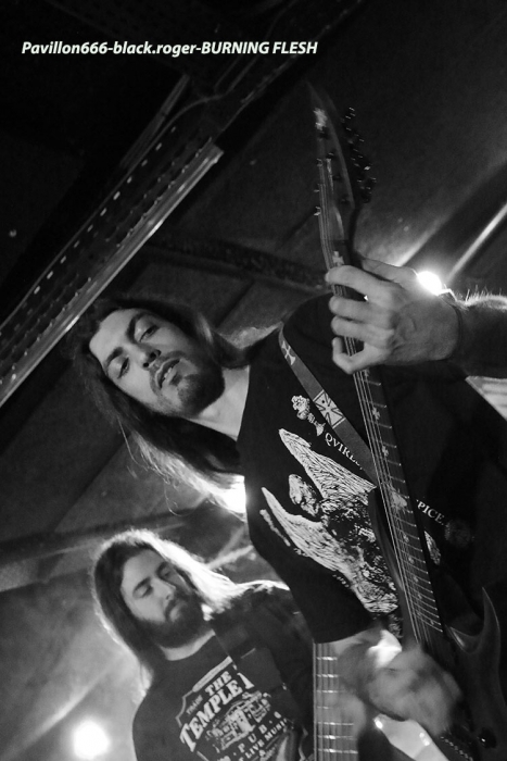 Ce soir, Burning Flesh va pousser le public dans ses derniers retranchements à l’aide de black/death flirtant avec le grindcore, de l’extrême de chez extrême pour faire simple. Et au fil des titres le groupe fait « core » avec l’assistance, une assistance chaude bouillante qui apprécie hautement les boulets rougis qu’il reçoit en pleine « poire », ambiance !