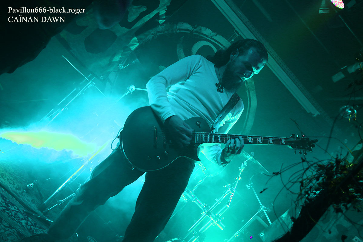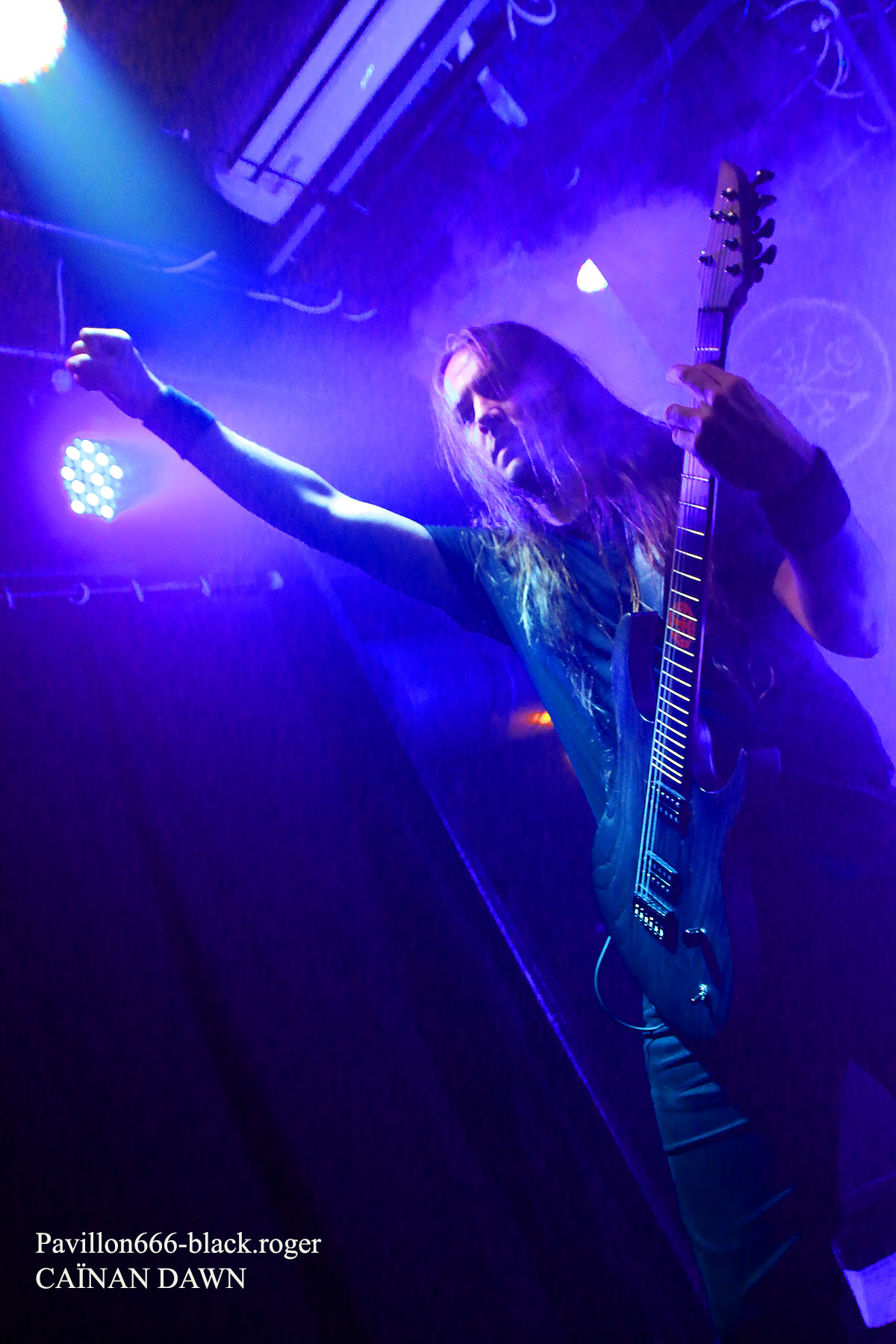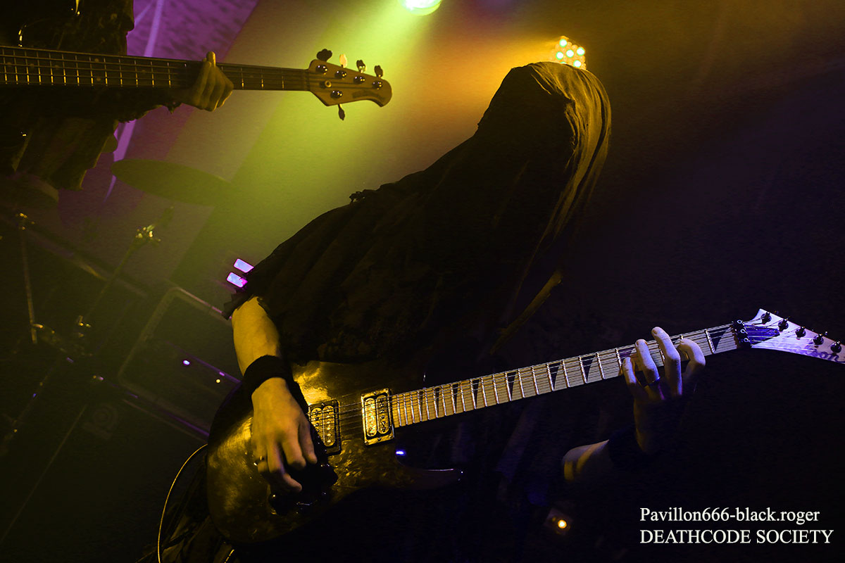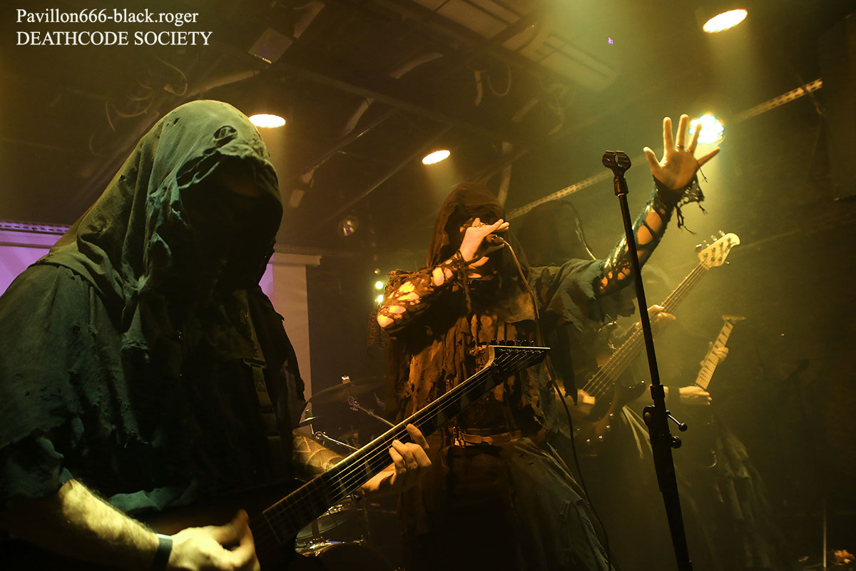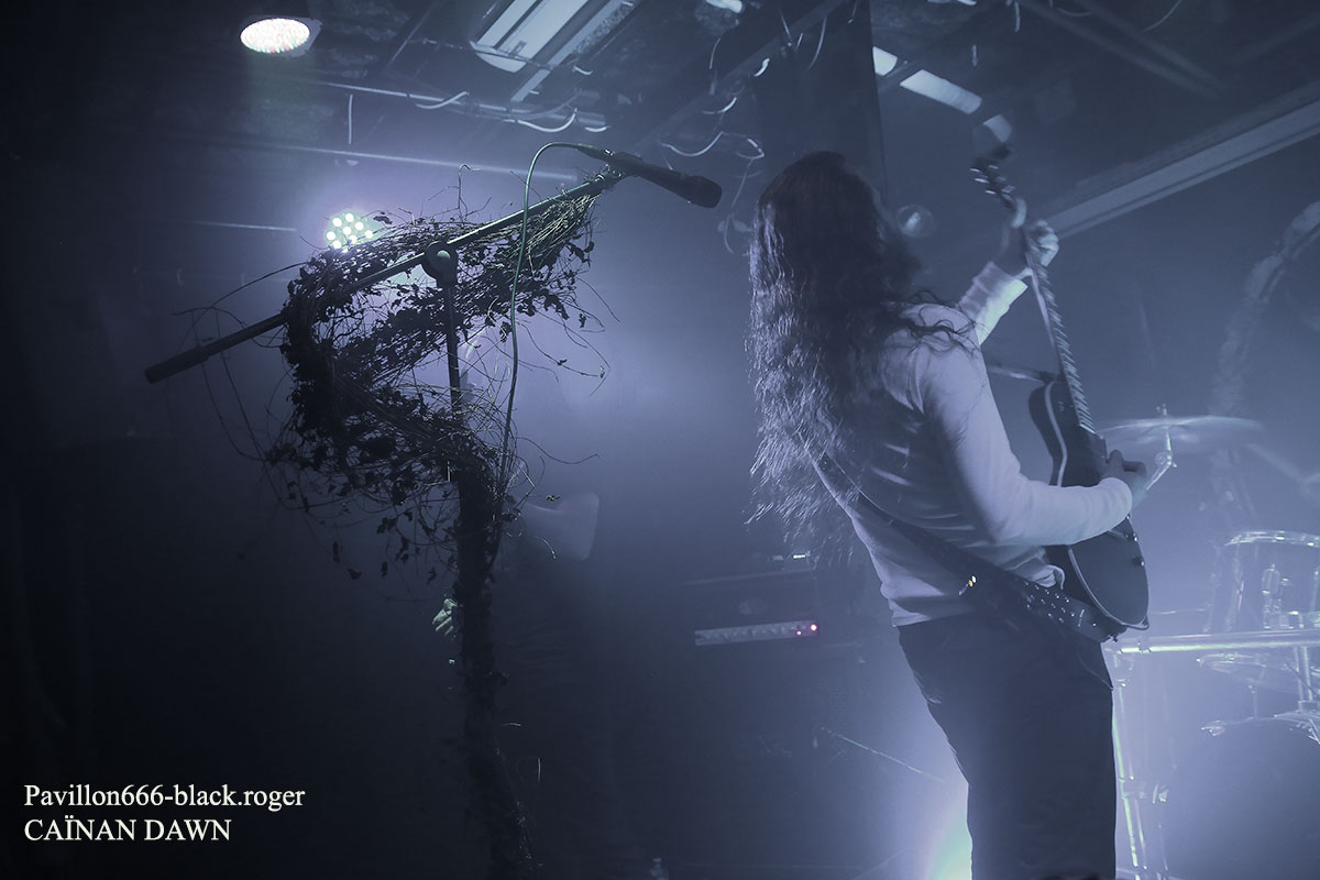 Dès le début de leur set, ceux de DEATHCODE SOCIETY nous offrent en fond d’écran des images de leur guitariste Franz disparu, le 11 mars dernier, moment intense donc, hommage tout simplement. Et puis le combo Savoyad occupe la scène, musiciens encapuchonnés, masqués et en haillons pour une cérémonie de black symphonique, mais surtout pour des envois tout simplement apocalyptiques. Arnhwald mène la danse « macabre » et ses frères de noirceur jouent de façon précise sans faux plis. Alors défilent dans les lumières blafardes les titres de leur album live de 2018, « The armageddon carnival », enregistré à Annecy le 27 Avril 2017. Ces titres qui nous ont interpellés le 21 Septembre dernier au CCO de Lyon-Villeurbanne où cette horde maléfique se produisait en ouverture de Batushka souvenez-vous ! La scène plus petite du Brin de Zinc permet d’être d’une certaine manière en « communion » avec les 5 musiciens, c’est ce qui fait la force d’une prestation en petite salle, avec une ambiance brûlante, rouge et noire à la fois. Deathcode Society, groupe encore jeune, peut se vanter dorénavant d’être connu et reconnu cela va de soi témoin ce nouveau concert donné dans leur Sabaudia natale. Set-list-en photo. Quel plaisir de retrouver maintenant EVOHE et son pagan black-metal, un Evohé qui se fait rare en live (dernier concert donné au Réservoir de Belley en 2016). Du coup des « vétérans » du black savoyard n’en seront que plus appréciés dans cette affiche de la nuit des Morts. Bientôt vingt années que cette formation navigue sur les eaux troubles d’un black-metal païen et qui nous avait offert des enregistrements remarqués dans le style. Les vocaux, parfois criés, sont puissants, variés, pour des envois « riffus » à souhait se rapprochant parfois d’un rock sauvage, puis se déclinant en mélodies d’un autre âge avec parfois cette touche de guitare acoustique. Ce quatuor n’a pas enregistré énormément d’albums, mais la qualité compense largement la quantité comme l’on dit communément, alors ne boudons pas ce moment privilégié de voir ces précurseurs du black savoyard qui nous font partager leur quête d’un metal sombre et magique non dénué d’une certaine violence sous-jacente. Bref, merci Evohé à une autre fois, c’est quand vous voulez ! Set-list en photo. Du pagan à l’occulte, il n’y a qu’un pas que nous franchissons allègrement avec la venue de ceux de CAÏNAN DAWN encore tout auréolés de leur prestation donnée l’été dernier au Hellfest. Ces Chambériens, après dix ans d’activité et la sortie d’une démo « in darkness I reign » et trois albums, « nibiru » (2011, « thavenial » (2014) et enfin « F.O.H.A.T) » (2017), sortent enfin d’un certain anonymat dans la scène black-metal. Cela est sûrement dû au dernier album dont les compositions, résultat d’un travail acharné, ont fait éclater au grand jour les possibilités de cette horde Savoyarde et par là même leur a ouvert des portes Cqfd. Bref, quel est le secret de Caïnan Dawn ? C’est d’avoir je pense donné en quelque sorte ses lettres de noblesse à un certain mysticisme, à une certaine déviance occulte qui subtilement par le biais d’ambiances somptueuses et variées s’incruste dans votre matière grise avec un effet hypnotisant. Alors on ne voit pas le temps passer et la petite heure de set qui leur fut allouée ce soir vous a laissé perplexe, ce temps passé trop vite, et c’est fini on sort d’une certaine torpeur intense qui nous a subjugué, incroyable ! Set-list en photo Comme réussite, il n’y a pas mieux je pense. Une soirée bien organisée, une ambiance des grands soirs dans un brin de Zinc complet, trois hordes sombres et maléfiques pour vous prendre l’esprit, que demande de plus ? Alors merci aux organisateurs et merci eu Brin de Zinc pour l’accueil toujours aussi sympathique ! |