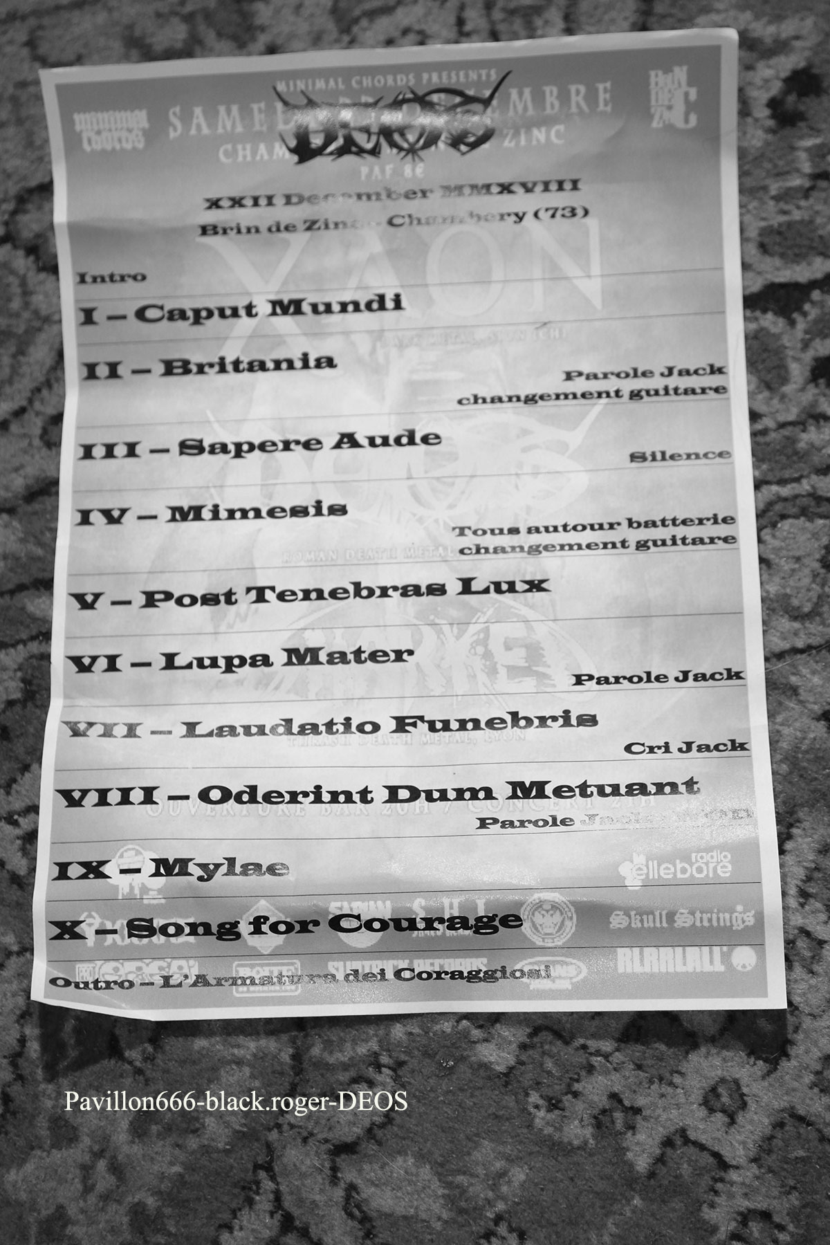 Alors, nous qui croyions passer une soirée tranquille au pied du sapin installé sur le bar des lieux, nous avons été rappelés grave devant la scène avec l’arrivée de ceux de SHARKED emmenés par l’abbé S.M. revêtu d’un t-shirt de Marduk où l’on pouvait lire au dos « fuck me jesus », le ton était donc donné pour du brutal thrash-death-black et plus si affinité. Bon, la surprise des premiers titres passée le public a commencé à se déchaîner dans tous les sens du terme, gare-vous ! Comme vous l’avez compris ici on ne fait pas dans la dentelle, le son est bon, les lights aussi. Les musiciens sont bons également et le frontman mène la danse avec un certain charisme et une agitation bien étudiée qui ne laisse personne de marbre. Et ça fait mal, très mal (mais on aime ça on est maso que voulerz-vous !). Alors, de « genocide » à « liberticide » en passant par « infanticide », tyranicide » et « not dead enough », nous en avons pris plein la g…le je ne vous fait pas un dessin. Bref, le set de Sharked a laissé des traces, musicales et visuelles, on aime ! Set-list en photo. Et puis, les légions Romaines ont envahi le Brin de Zinc avec DEOS, formation Annécienne de black/death inspirée par l’histoire et les faits d’armes de la Rome antique. Plus épique, moins « rentre dedans » (quoique), ce groupe nous invite à participer brutalement à l’aventure des armées transalpines à l’aide de compositions extraites de leurs deux albums, « ghosts of the empire » (2015) et « in nomine romae » (2017. Le féroce Jad Graved et sa horde de loups élevés par la louve romaine nous font entrer de plain-pied dans cette épopée, une épopée déjà tentée par Ex-Deo (groupe Canadien avec le chanteur de Kataklysm). Alors pourquoi pas, et sous la houlette SPQR nos Annéciens se fraient un chemin à marches forcées comme le faisaient les légions de l’époque. Cette époque revisitée avec passion à l’aide d’un metal extrême qui enfonce le clou puissamment et avec conviction. Alors on adhère à leur démarche bien ficelée entre mélodies prenantes et riffs assassins sur des compositions qui nous racontent entre autre le côté belliqueux de leurs guerres (caput mundi, song for courage) mais pas que. Deos nous a donc conquit ce soir avec un savoir-faire indéniable nous faisant voyager dans un passé mouvementé à l’aide d’envois bien sentis, merci légionnaires ! Set-list en photo Après avoir tourné en Europe, aux Etats-Unis et au Japon, XAON revient nous voir en Savoie et nous offre son dark metal incroyablement complexe fait d’agressivité, de noirceur, de lamentations, le tout sur une base puissante et extrême Alors attention, dès que le frontman Rob Carson monte sur scène, c’est fini, vous n’avez plus d’échappatoire et vous aller déguster des compositions alambiquées certes, mais « direct un your face ». Le public déjà bien « chaud-bouillant » qui s’est remué sur les prestations des deux groupes précédents va partir au quart de tour et envoyer même un photographe au tapis de la scène, c’était incroyable ! Bon, il fallait s’y attendre car Rob n’Roll en frontman charismatique ne monte pas sur scène pour enfiler des perles mais pour nous prendre à la gorge à l’aide des compositions de leur album « the drift » (2017), mais pas que ! les musiciens sont au top niveau et assurent comme des bêtes c’est sans appel. Alors oui, du death-metal mélodique construit sur des atmosphères pénétrantes et sur des parties lourdes de conséquences et qui effleure le metal dit « moderne » on veut bien, surtout quand c’est Xaon qui nous le sers en plat principal, aargh ! Set tout bonnement excellent, mélodique, noir et surtout musclé, il n’en fallait pas plus pour animer cette incroyable soirée au Brin de Zinc. Que dire de plus en fait ? Rien, ou du moins si, remercions les organisateurs, les musiciens, le BDZ pour l’accueil, et le public pour l’ambiance de « ouf » installée dans la sueur et la bonne humeur. |