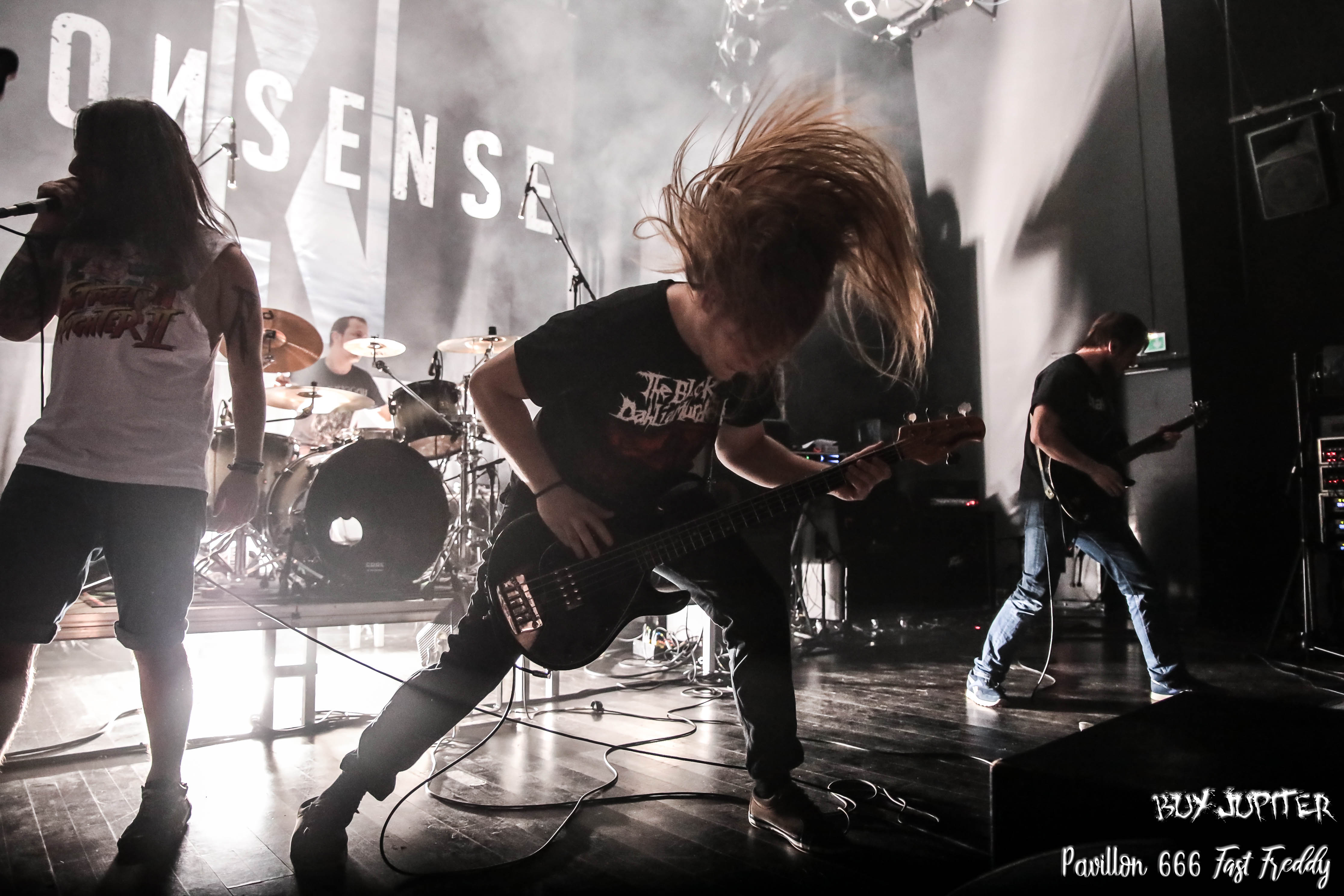 Né au début des années 2010 sous l’impulsion de Seb (guitare), NONSENSE a déjà un bon p’tit bout d’route à son actif ! Après avoir joué à deux reprises en ouverture de TEXTURES (2014-2016) et partagé la scène du SYLAK (2016), les lyonnais ont pris le temps d’enregistrer un premier EP « On earth » (2016) auquel succèdera l’opus « Away from Black Days » qui sort ce jour et qui est le prétexte de la fiesta du jour ! A son arrivée sur scène, le quintet lyonnais est chaleureusement ovationné par une foule acquise à la cause et qui est plongée dans le « Coma » titre du premier morceau ! « The urge », morceau phare de dernier EP et qui a fait l’objet d’un clip, suit dans la foulée et pousse déjà l’ambiance au sommet ! Les compos ont de quoi donné le tournis aux adeptes des morceaux plutôt linéaires ou convenus ! Ici, les portées musicales sont loin d’être droites ! Les changements de rythme sont foisons et la voix d’Olivier, tout en maitrise, balaie large, des hurlements agressifs de circonstance à des parties claires et chantées qui font échos à des passages plutôt prog tout en technique ou des moments bien Djent mis en valeur par un chaos rythmique puissant… Influences multiples obligent ! Les yeux brillants et le sourire sur le visage des membres du groupe au fur et à mesure que le live déroule traduisent à la fois la joie qui est la leur de pouvoir faire partager de la sorte leurs nouveaux morceaux mais également la satisfaction de voir le public totalement en osmose avec eux… Olivier va d’ailleurs y aller de son bain de foule ! « Redeeming light » et « Inertia » nous amènent déjà vers la fin du set avec toujours la même ferveur et la même sueur qui se dégagent de la scène… et de la fosse ! « Black Days » vient porter l’estocade au grand dam de tous, tant la fête fut réussie !