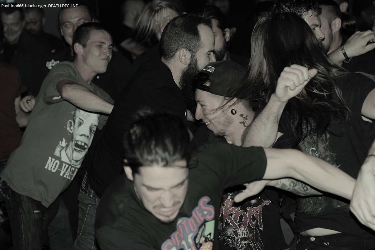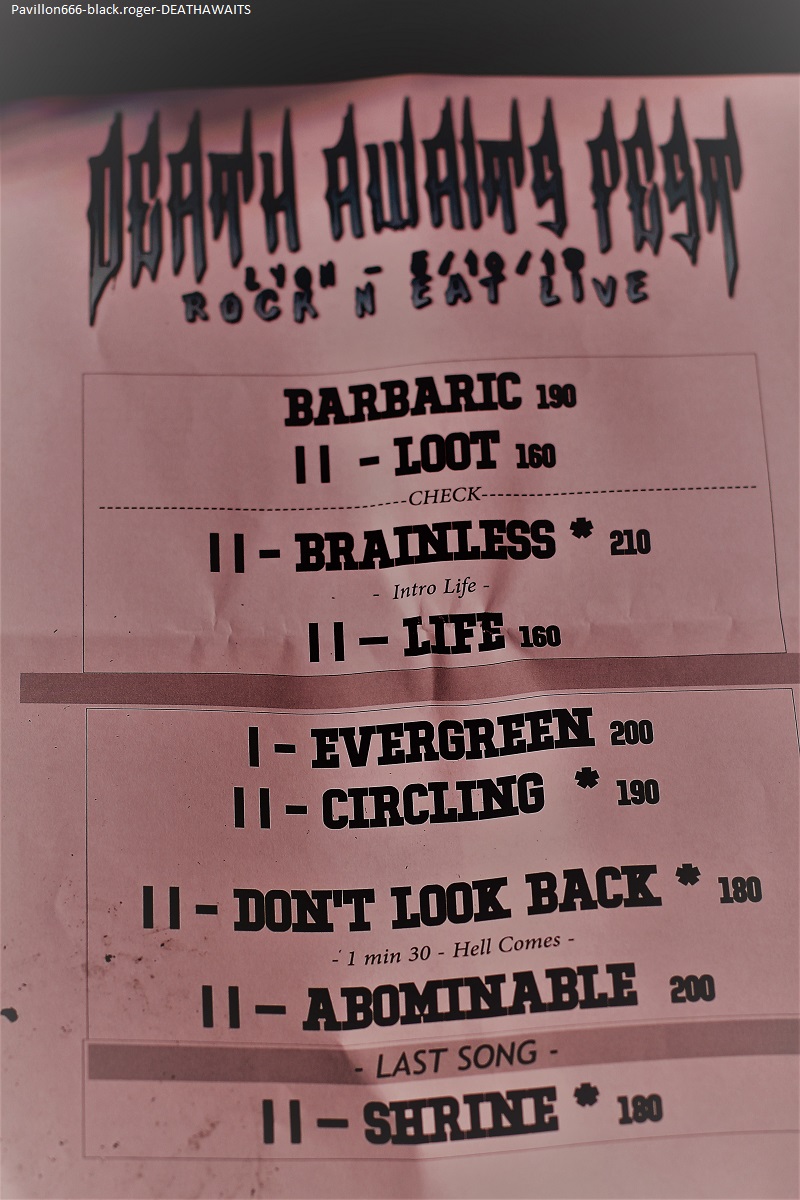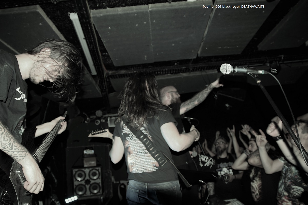 Afin de remplir jusqu’à la gueule notre cher Rock n’Eat de Lyon il suffit de faire la fête le Samedi soir avec cinq formations frenchies (et Suisse) de metal qui arrache rassemblées sous le vocable DEATHAWAITS FEST. Début des hostilités à 19heures, c’est tôt, mais le public a répondu présent quand même. Et, à peine le temps d’avaler une bonne pizza maison (overkill ndlr) qu’il faut se présenter devant la scène pour apprécier les tireurs d’élites PRISMERIA qui seront suivis par les Bourguignons de DEATH DECLINE, les franco/suisses (pas les flans !) XAON et les franco/espagnols (ollé) d’IMPUREZA pour terminer avec les héros de la soirée DEATHAWAITS.
