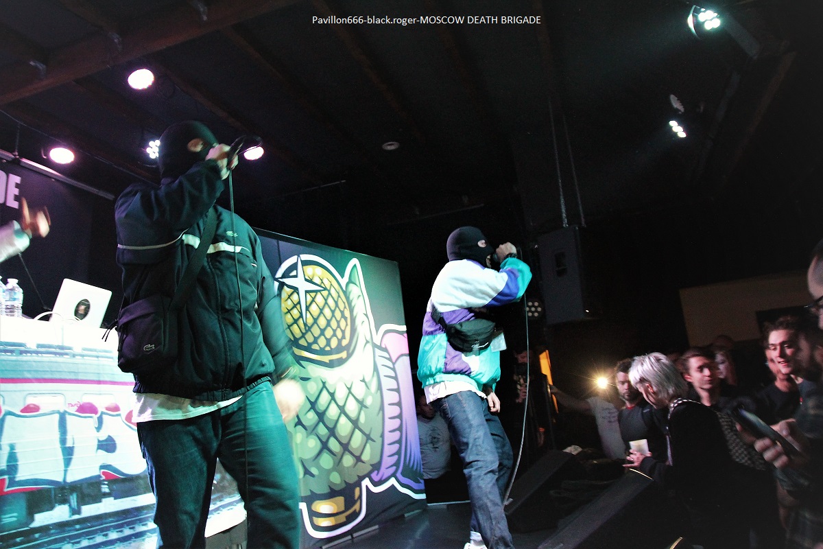 Bon, alors le ton hardcore est donné par les locaux de SHITSTORM, quatuor formé par des rescapés de combos lyonnais réunis par le old-school qui arrache, qui décape, qui fout la « merde » quoi ! Le niveau est bon on s’en doute avec ces vieux renards naviguant sur les eaux troubles du punk sans complexe, du hardcore en rut et fleurant bon l’odeur (shit) du thrash en fusion et non pas en confusion. Bref, ça envoie sans compromis, sans fausses notes (ah bon) et sans faux semblant, idéal pour ouvrir cette soirée fumante qui promet d’être chaude dans tous les sens du terme. Merci les gars vous revenez quand vous voulez ! Le père Noël est déjà passé au Warmaudio et a donné en coulisse de bien beaux bonnets aux membres de EIGHT SINS qui ne sont pas venus ici ce soir pour rigoler (si, un peu quand même !), mais pour nous coller contre les murs du Warm’ à l’aide de brûlots thrashcore évidemment. On ne présente plus ce quatuor légendaire (si, si !) qui depuis plus de 10 ans et trois albums sous leurs petits bras défraient la chronique après leurs passages dans les salles régionales et même plus loin (Hellfest), où ils répandent la « terror » influencés par notamment Madball, vous voyez ce que je veux dire ? Non, et bien allez dans leurs concerts comme celui de, ce soir ou ces musicos sont en forme, et Loïc en bon père « no hell » d’un soir s’amuse avec le public (qui a dit comme d’habitude ?). Mais rassure-vous il « aboie » toujours aussi fort et les riffs guitaristiques sont toujours meurtriers soutenus par une rythmique en béton armé. Mais que vois-je tout d’un coup, un second père Noël qui vient pousser la chansonnette en duo (ou duel) sur un titre afin de varier les plaisirs en live ! C’est la fête, ambiance ! Bon Eight Sins n’a pas déçu ce soir car la surprise est souvent de mise avec cette formation qui sait toujours mener la danse, celle du hardcore cqfd, alors on aime tout simplement. Changement de décor sur scène avec la venue tant attendue de MOSCOW DEATH BRIGADE, des « crocodiles » de Moscou qui ont la langue bien pendue pour dénoncer, se rebeller sur un ton agressif avec en arrière-plan des machines, des synthés afin de soutenir les propos de nos Moscovites en cagoules dans une mouvance anarchiste tout simplement. Bien qu’en activité depuis plus de dix années notamment dans le « street art » la formation n’a délivré qu’un véritable album intitulé « bolt cutter », traduisez des pinces coupantes afin de couper les barbelés existantes entre notamment les « chapelles » musicales du punk, du rap, du hardcore, de la techno, de l‘électro ou autres démarches subversives issues de la rue. Leurs clips sont parlants, les textes enregistrés aussi, mais c’est surtout en live que Moscow Death Brigade fait sa « fiesta » et c’est donc la « fiesta » ce soir dans un Warmaudio en mouvements perpétuels, en stage-diving, en sueur, en chaleur (sic), en pogos, en circle-pit, en ce que vous voulez quoi, ce soir c’est la liberté d’expression. C’est le défoulement de tout un public concerné et motivé reprenant les refrains distillés et ce fus tout simplement énorme, la « quecla dans la chetron » en langage « street punk/verlan ». Résultat, coup de cœur indiscutable de la part de votre chroniqueur de Pavillon666, amen ! Merci à tous, organisateurs, artistes, musiciens, Warmaudio et à toi public qui a en quelque sorte transcendé cette soirée hors du temps et de l’espace. |