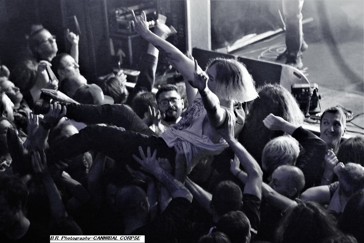 Jeune de par sa création en 2019 STORMRULER, mais composé de musiciens ayant déjà fait leurs preuves dans différentes formations, Ceux de St-Louis, Missouri aux states se présentent à nous bardés de clous.Ils ont sorti l'album « Sacred Rites & Black Magick » fin 2022 et ce soir nous profitons en ouverture du concert de leur black lourd et épique aux atmosphères inquiétantes soutenues par des riffs ébouriffants. Groupe prometteur donc alors « wait and see ». En tous cas ce soir ils furent appréciés et bien remarqués. Du black au death, plutôt deathcore brutal des British d'INGESTED il n'y a qu'un pas que l 'on franchit allègrement sans pour autant grimper sur les « crash-barrières » de retour au Kao pour l'occasion. Avec déjà 6 albums sous leurs bras, ceux de Manchester ont déjà de la « bouteille » comme l'on dit dans ces cas là dans le style, si style il y a bien entendu. Ingested est fidèle à sa réputation et nous écrase les neurones dès le départ. Avec leur dernier album en date « Ashes lie Still » ils nous ont prouvé que leur slam-death était toujours d'actualité et ce soir dans le Kao de Lyon leurs rythmiques agressives et violentes n'ont pas failli, aargh ! Retour au black maintenant avec les Suédois de DARK FUNERAL, groupe formé en 1993 et ayant réalisé 7 albums dont « We Are the Apocalypse » paru en 2022 et objet de leur tournée actuelle. Ce soir j'ai apprécié leur nouveau vocaliste en la personne de Heljarmadr (depuis 2014 quand même) qui a remplacé le cultissime Emperor Magus Caligula (ayant quitté le groupe en 2010). Mais cela ne modifie en rien la démarche de cette horde nordique légendaire. Après un passage plus lent et plus lourd remarqué dans le précédent album nos Suèdois en sont revenus à des ambiances plus malsaines, voire plus glauques et brutales représentant leur « fond de commerce » depuis leurs débuts. Alors ce soir ce fus glacial et brutal de chez brutal, comme l'on aime à retrouver chez eux et leur set fus redoutable de noirceur apocalyptique (sic), amen ! Pas facile en ce qui me concerne de vous parler de CANNIBAL CORPSE, enfin si vous voulez je vais m'y aventurer dopé que je suis par leur prestation de ce soir à Lyon. Alors, que dire, vous dire que depuis 35 années ces « ricains » nous ont brutalisé, démembré, éviscéré dans tous les sens avec leur brutal deth-gore dégoulinant de sang, de viande froide et autre joyeusetés morbides. Et ce soir ce fus la même, la même boucherie en direct dans un Ninkasi prêt à éclater avec peut-être de la cervelle contre les murs, qui sait ? Inutile de vous préciser que maintenant plusieurs de leurs albums sont devenus cultes dans le metal extrême Et leur dernier « méfait » en date « Violence Unimagined », bien que plus calme ne détourne en rien leur efficacité charcutière , même en live ! Les titres inoubliables comme « Scourge of Iron », Evisceration Plague » et « The Time to Kill Now » ont ouvert le petit bal du Samedi soir, suivi par des joyeusetés du nouvel opus et des anciens titres de leur (très) longue discographie. Inutile de vous dire que le public a retourné la salle dans un chaos indescriptible, et ce fus saignant, aargh (bis) ! Encore une soirée bien agitée à Lyon dont on se souviendra encore longtemps, alors remercions Sound Like Hell Productions pour son « a propos » et remercions également le Ninkasi pour son accueil, amen (bis repetita) ! |